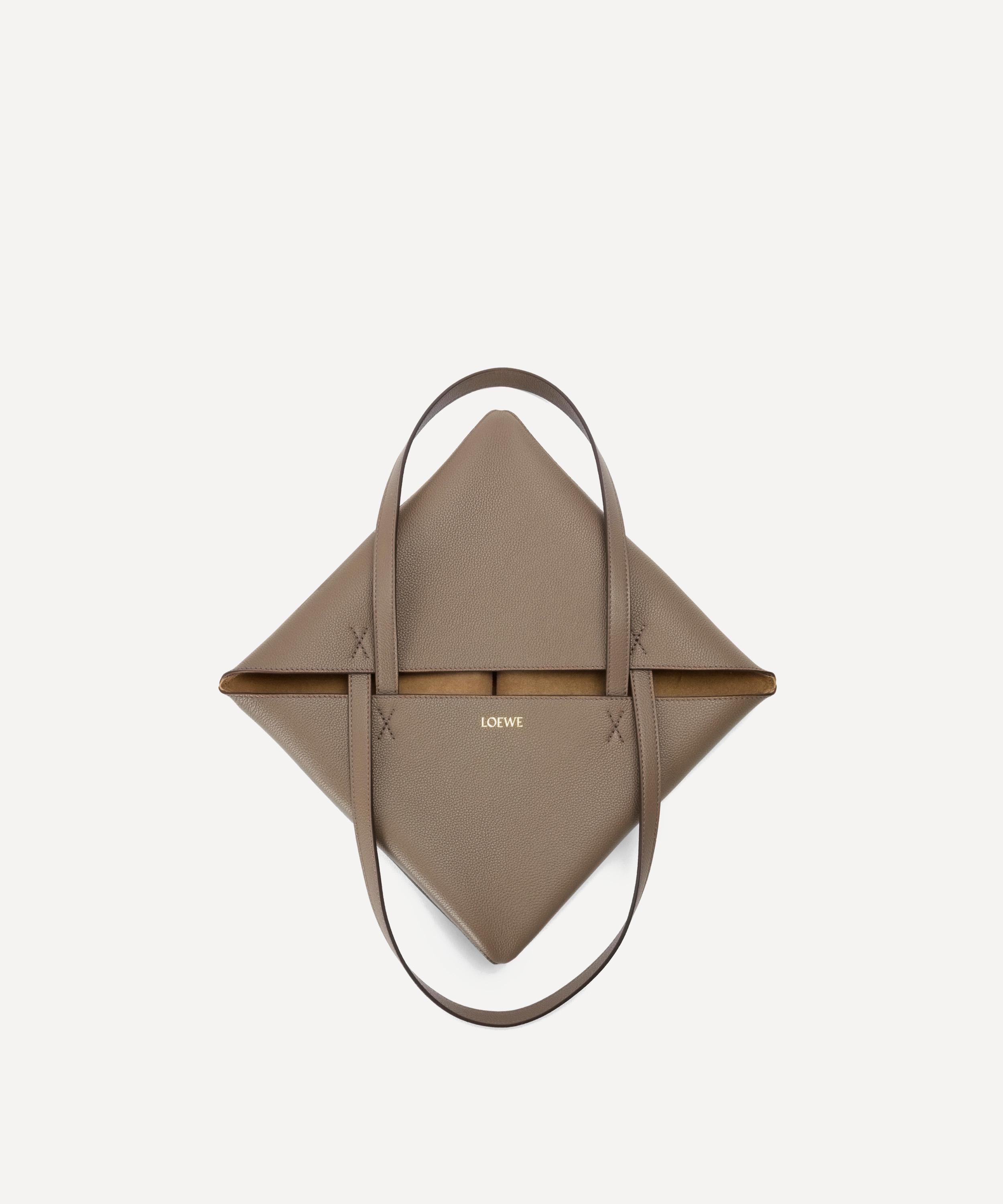 Cut from soft grained calfskin leather, it’s characterised by a medium-sized tote that fold completely due to its geometric panel design. The bag is accented with suede lining and an embossed LOEWE logo in gold foil. Complete with two top handles, it can be worn over the shoulder or carried by hand.