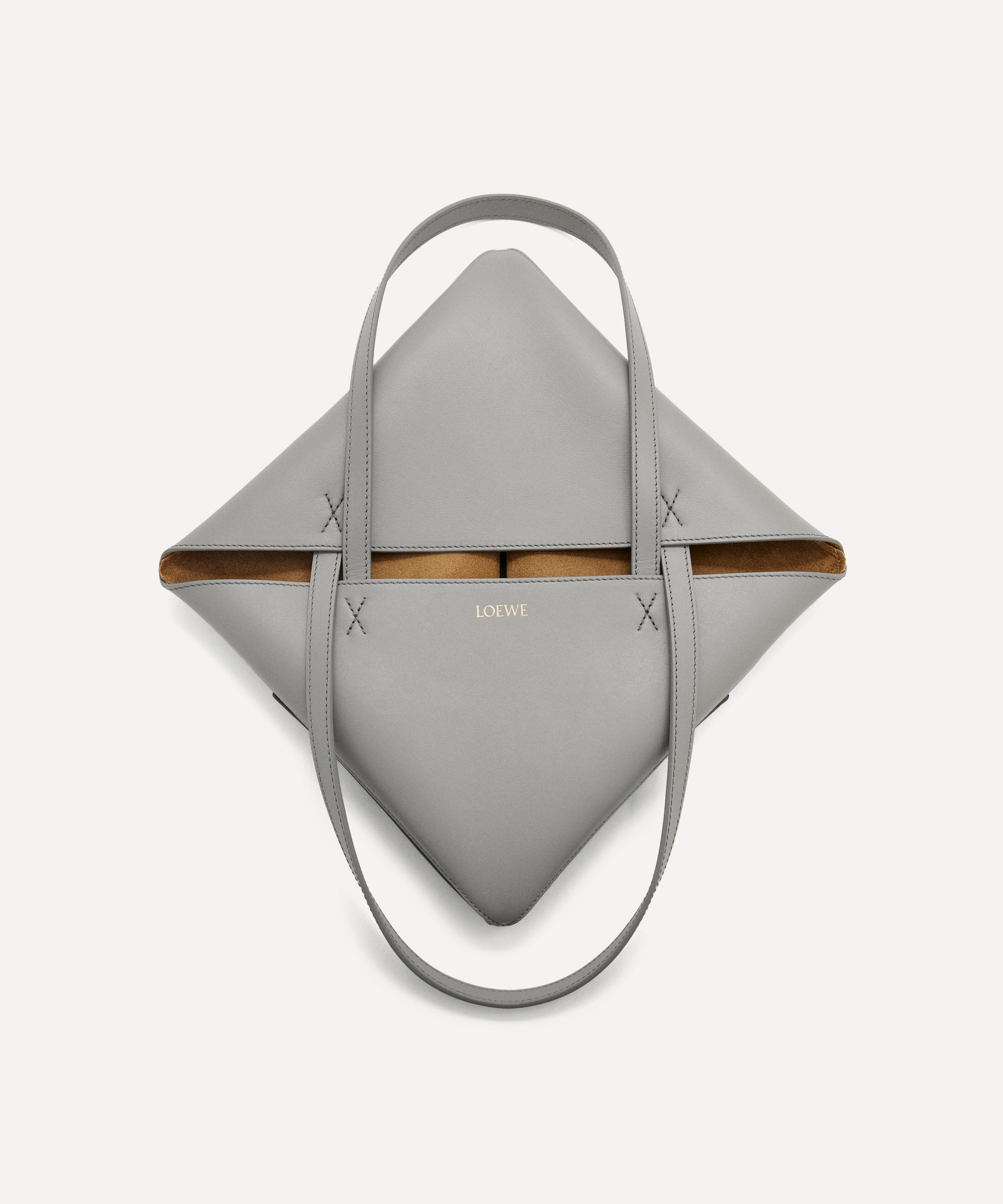 Cut from smooth calfskin leather, it’s characterised by a medium-sized tote that fold completely due to its geometric panel design. The bag is accented with a suede lining and a gold-embossed Loewe logo. Complete with two top handles, it can be worn over the shoulder or carried by hand.