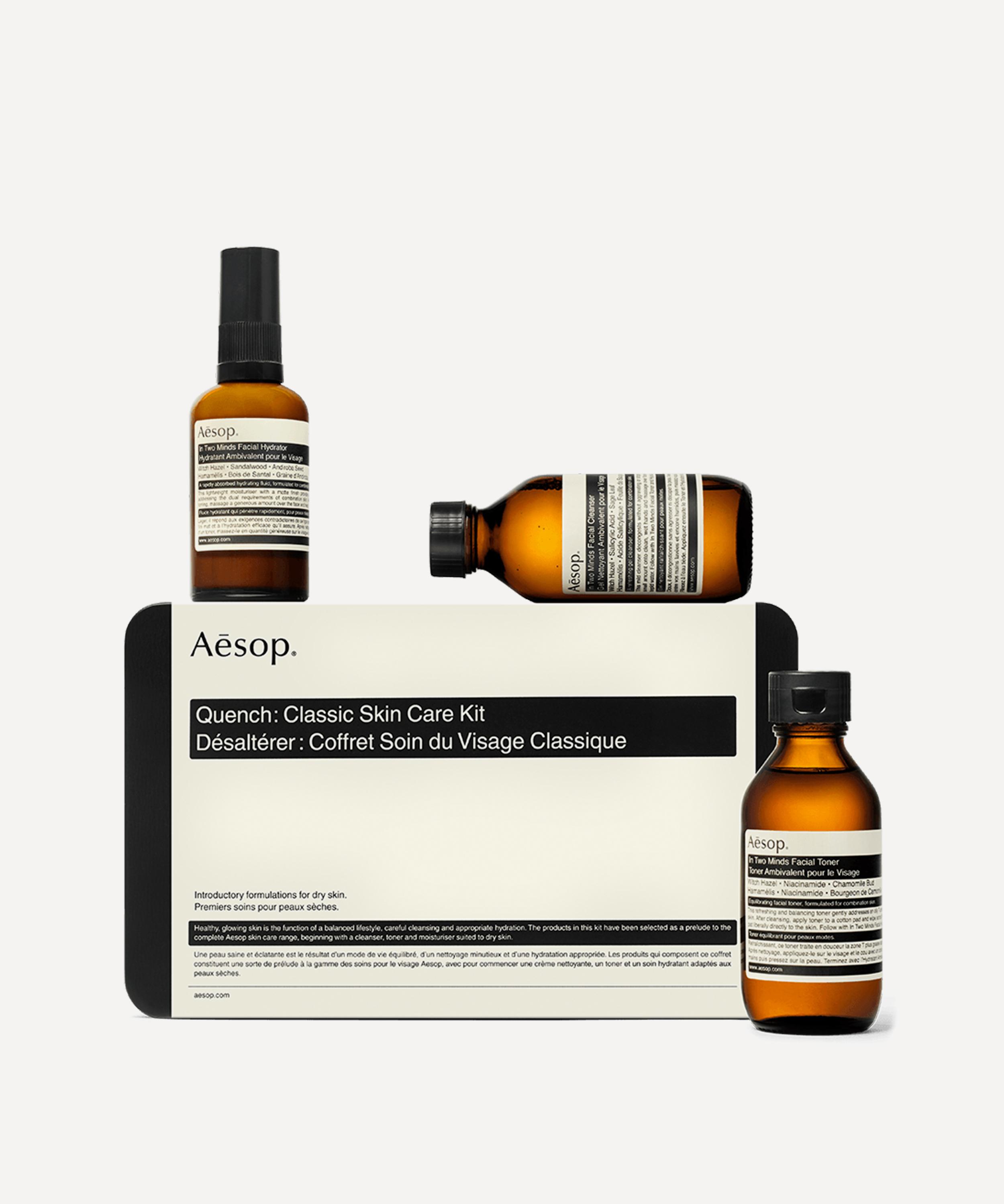 A gentle introduction to skin maintenence for dry skin, Quench: Classic Skin Care Kit from Aesop features a simple three-step hydration routine comprising cleanser, toner and moisturiser.