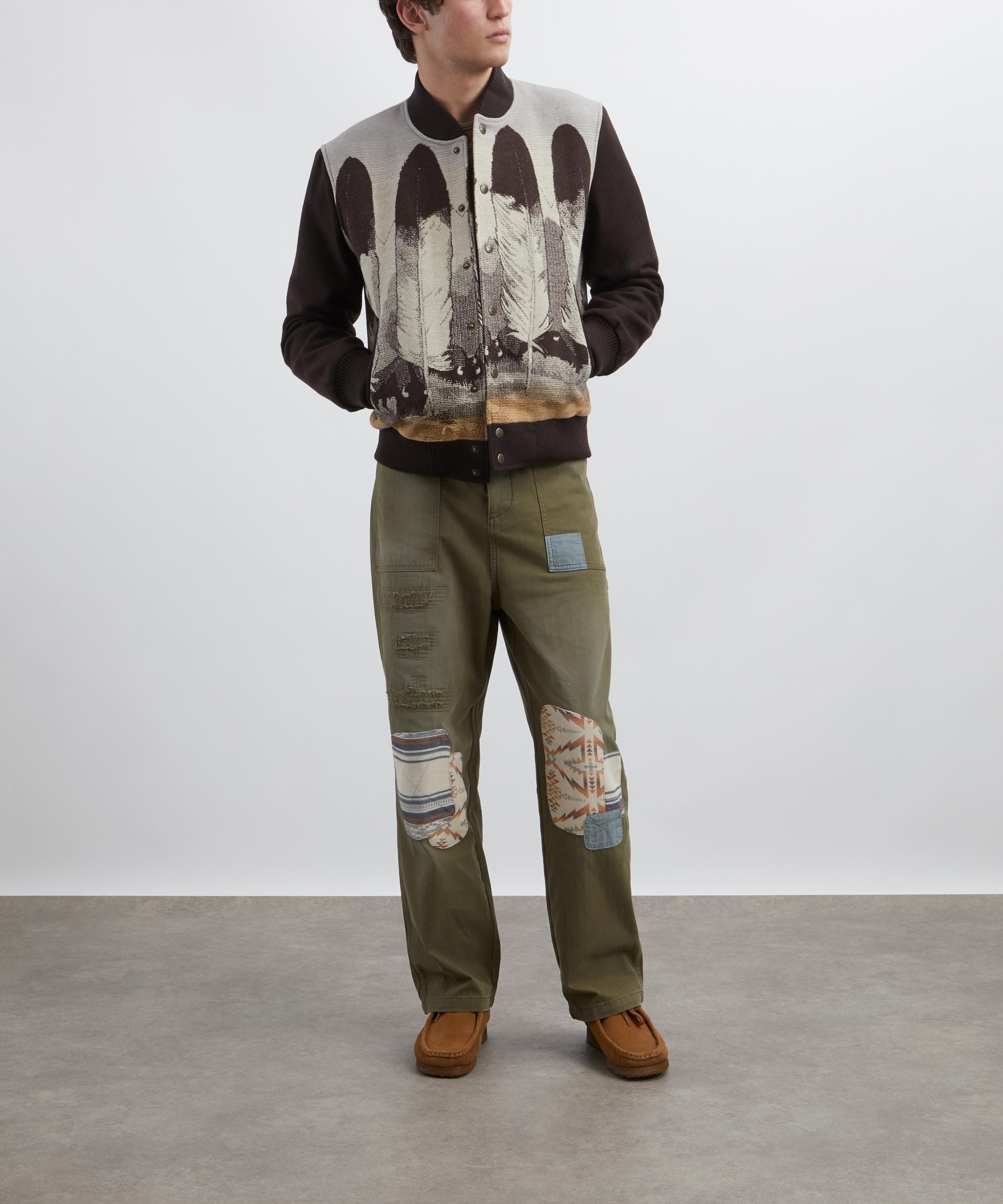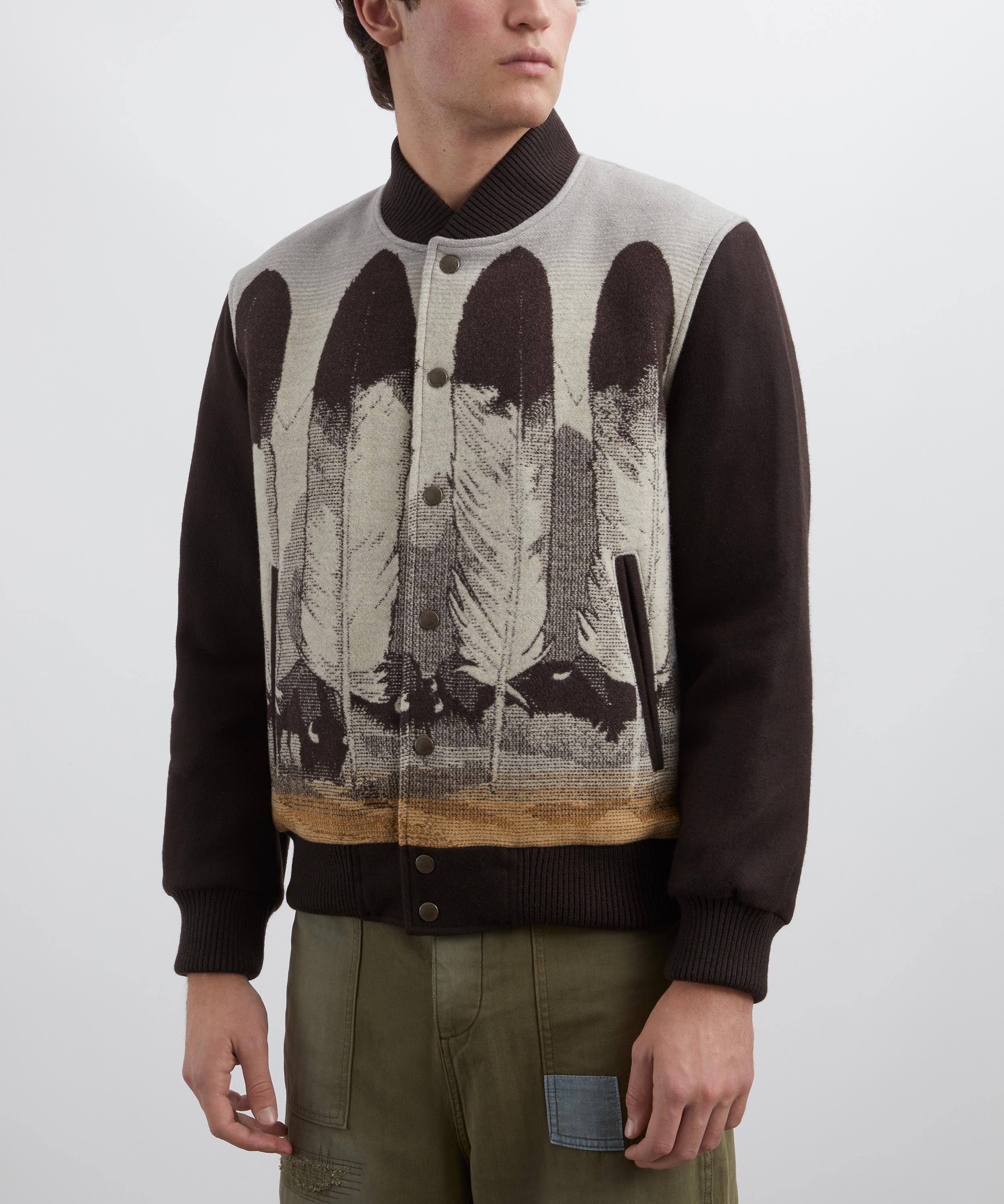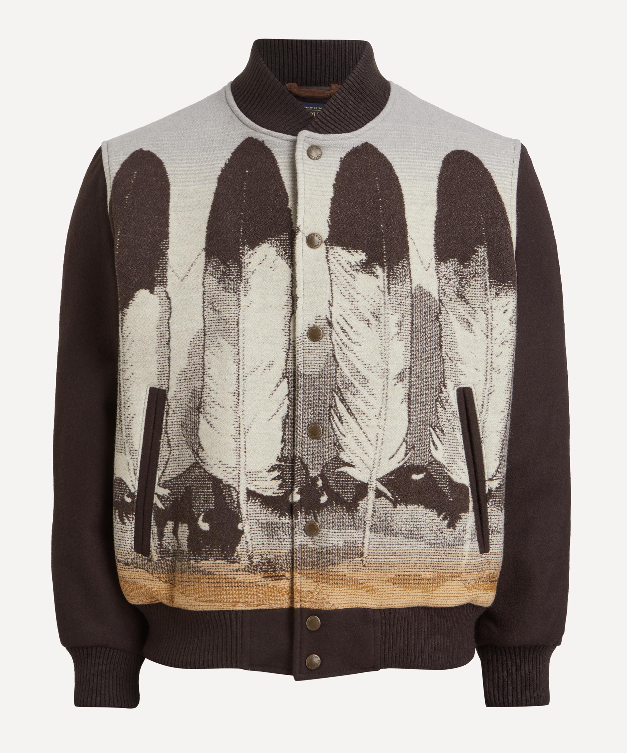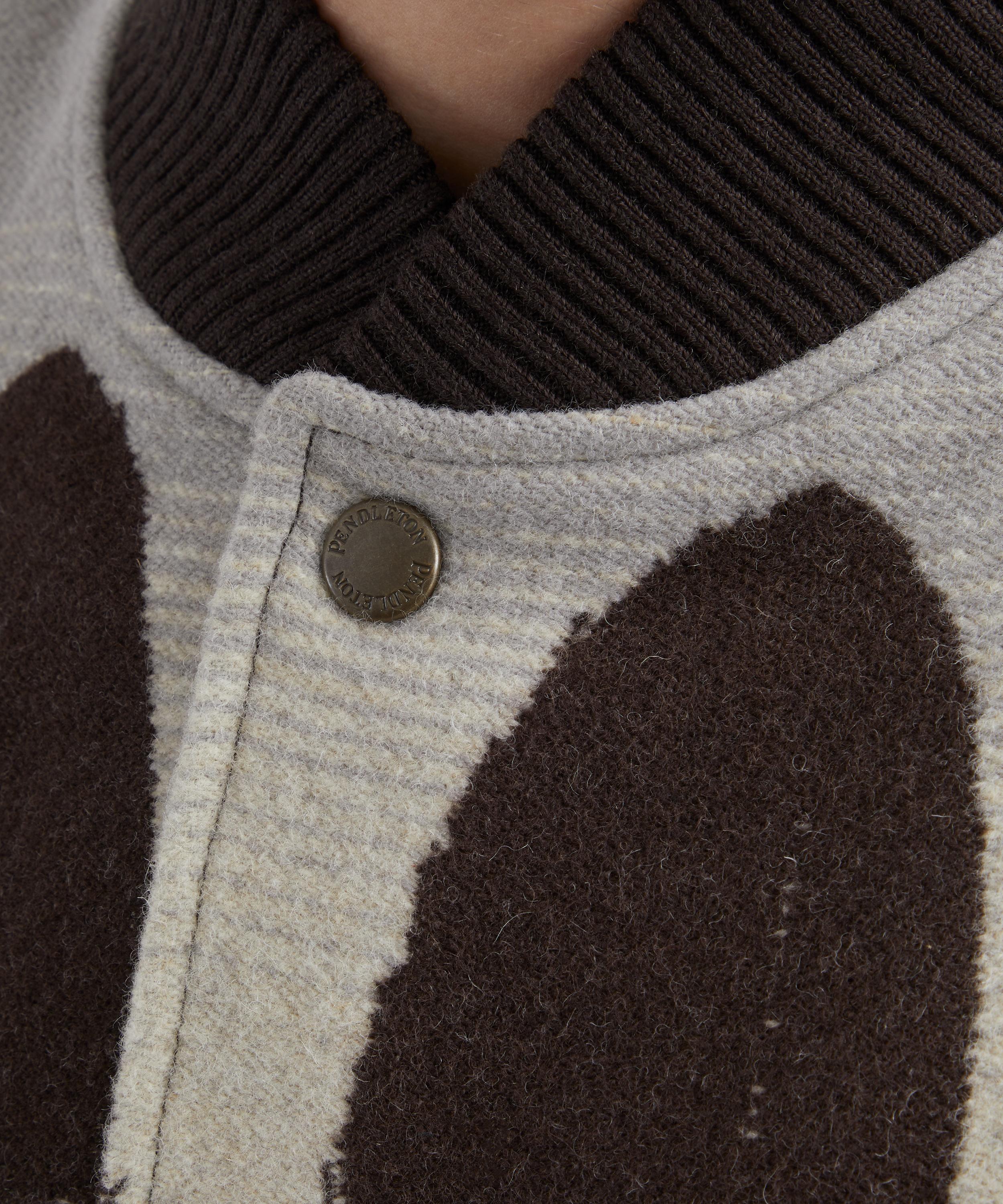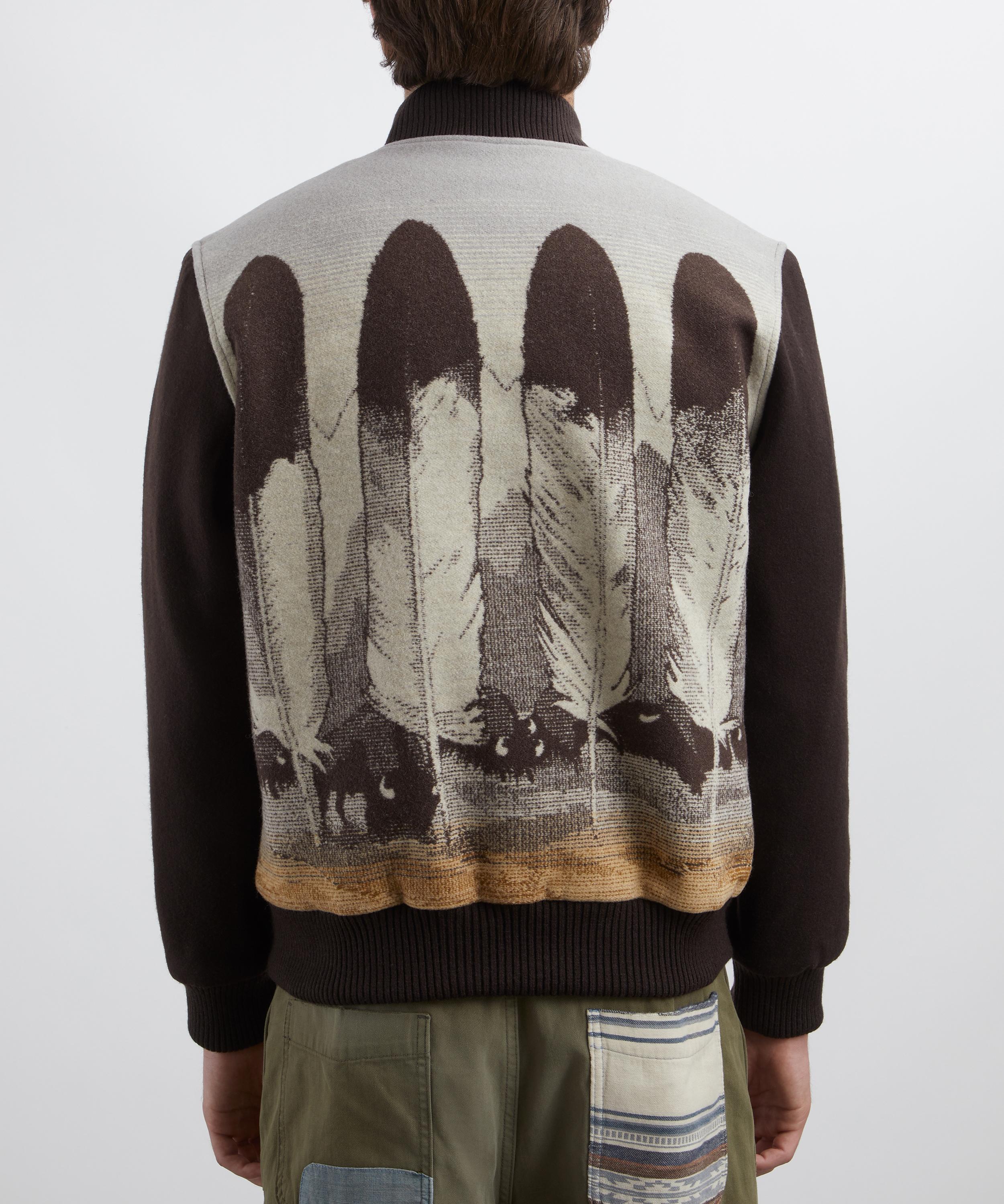 This men’s bomber-style jacket features a front and back pattern from the "In Their Element" blanket designed by Joe Toledo. Made from blanket-weight wool jacquard with a quilted nylon lining, it is lightly filled for warmth. It includes a snap closure, two welt pockets, ribbed collar and cuffs, and a faux-leather label on the interior that shares the story of the pattern.