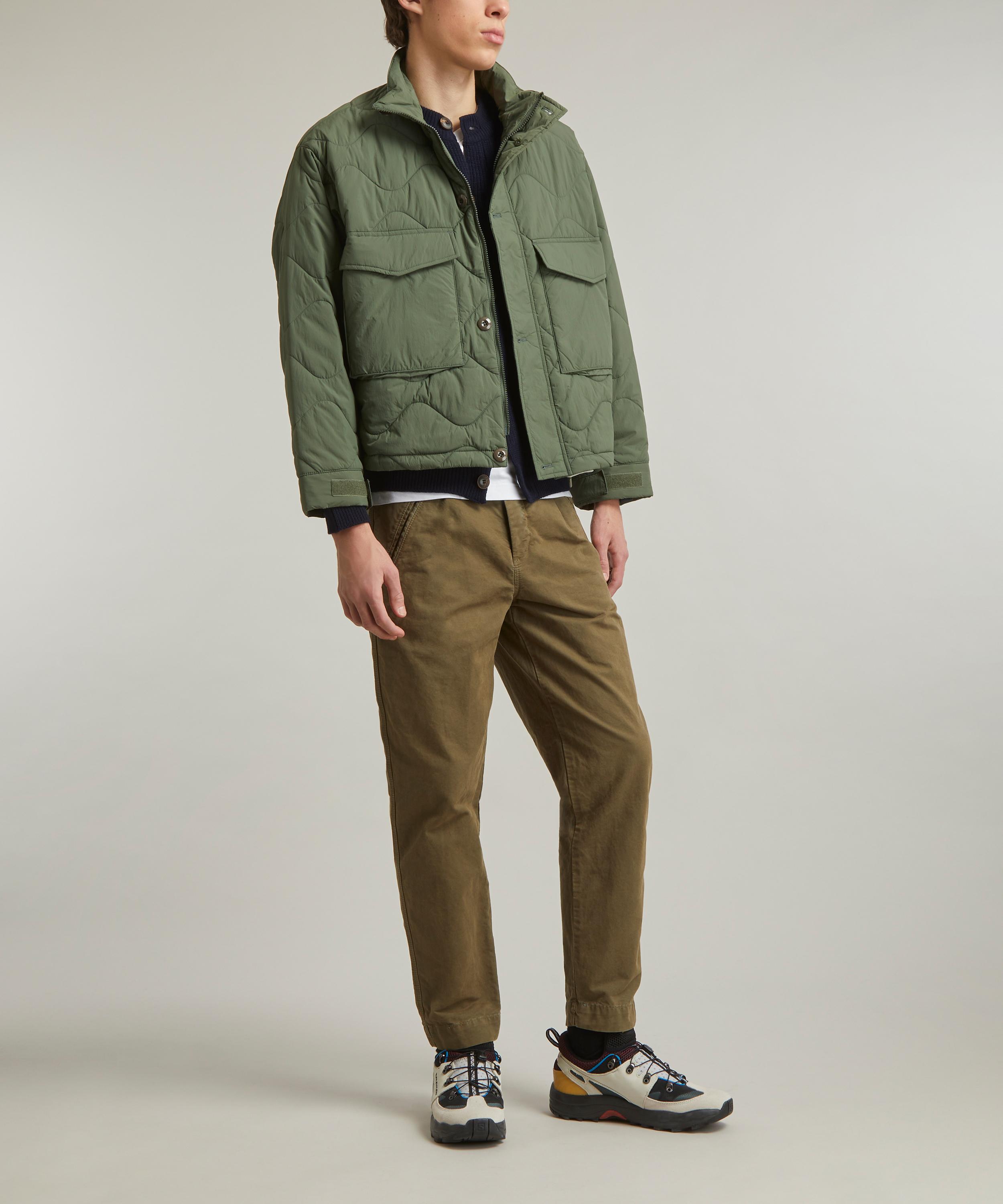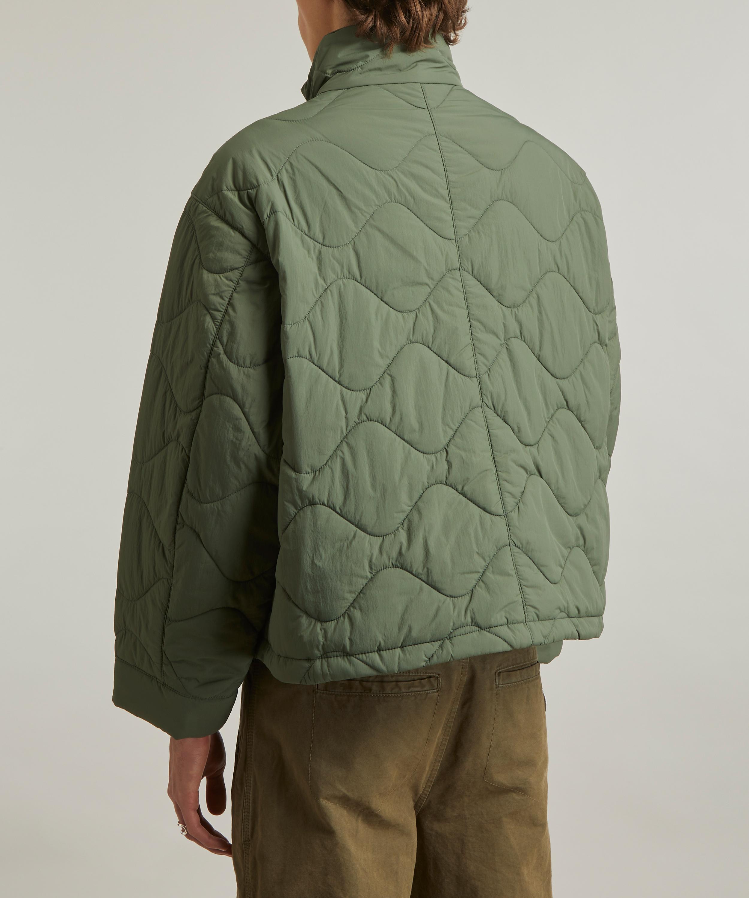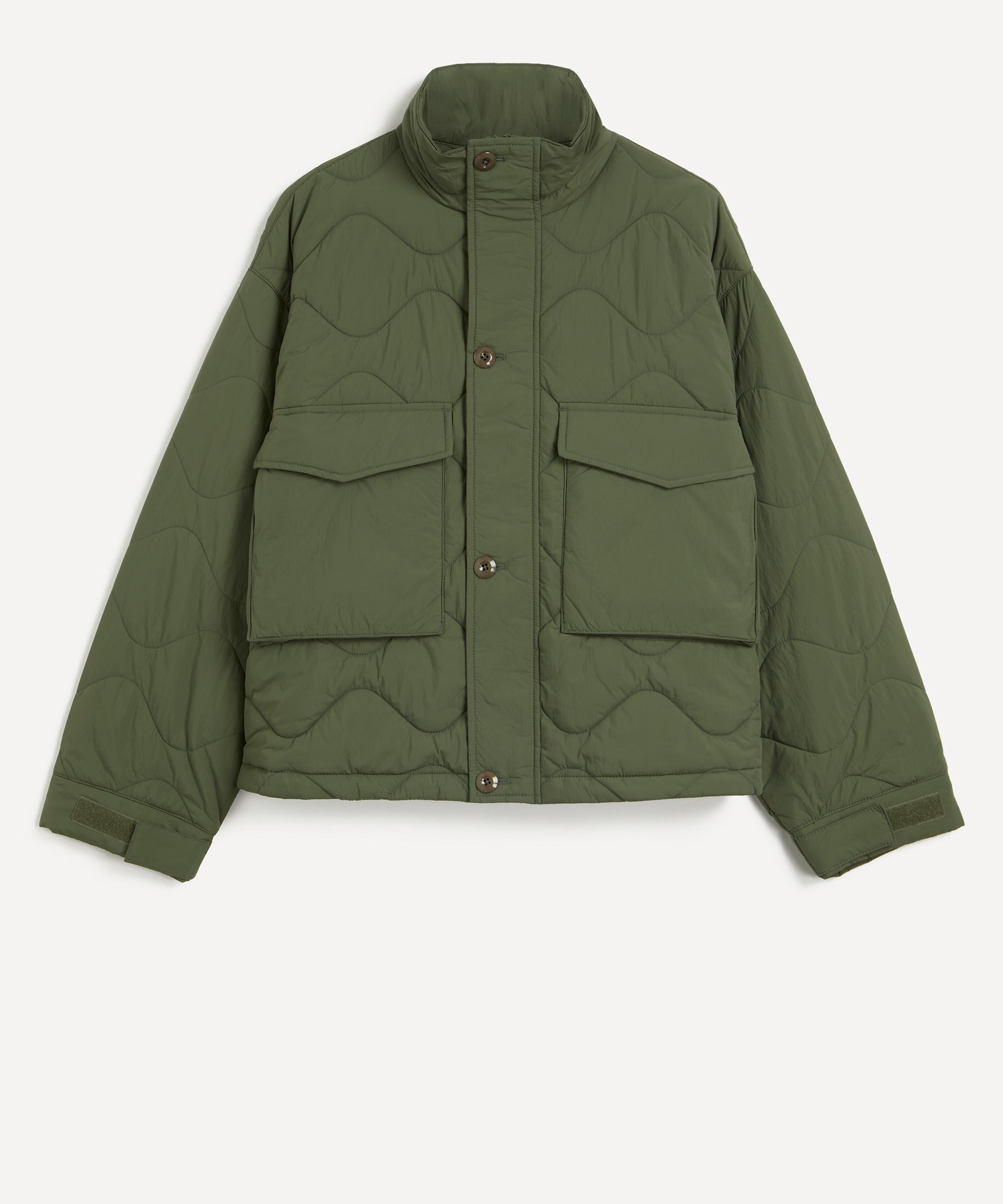 Taking inspiration from classic military styles, this down-filled jacket is detailed with a classic onion–quilted pattern throughout. Boasting a boxy, slightly cropped silhouette with dropped shoulders, it has a funnel collar, two large bellow pockets, and a button closure complete with a concealed zipper.