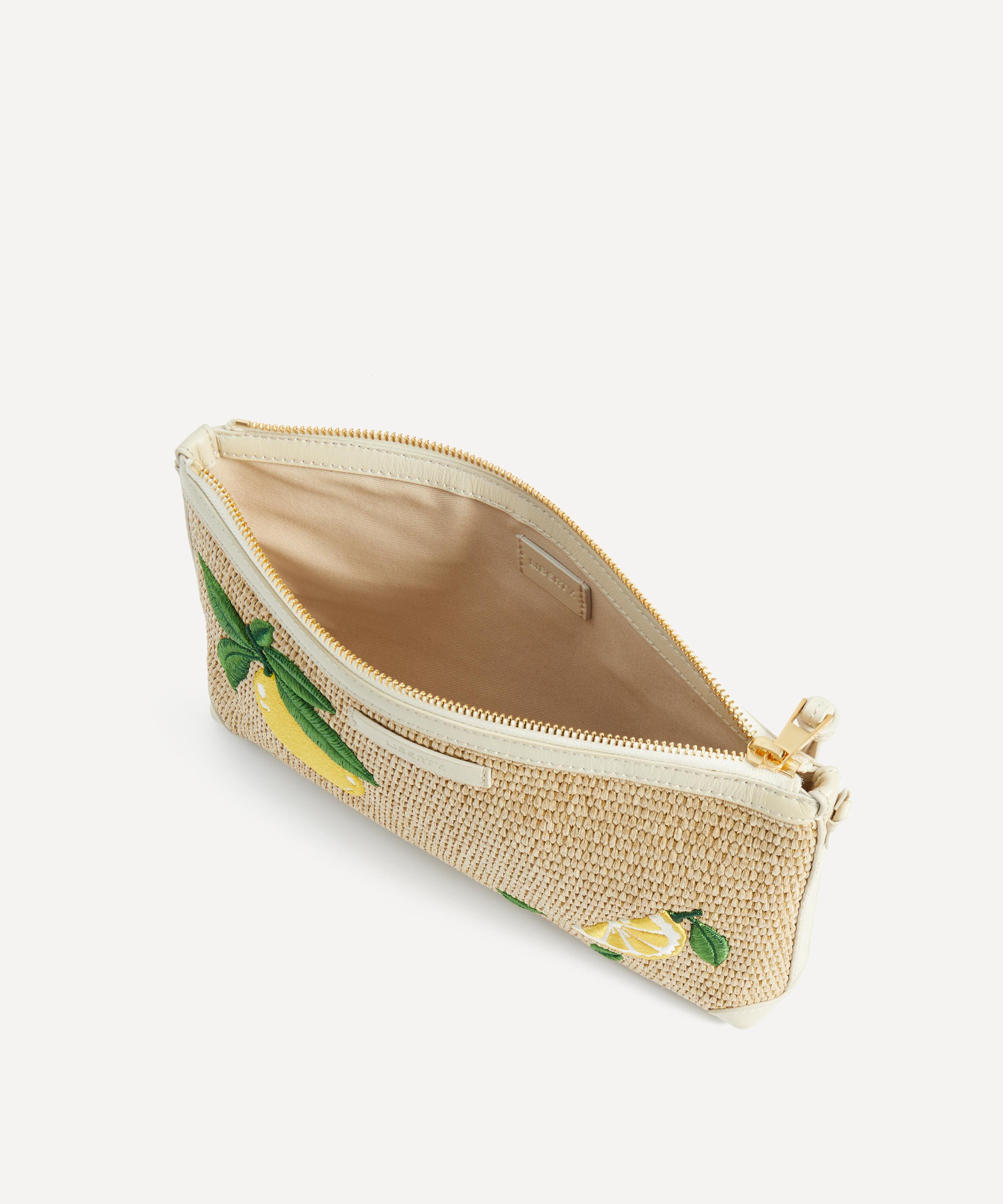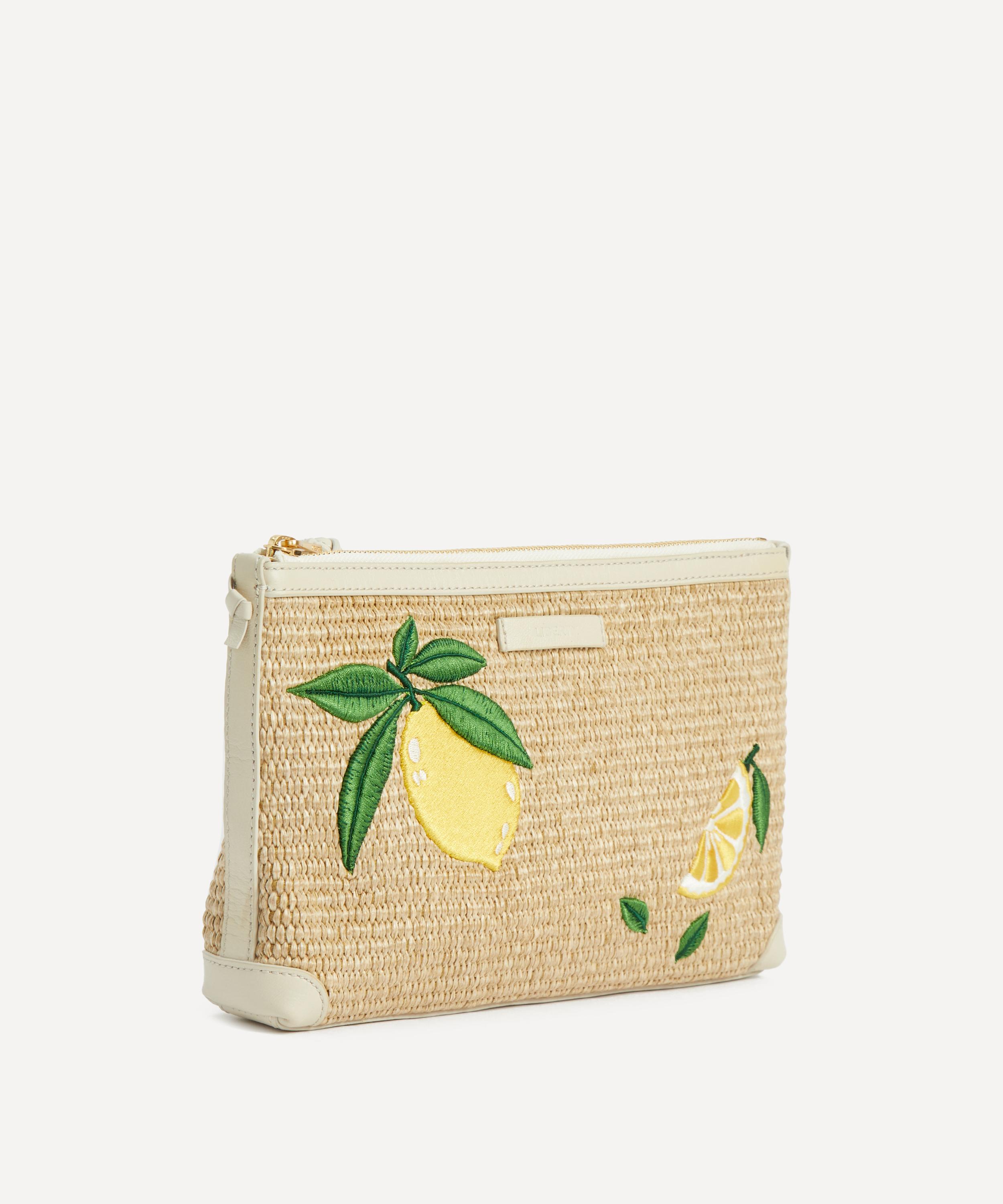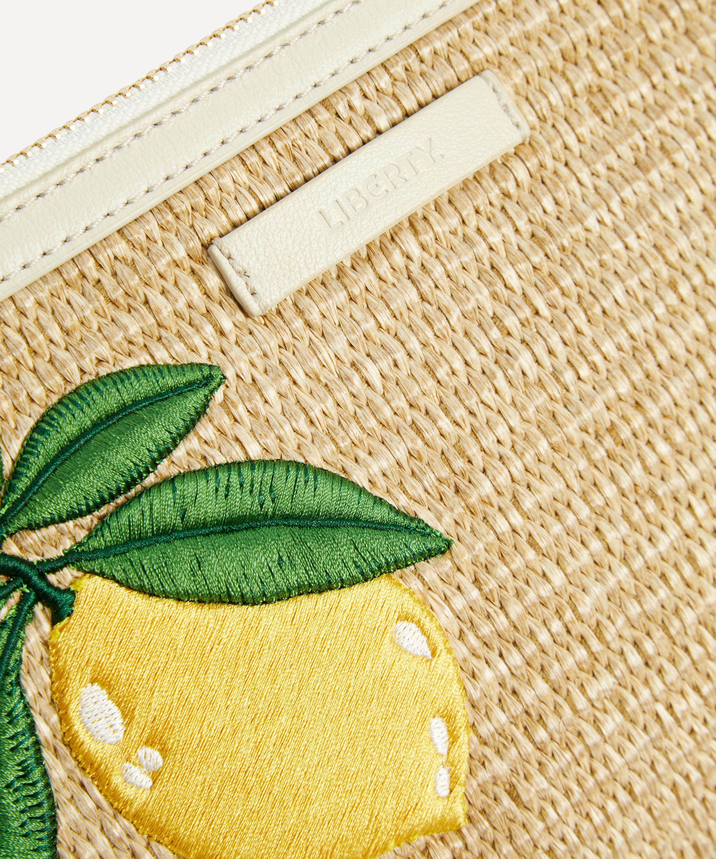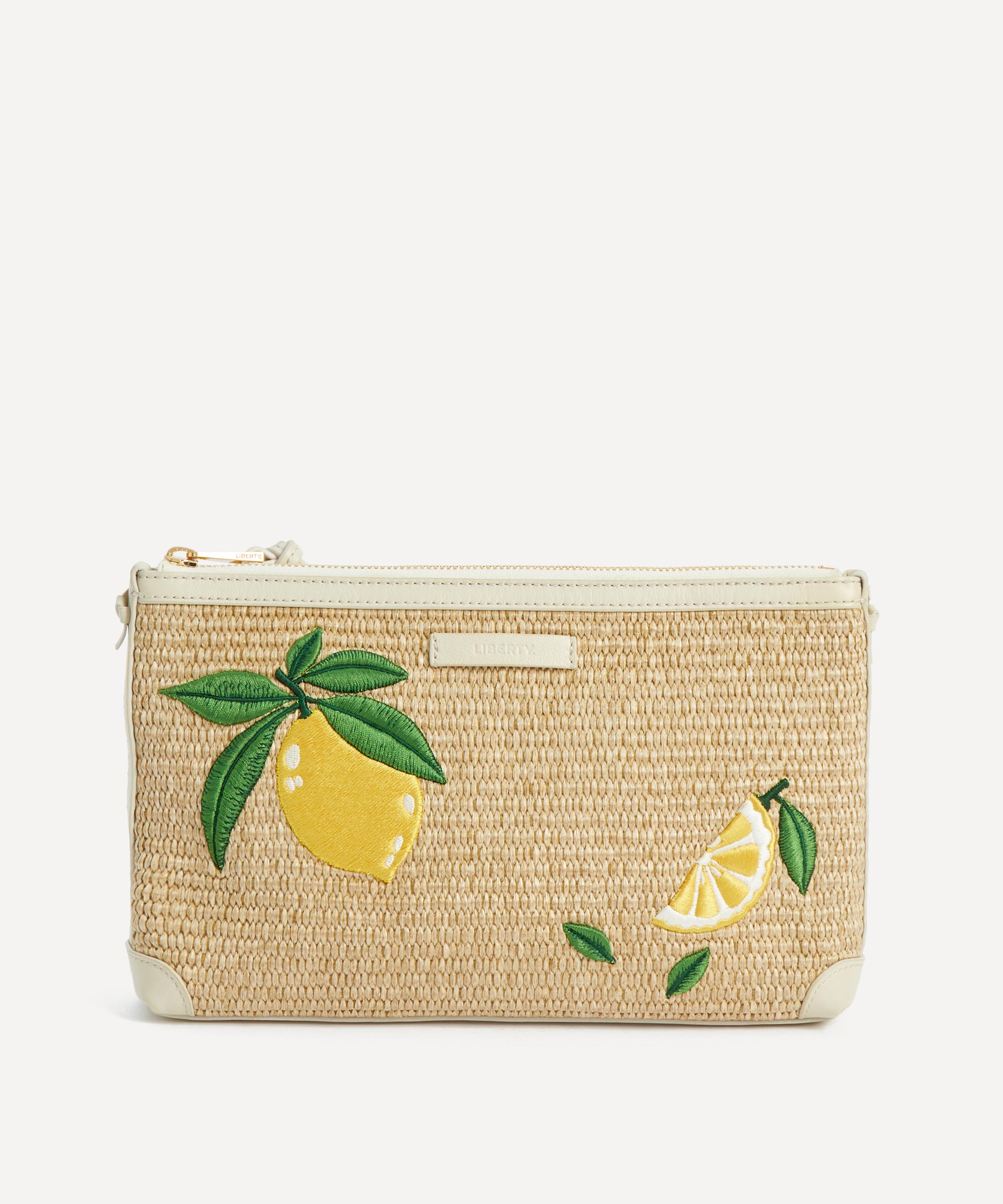 Lean into breezy bohemian styling and elevate looks with Liberty’s Raffia Lemon clutch pouch – boasting a summery take on a classic silhouette. Handmade from raffia, this clutch offers a tropical twist with zesty lemon motifs embroidered on the front, inspired by our Citron Presse print, paired with leather applique techniques to celebrate Liberty’s quality craftmanship. Complete with a wristlet strap – style it with ready-to-wear sundresses and sandals for a fun, seasonal curation perfect for sunny city strolls.