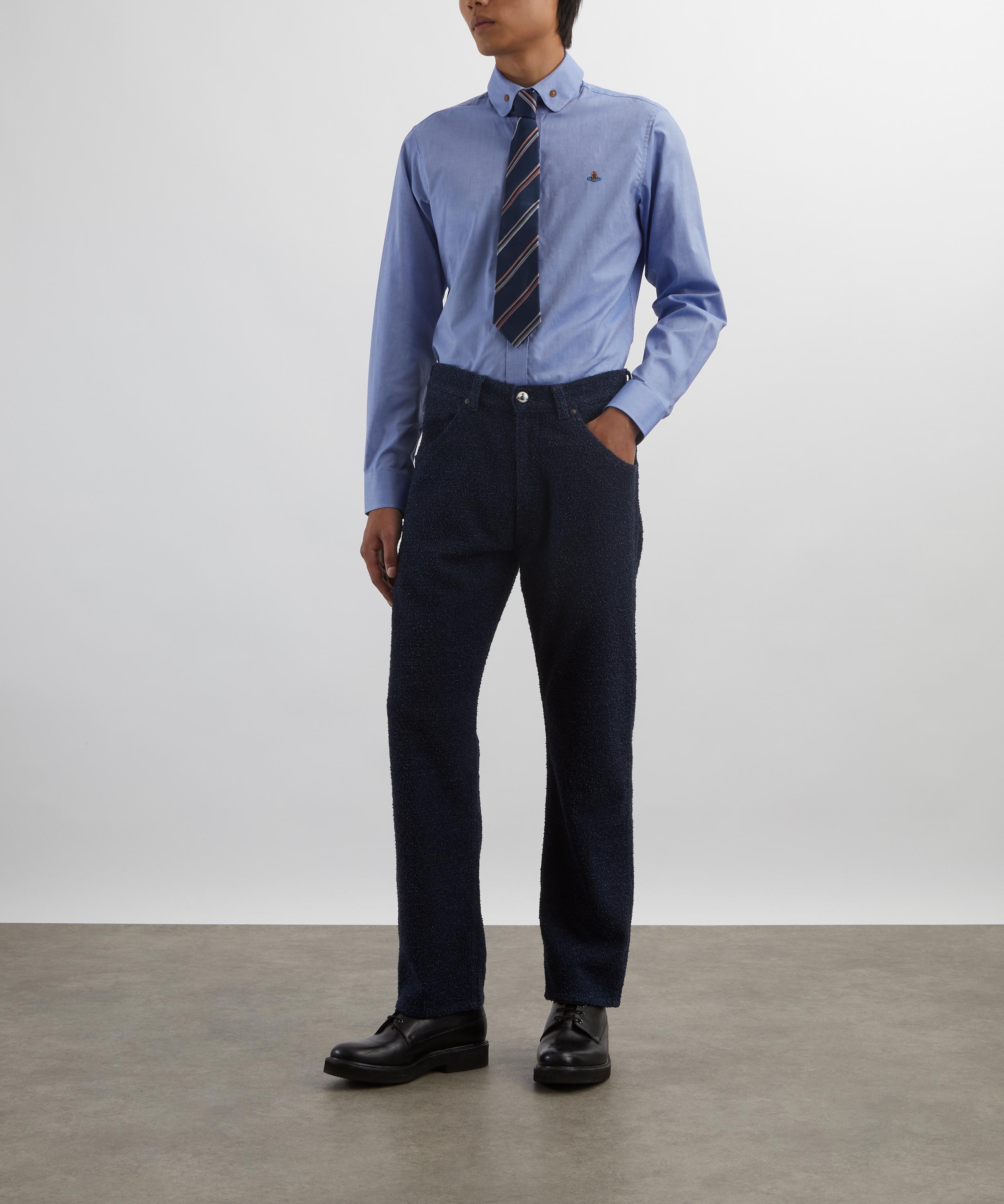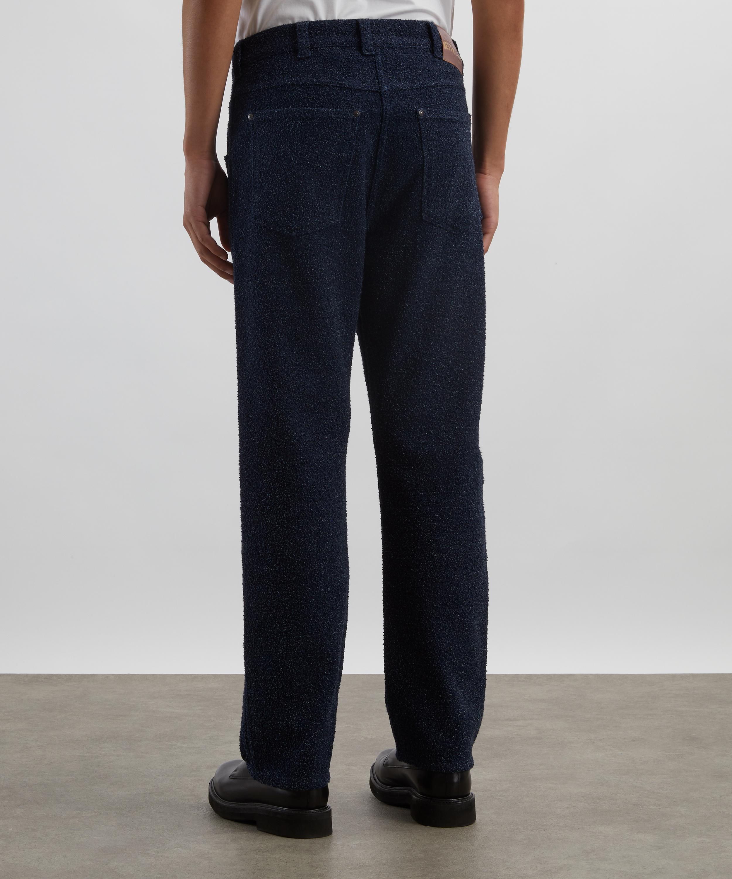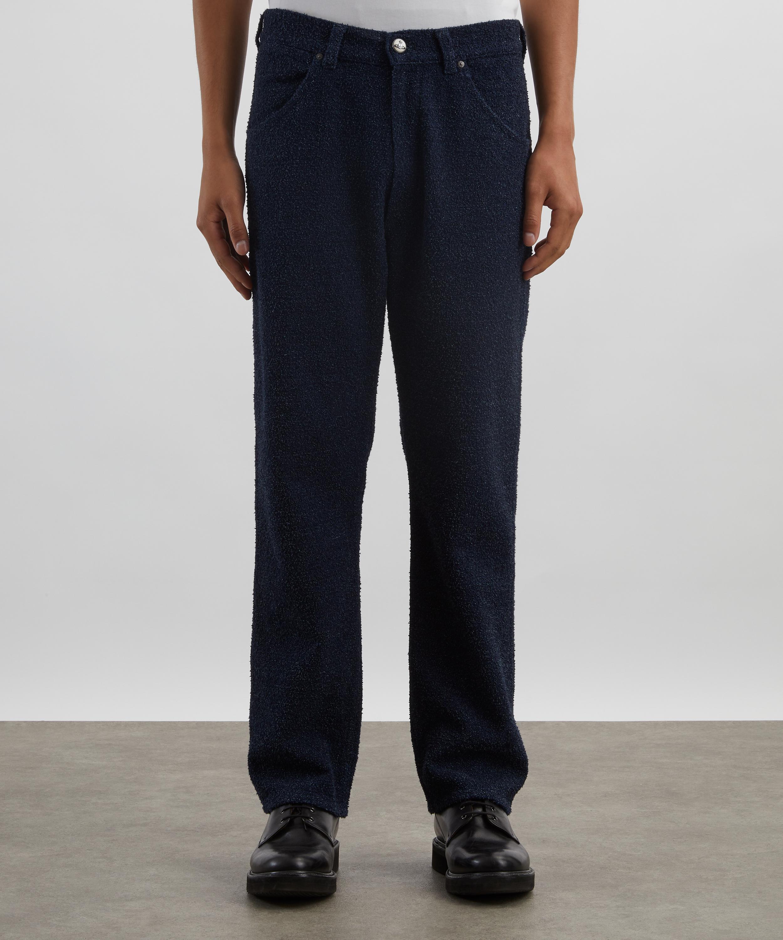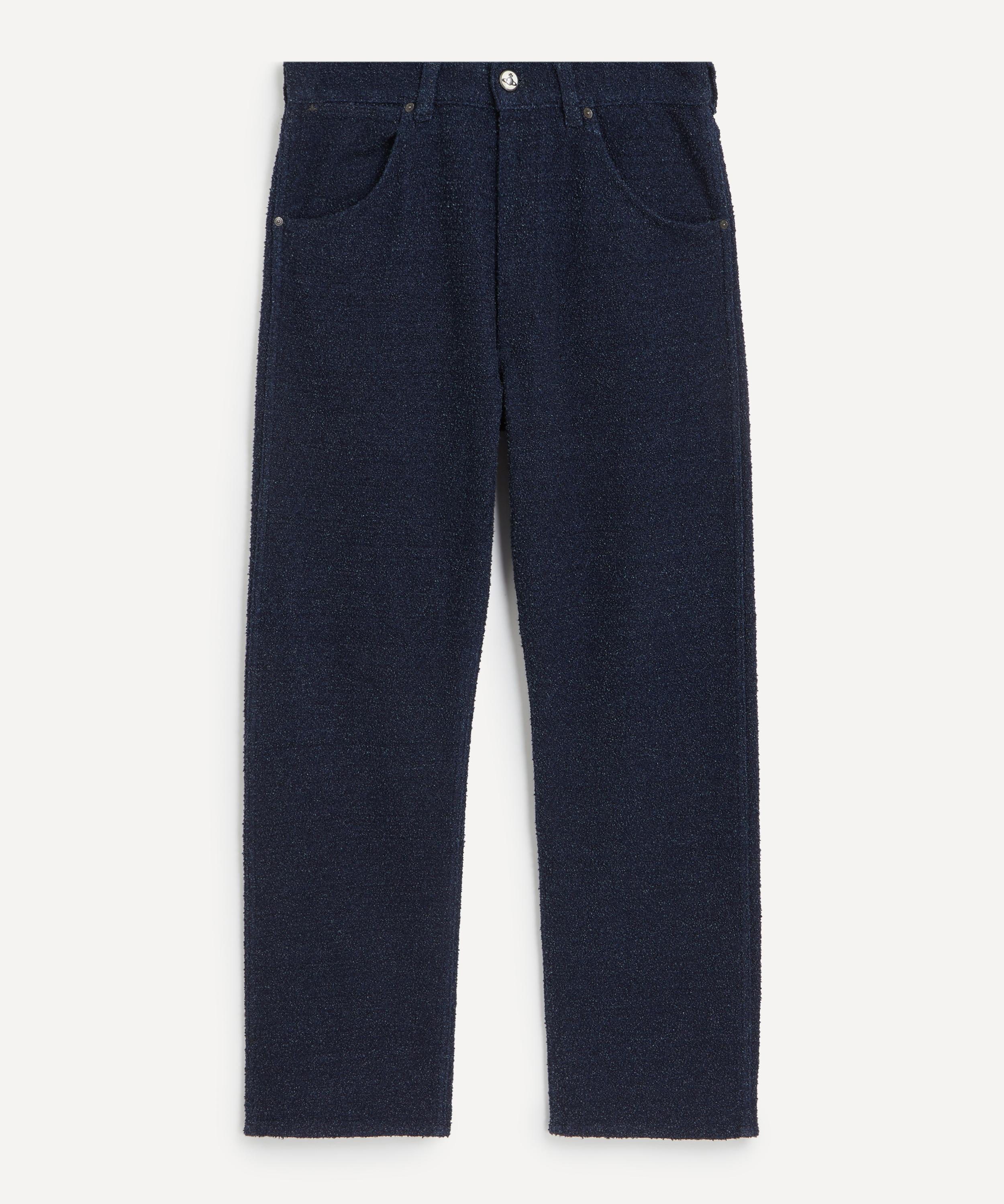 Crafted from a tactile bouclé fabric, the Rider jeans reimagines classic denim styling with a classic straight-leg silhouette, belt loops, four-pocket construction, and a branded jacron patch on the back for a distinctive touch.