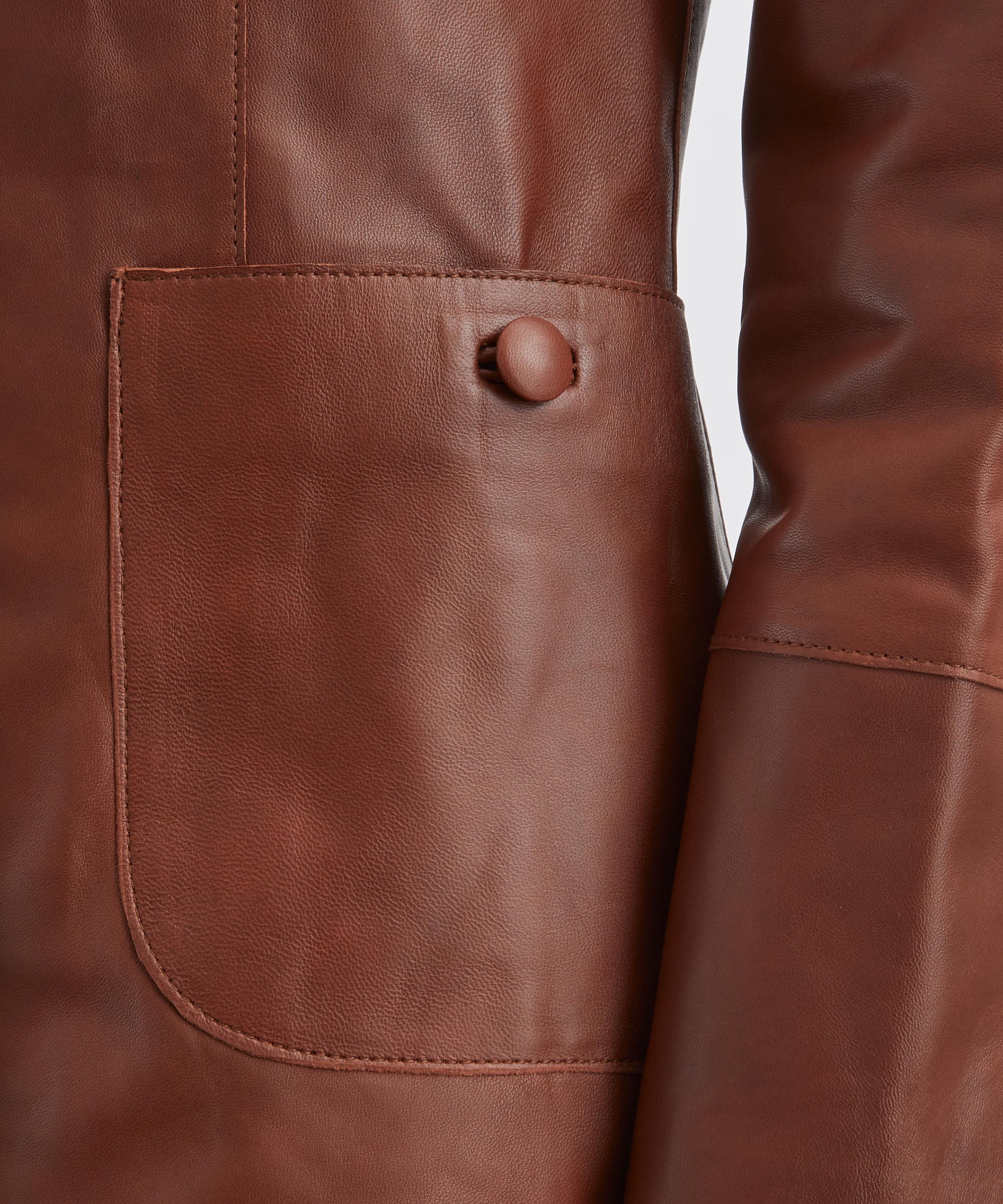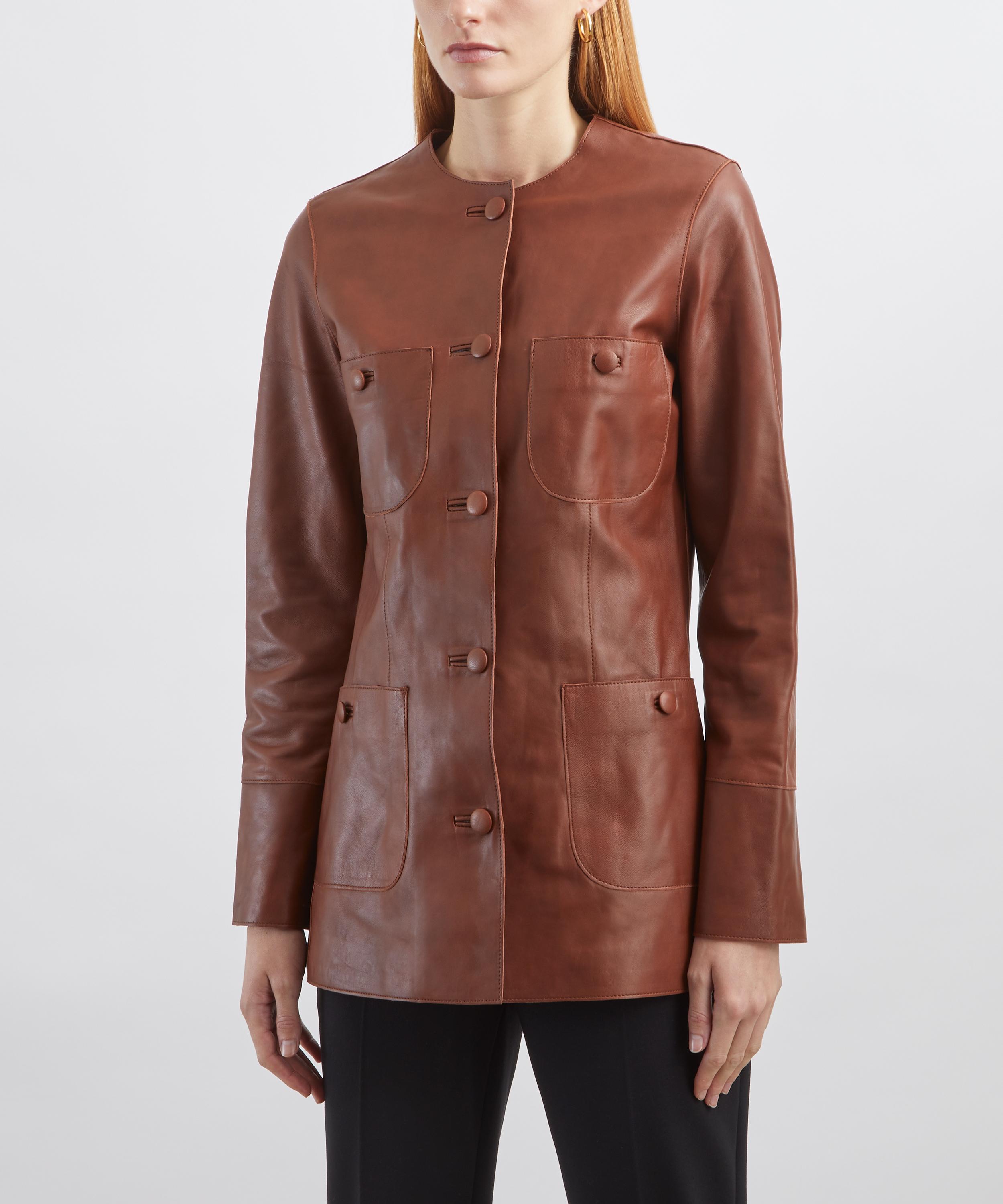 Expertly crafted from buttery leather in a rich whiskey hue, the Rani jacket embodies modern, tailored elegance with its loose fit, collarless neckline, and four path pockets.