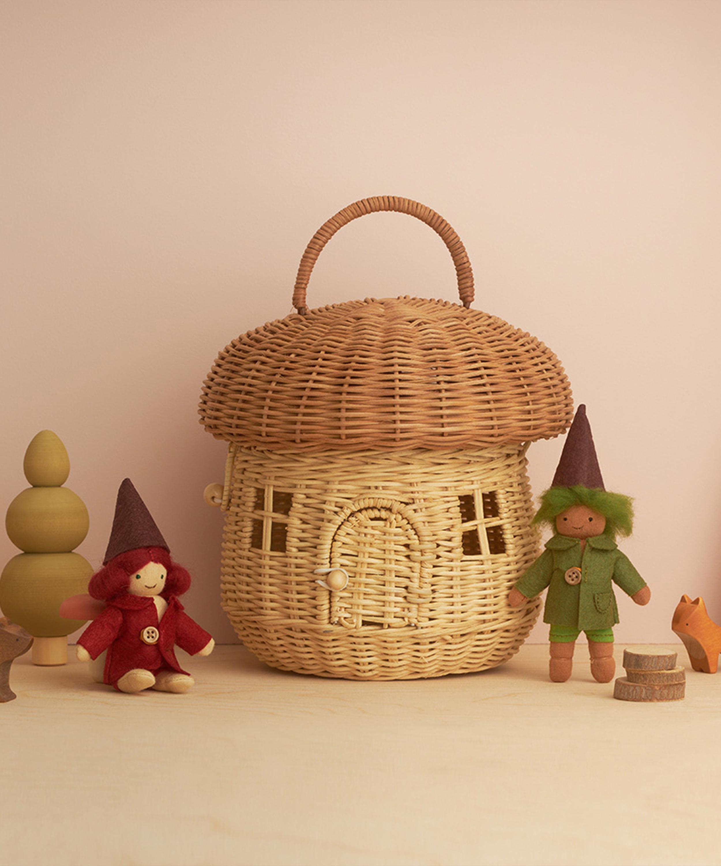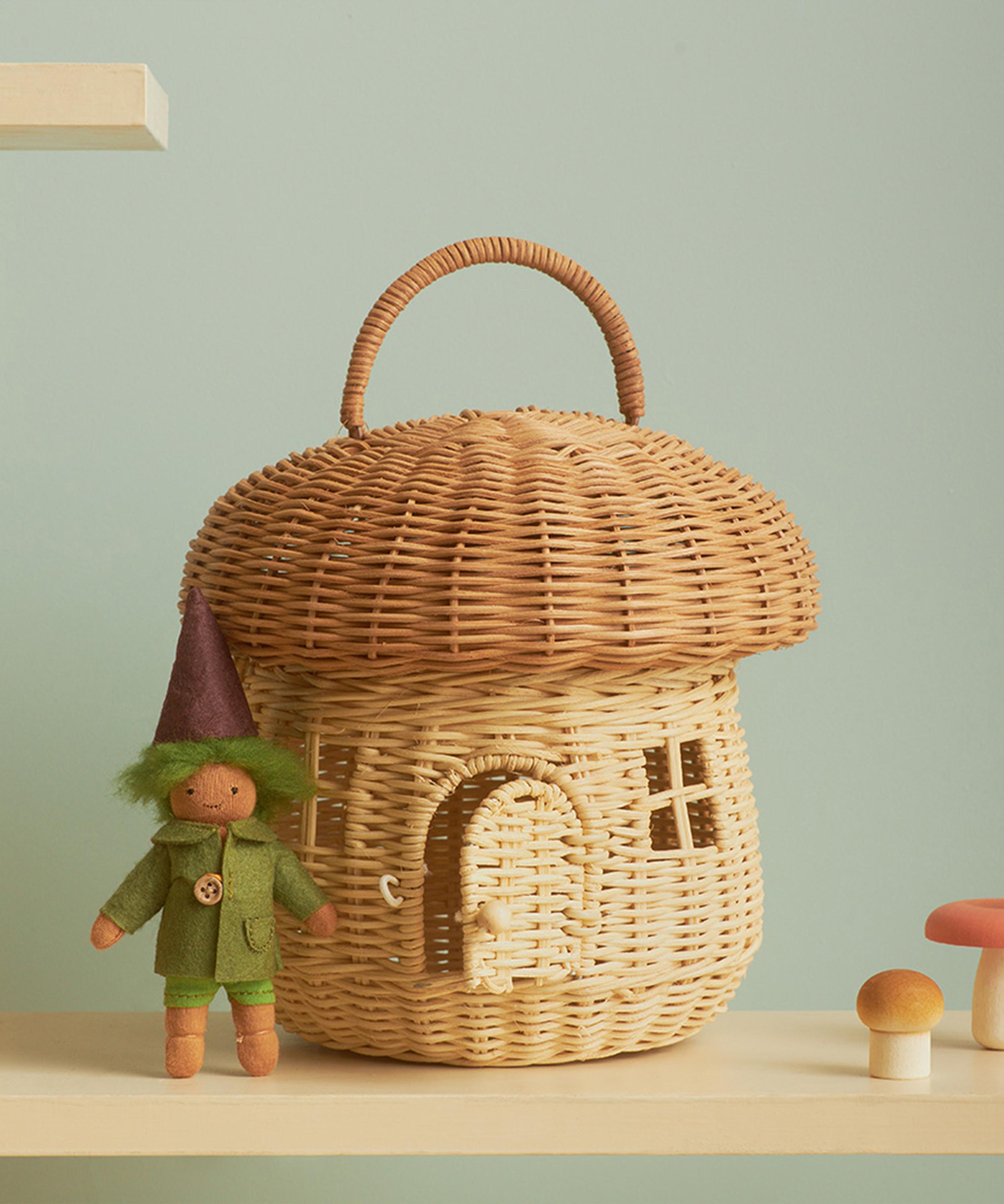 The wonderfully whimsical design codes of the brand shine through in this basket, taking the silhouette of a mushroom house, charmingly woven from natural rattan with openings to the roof and door and practically finished with a sturdy carry handle to the top.About Olli Ella
