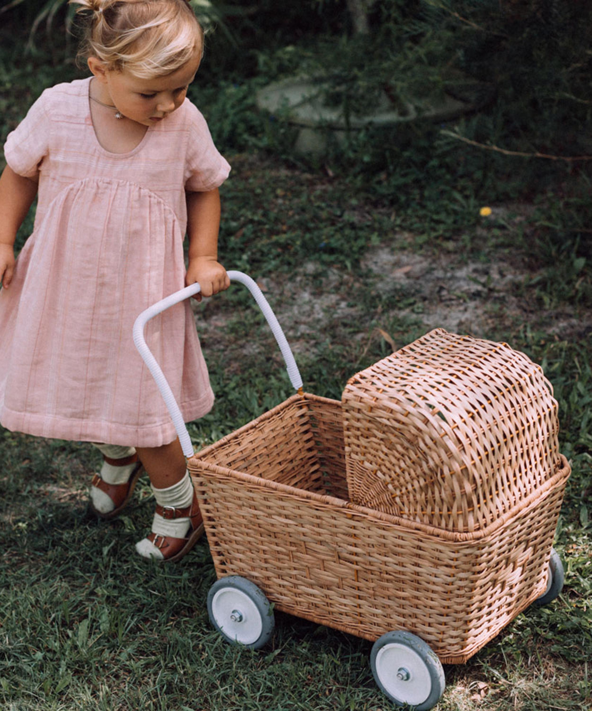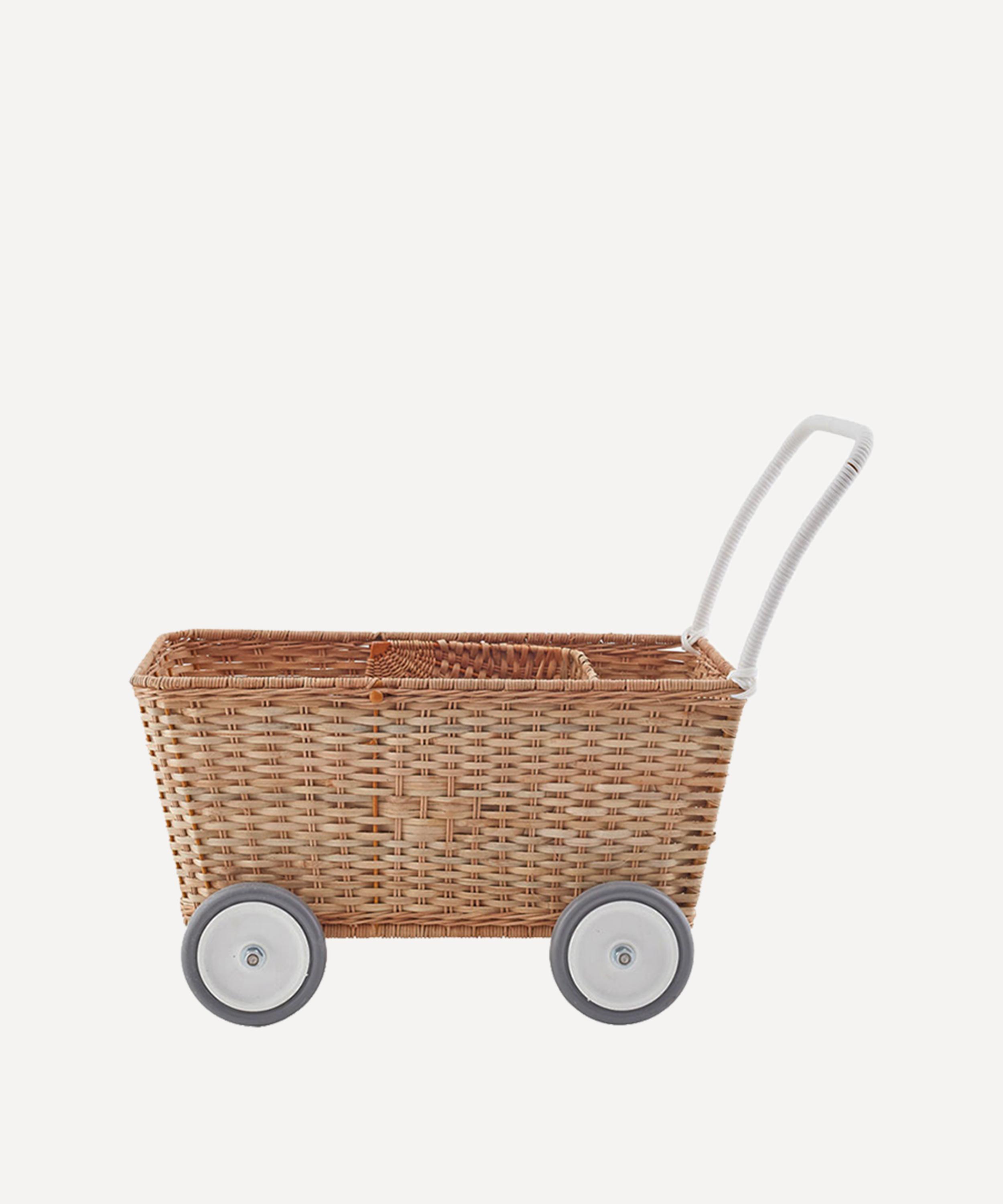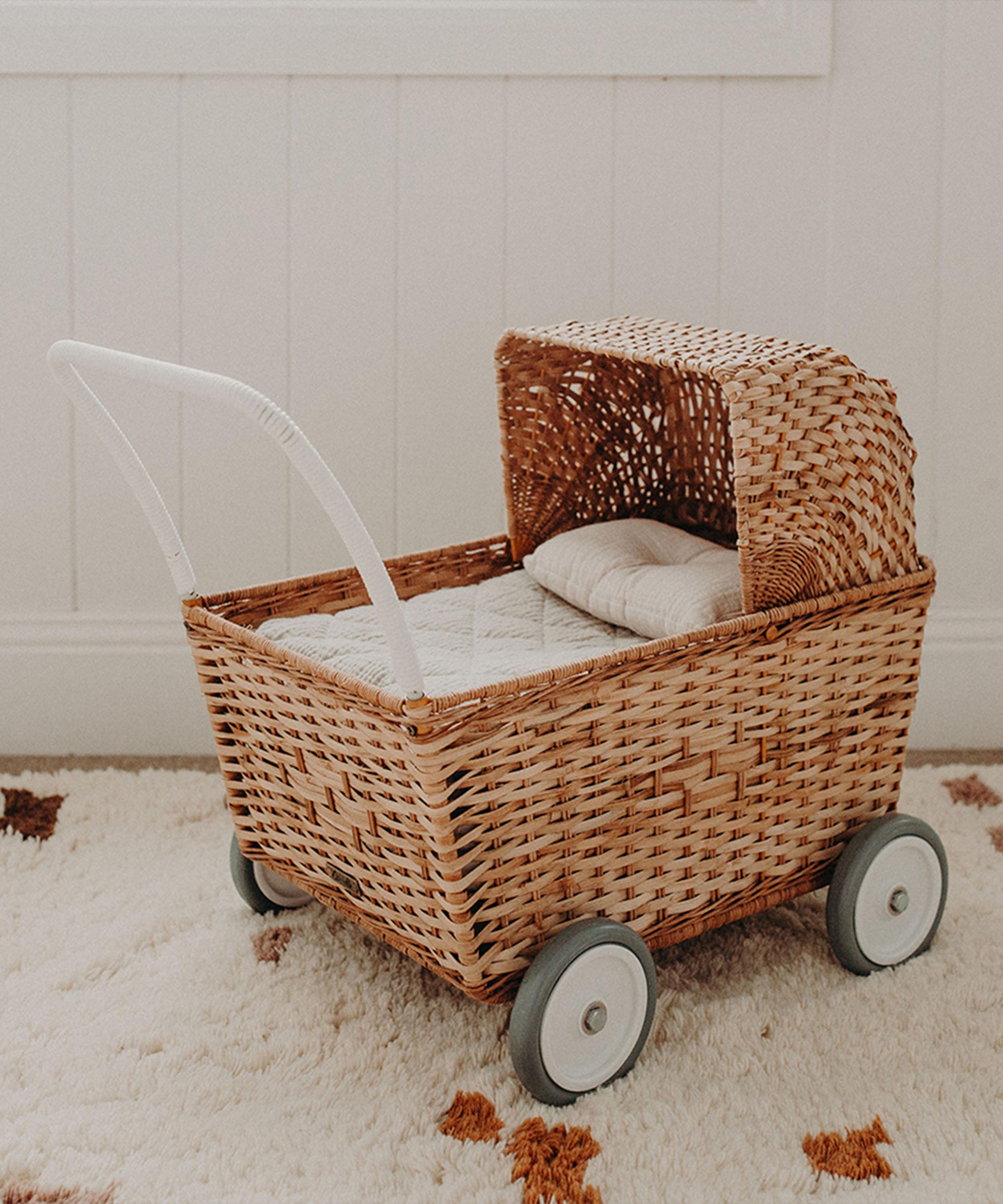 The wonderfully whimsical design codes of the brand shine through in this basket, taking the silhouette of a mini pram, charmingly woven from natural rattan with plastic wheels and adjustable hood that can be raised or lowered.About Olli Ella