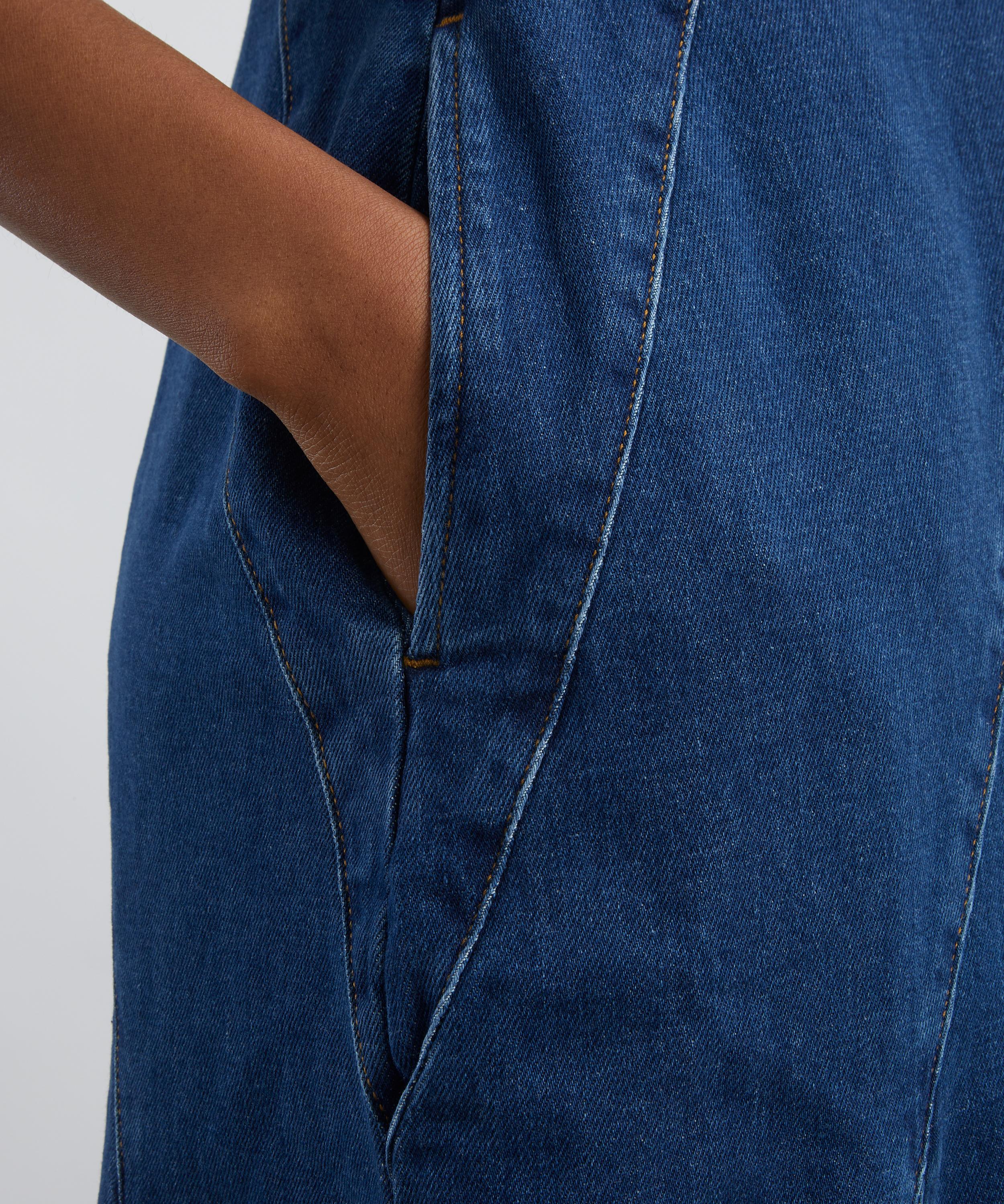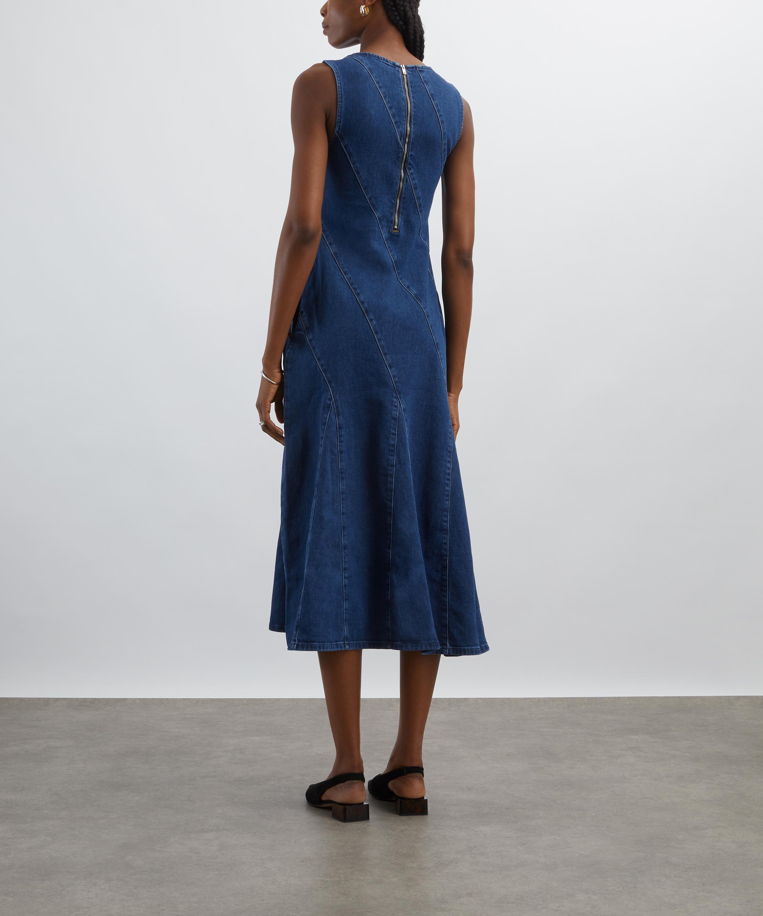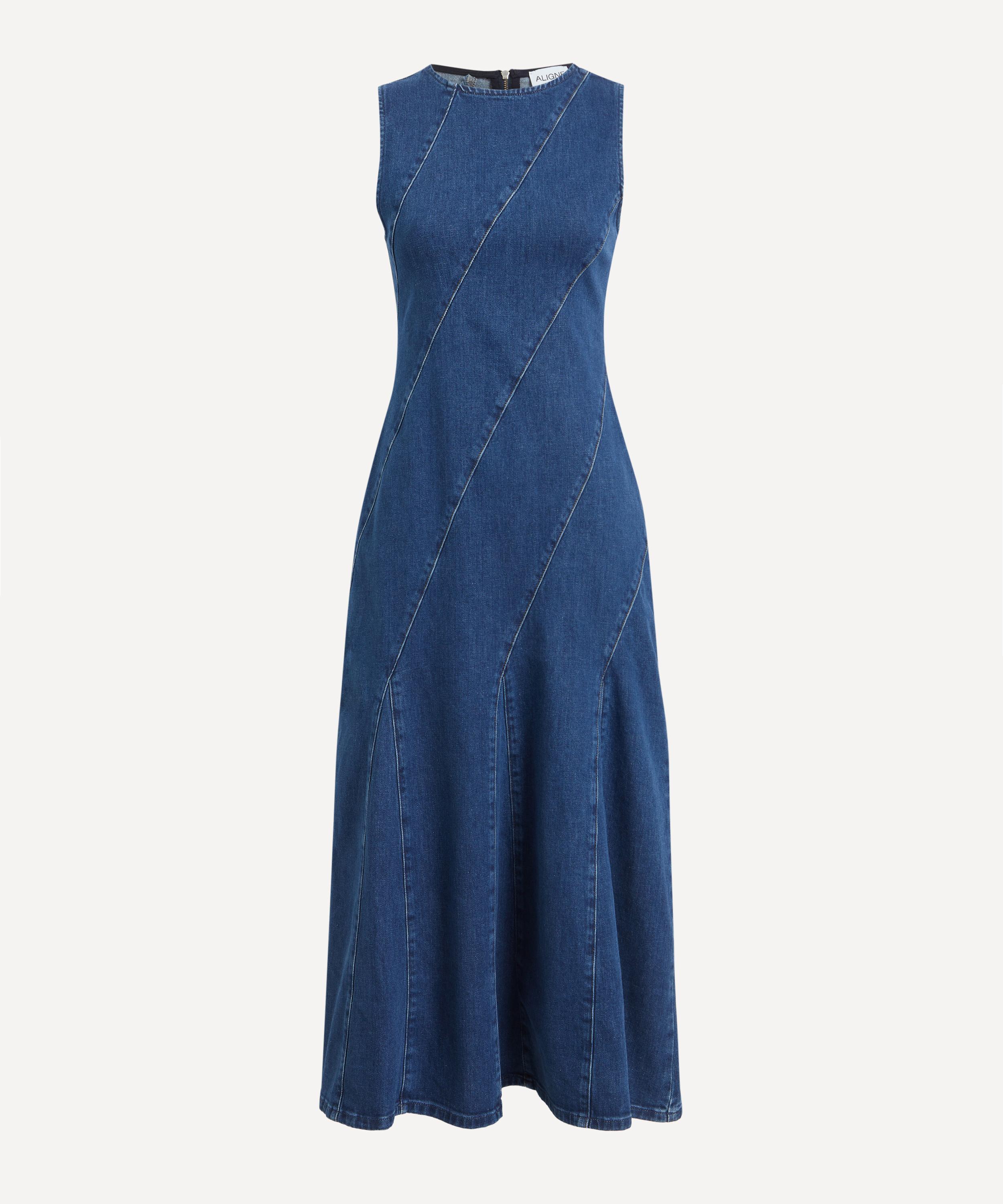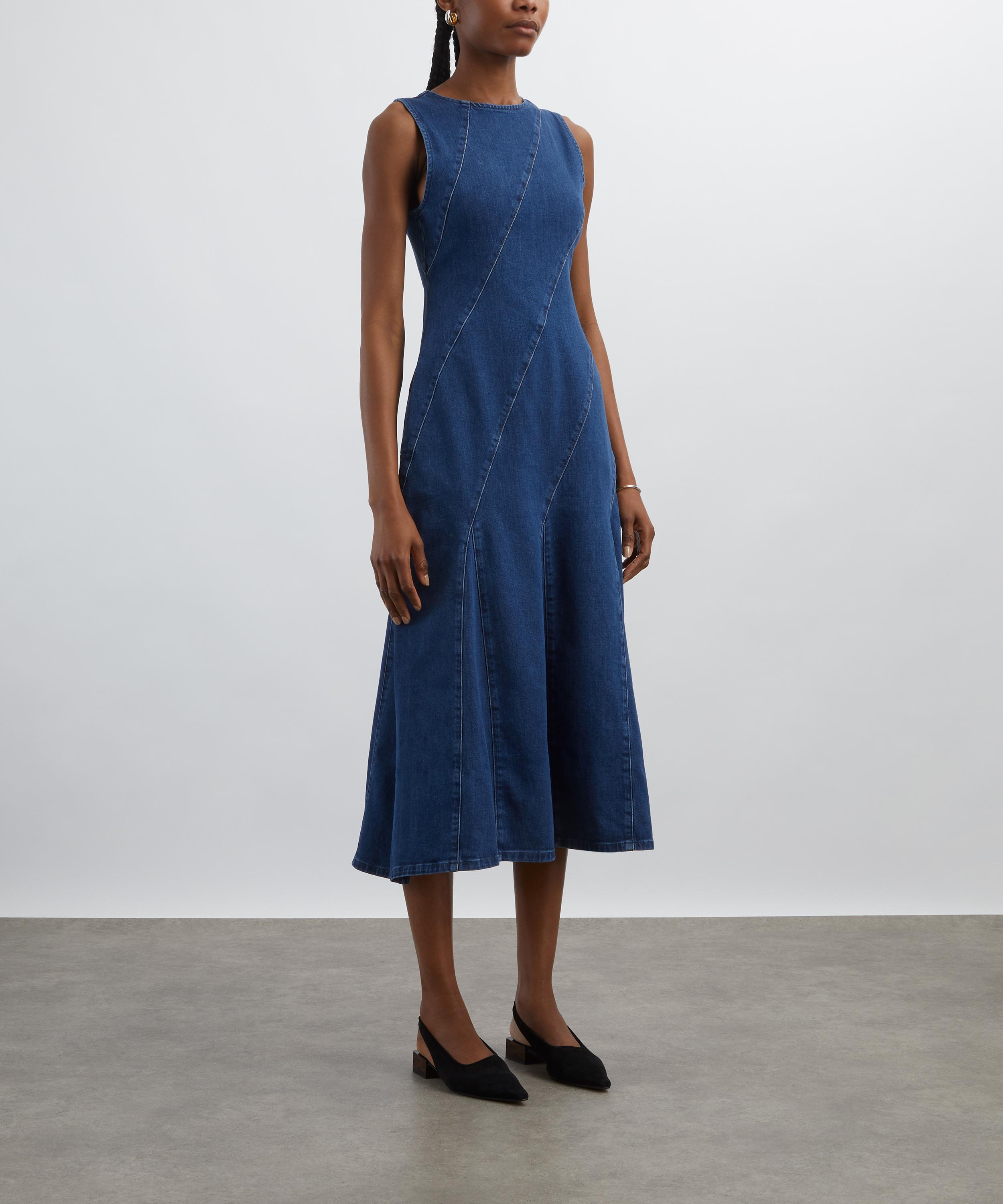 Crafted from cotton denim in a timeless mid-blue wash, the Raven midi dress combines classic style with modern elegance, featuring a flattering slim fit and diagonal seams that cascade into a softly flared midi skirt.
