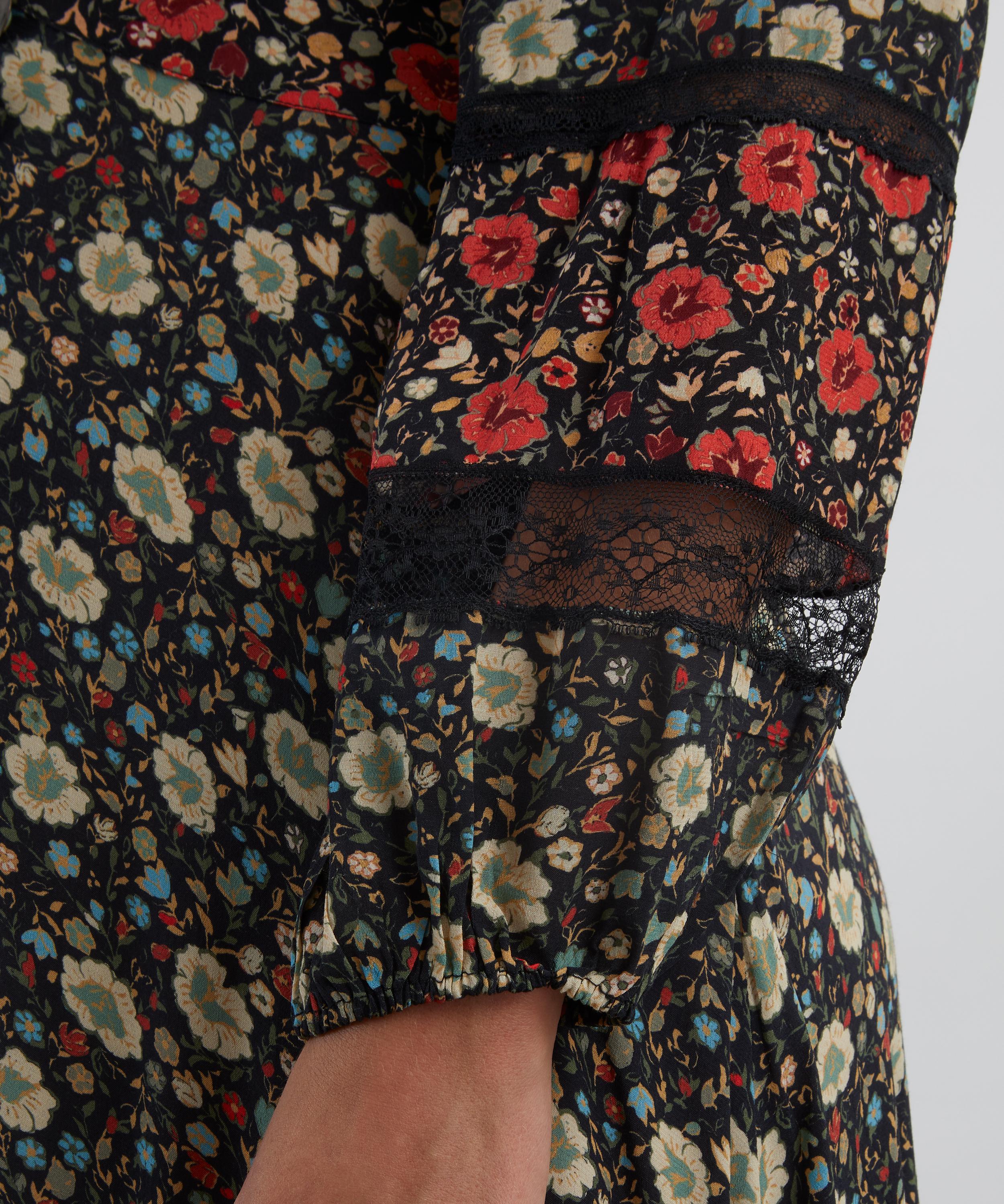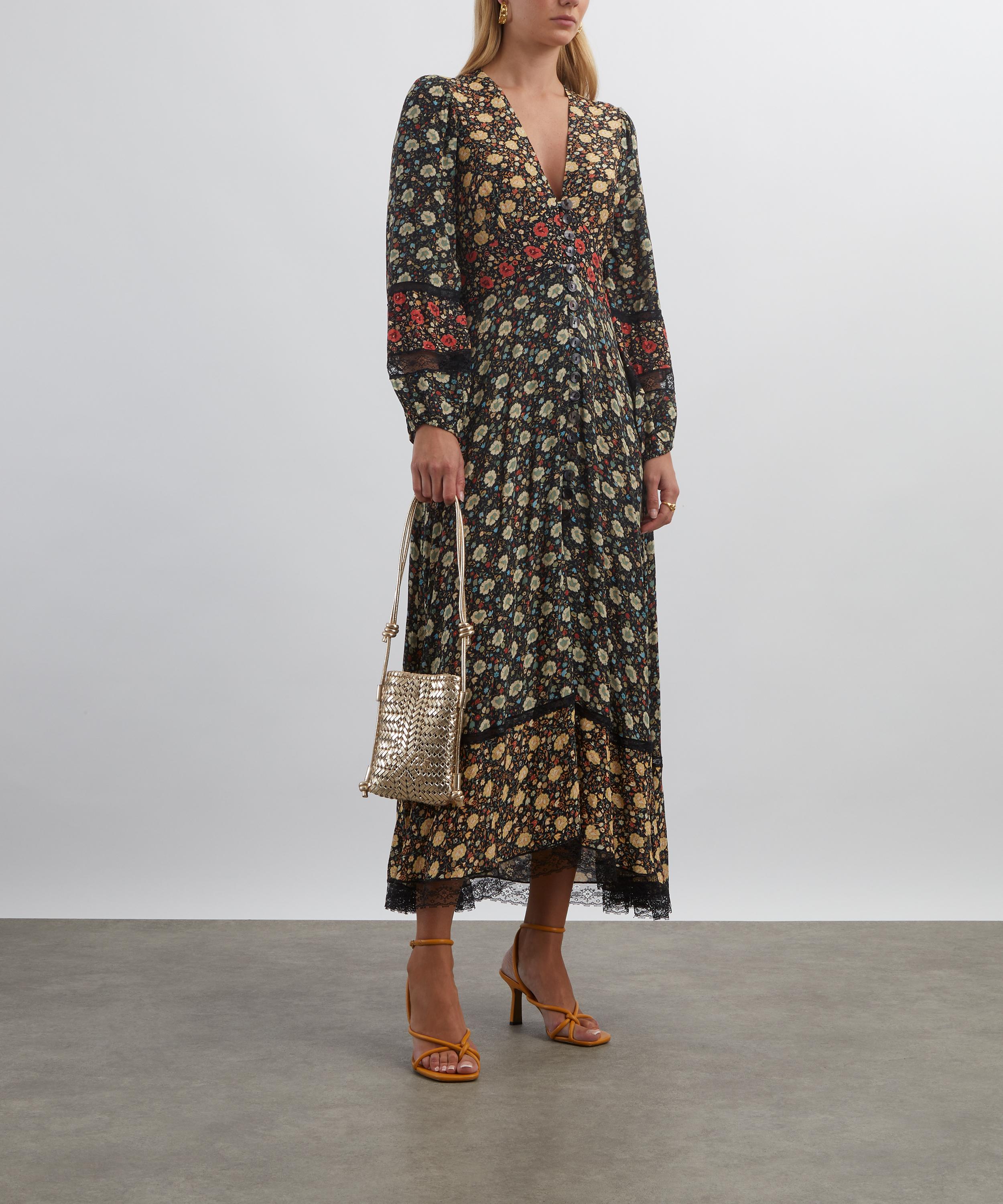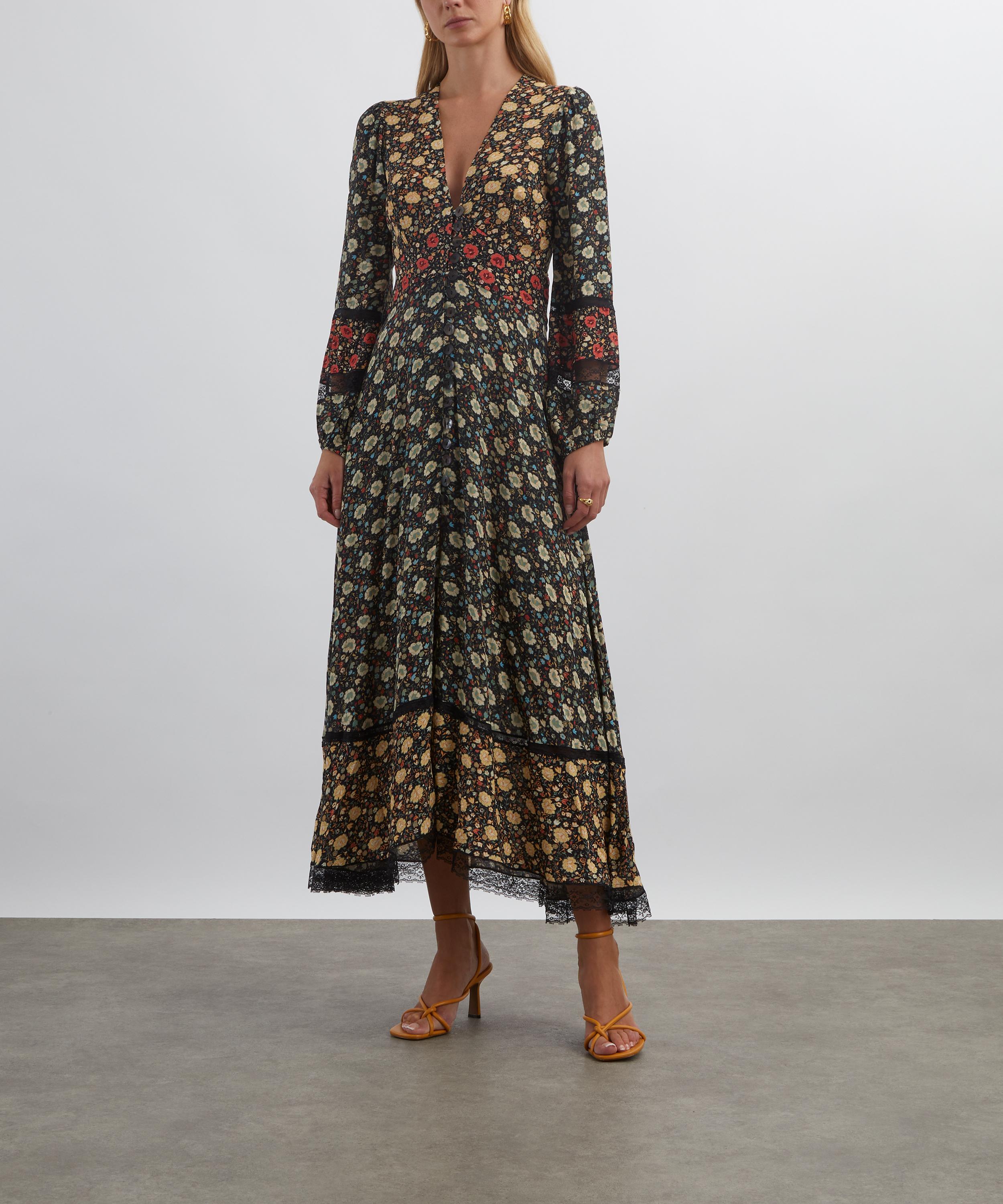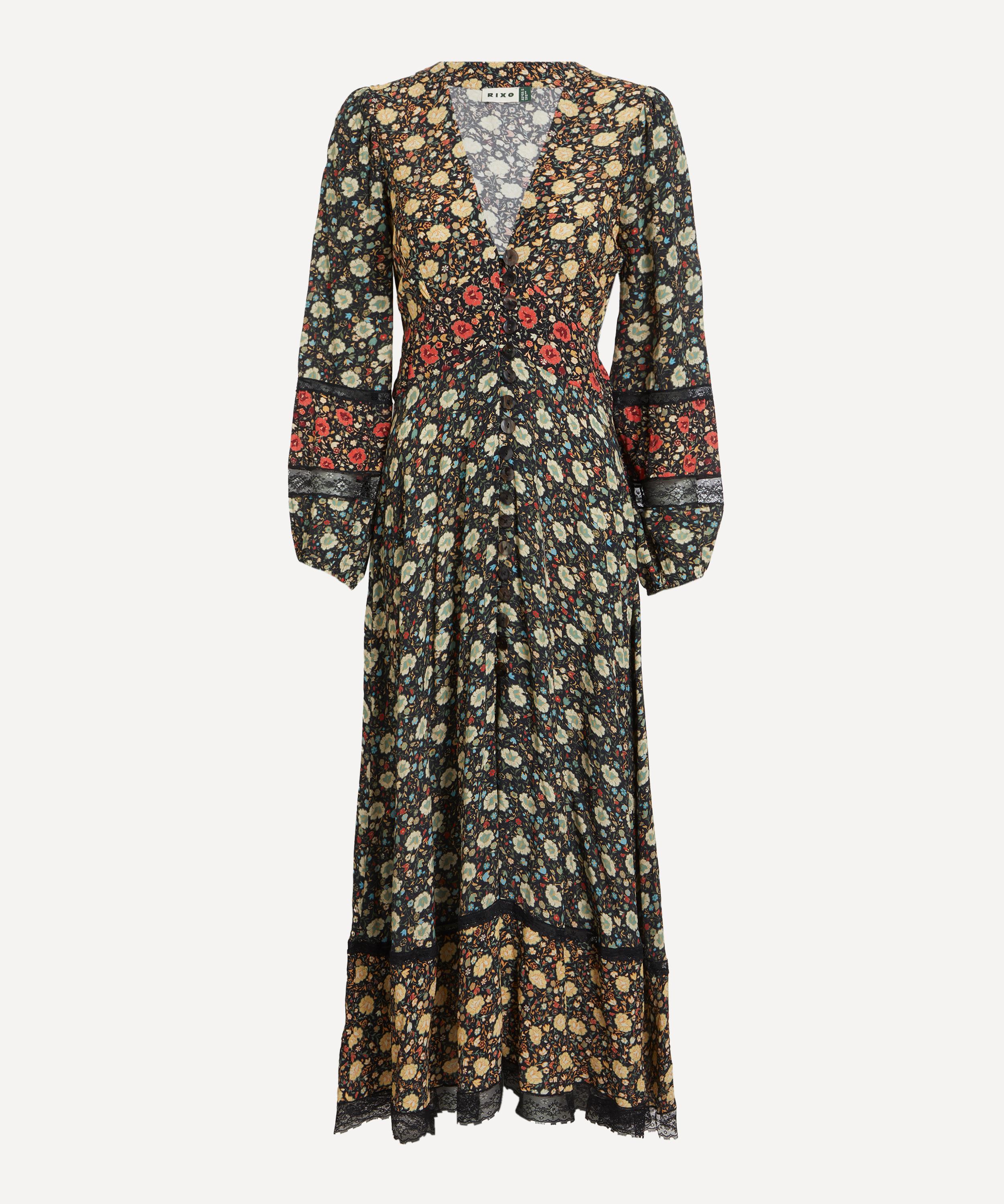 Crafted from lightweight crepe de chine and adorned with the Eva Floral Mix Black print, this midi dress embodies effortless elegance. The deep V-neckline, empire waist, and flowing blouson sleeves create a graceful silhouette, while delicate lace trims add a romantic, bohemian touch.