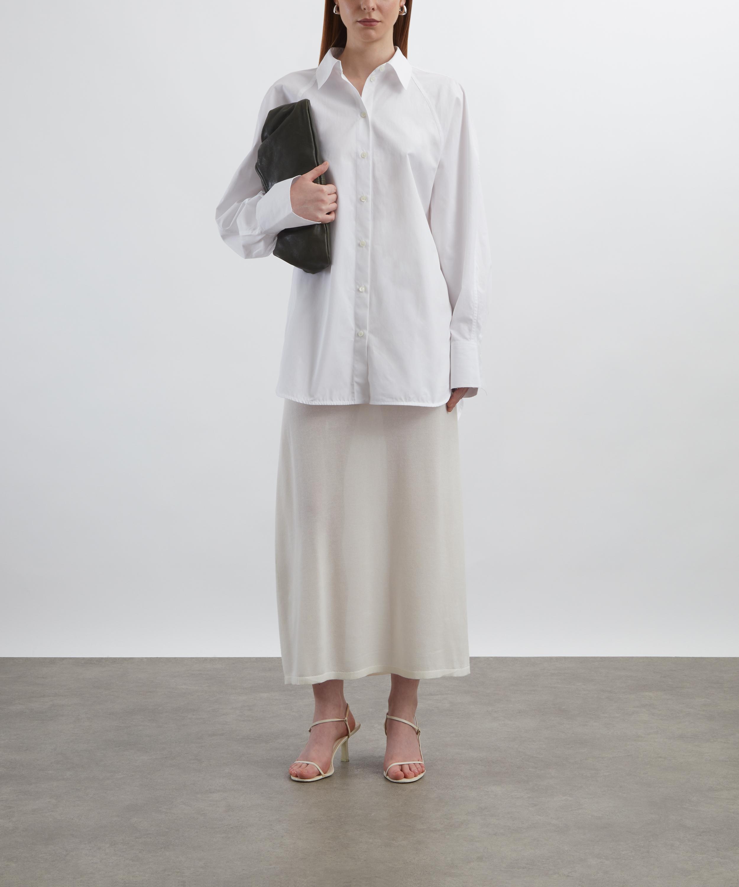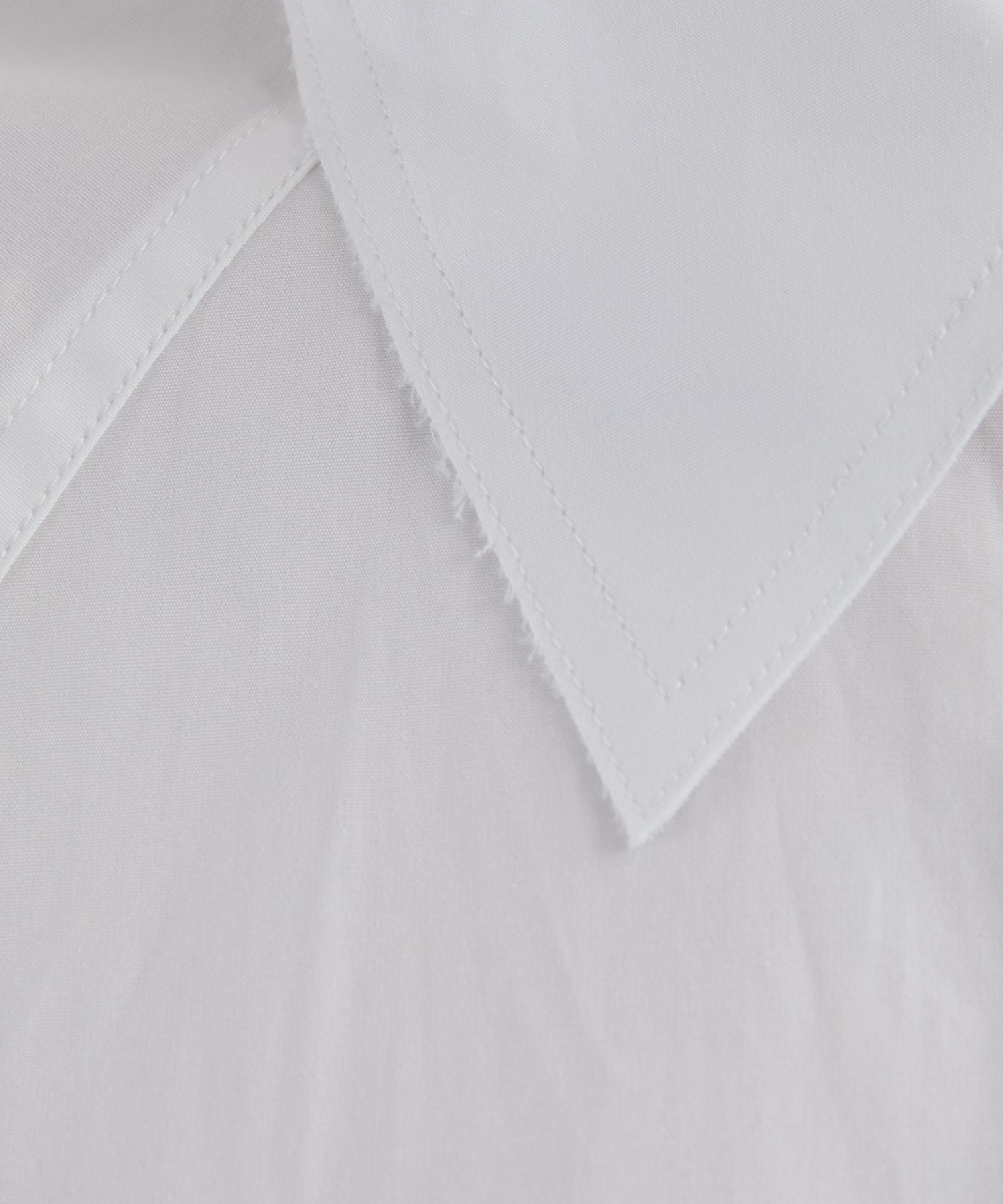 Applying their contemporary approach to classic shirting, this white shirt has been cut from lightweight cotton poplin for an oversized fit, and features a boxy silhouette framed with batwing-style raglan sleeves, a mother of pearl front button closure, a raw-edged collar and cuffs, and long curved hems for a relaxed finish.