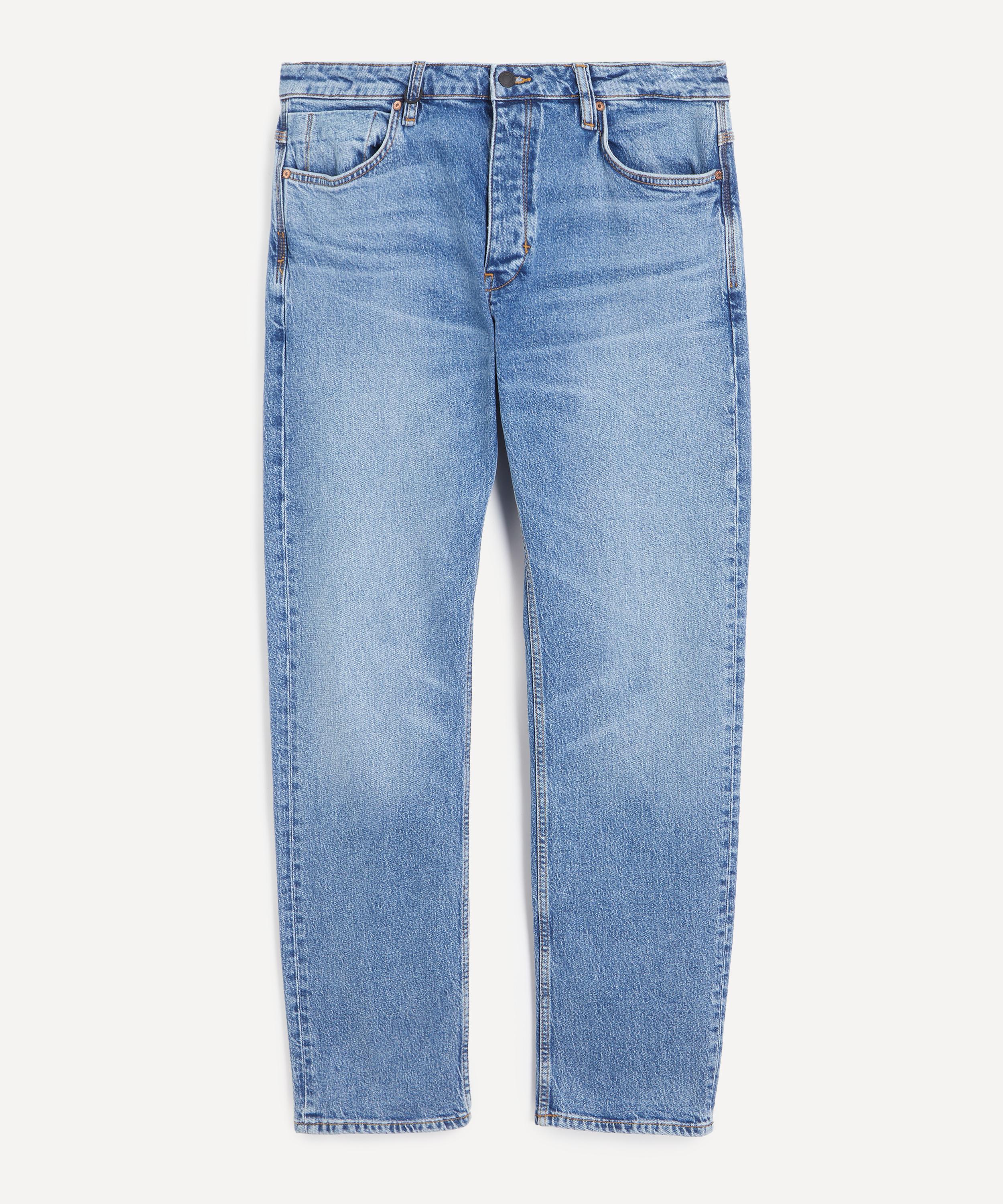 Cut from a subtle stretch denim fabric for a comfortable fit, these timeless jeans feature a modern straight leg with a subtle taper, and a vintange workwear inspired top block. Finished with a signature fob ring and a heavy-wash indigo hue, enhancing their classic appeal.