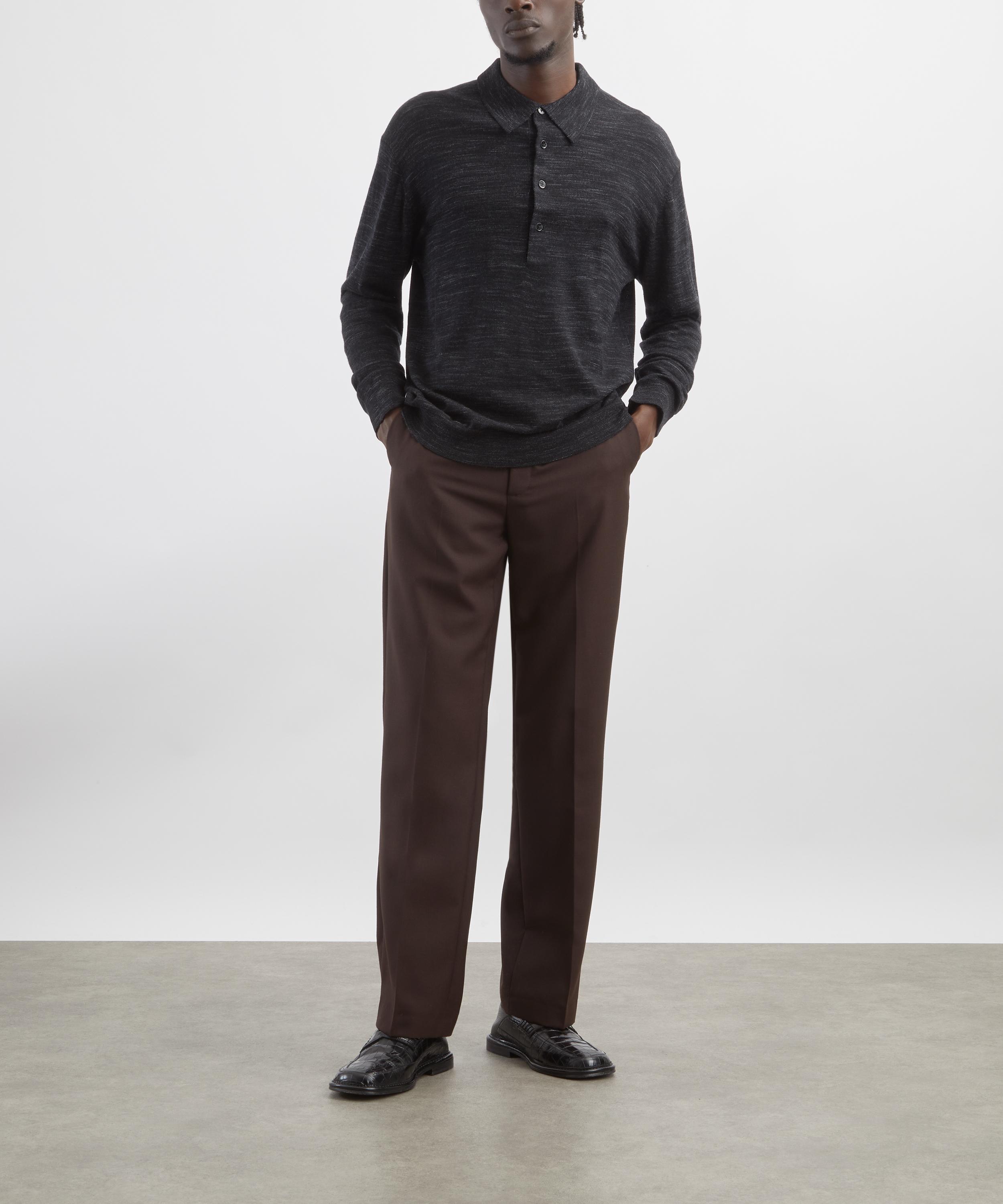 Finely woven from soft wool yarn to create a subtle mottled stripe effect, this long-sleeve polo features a relaxed fit, a flat-knit collar, and a partial button placket finished with mother-of-pearl buttons.