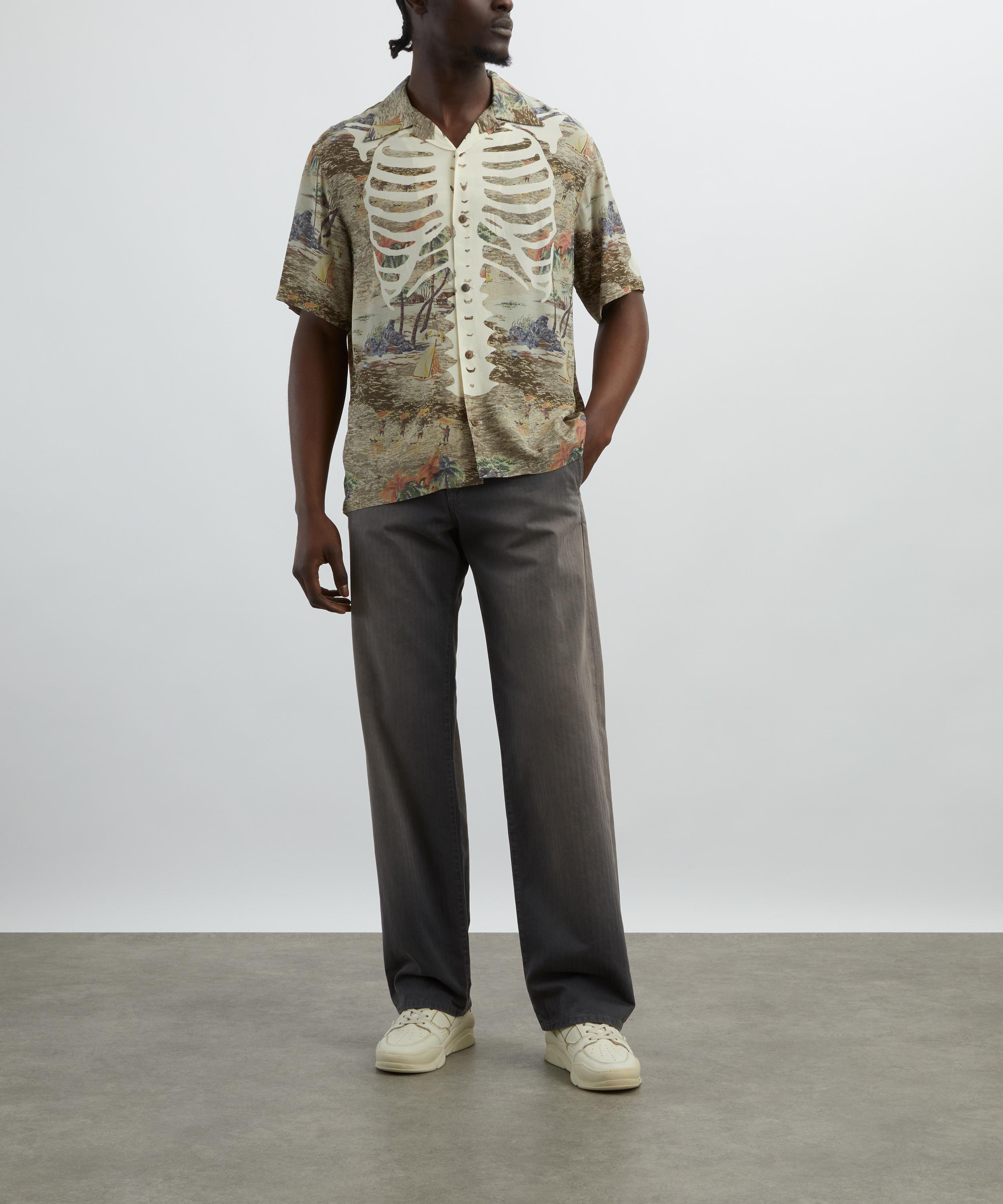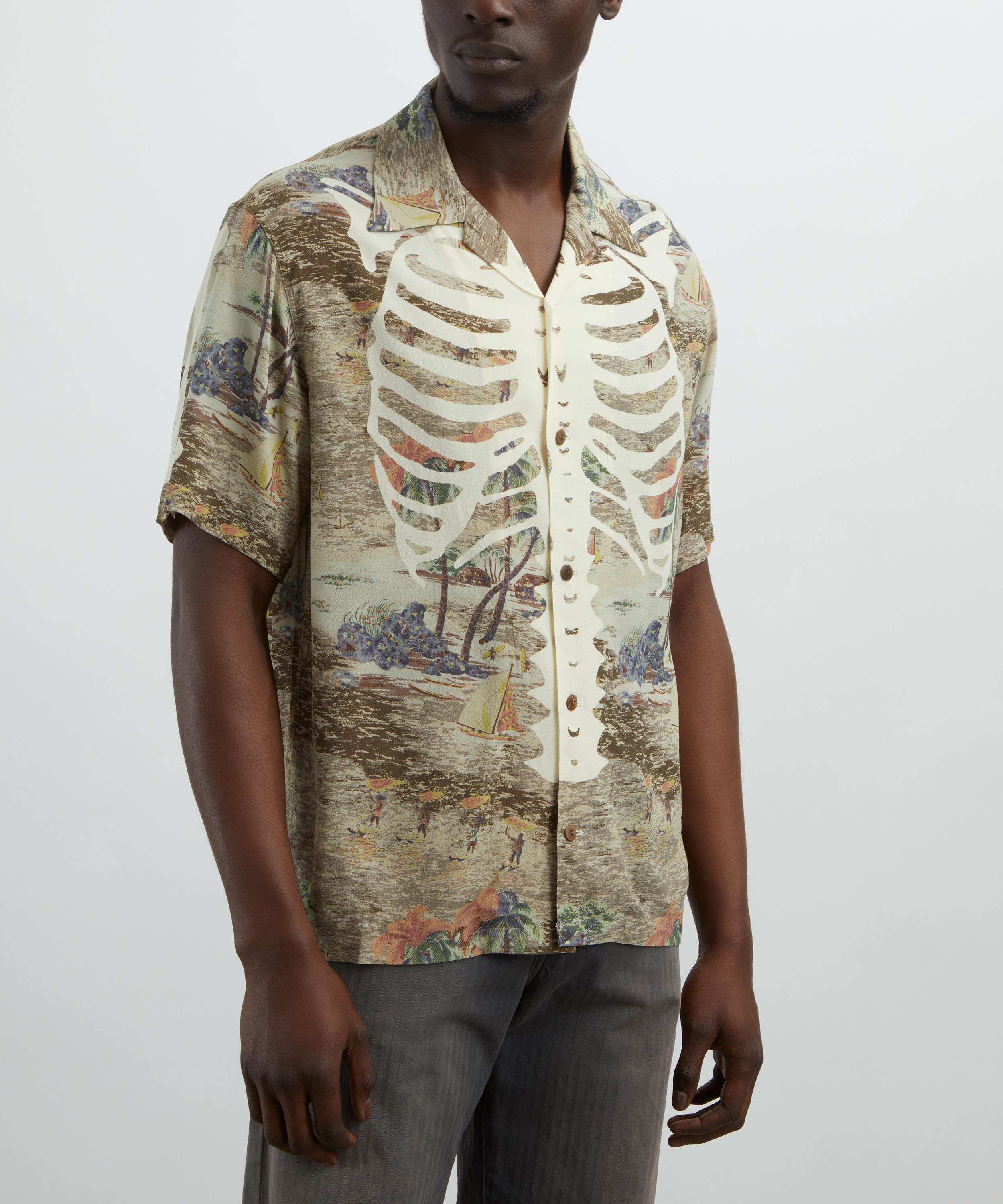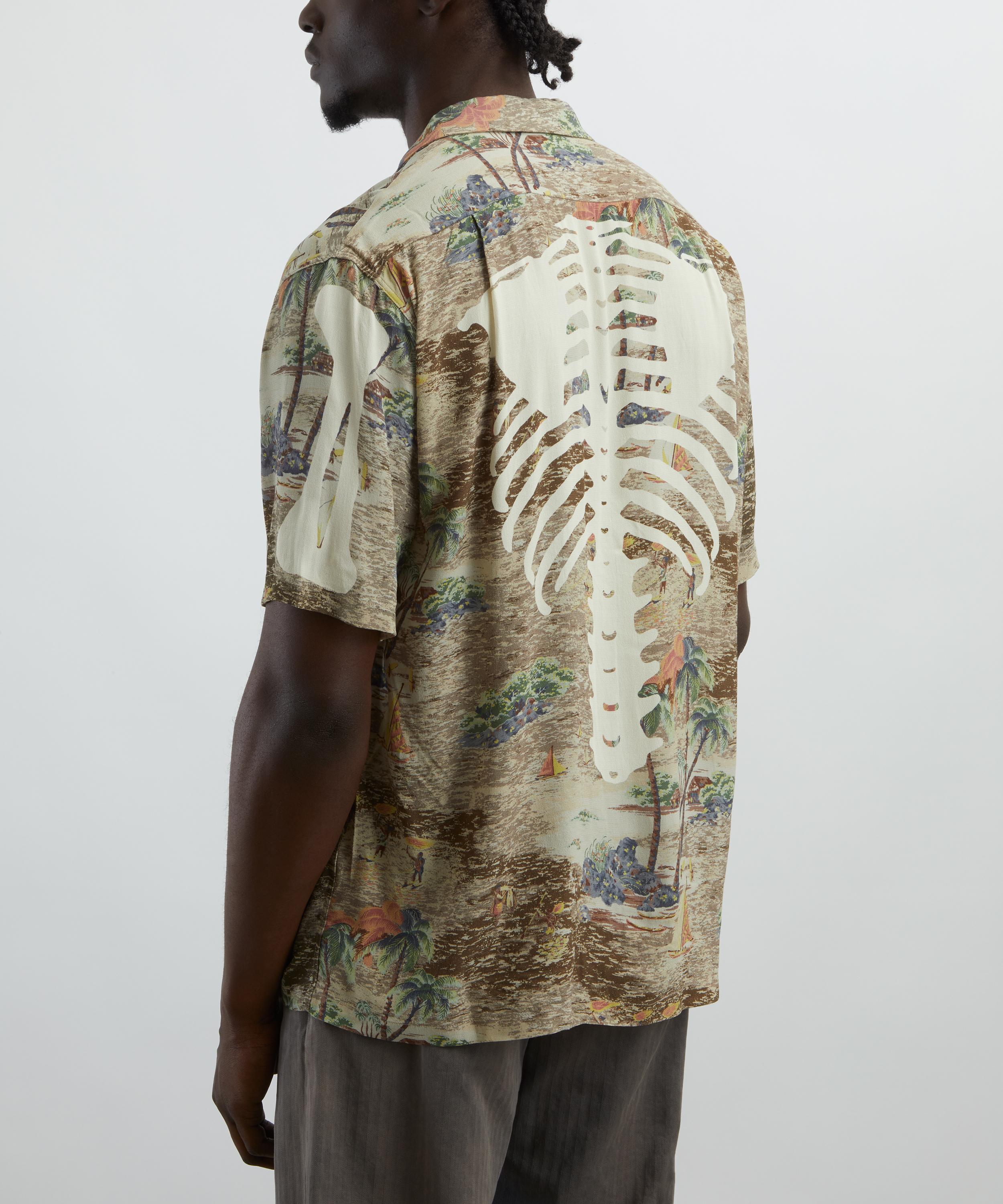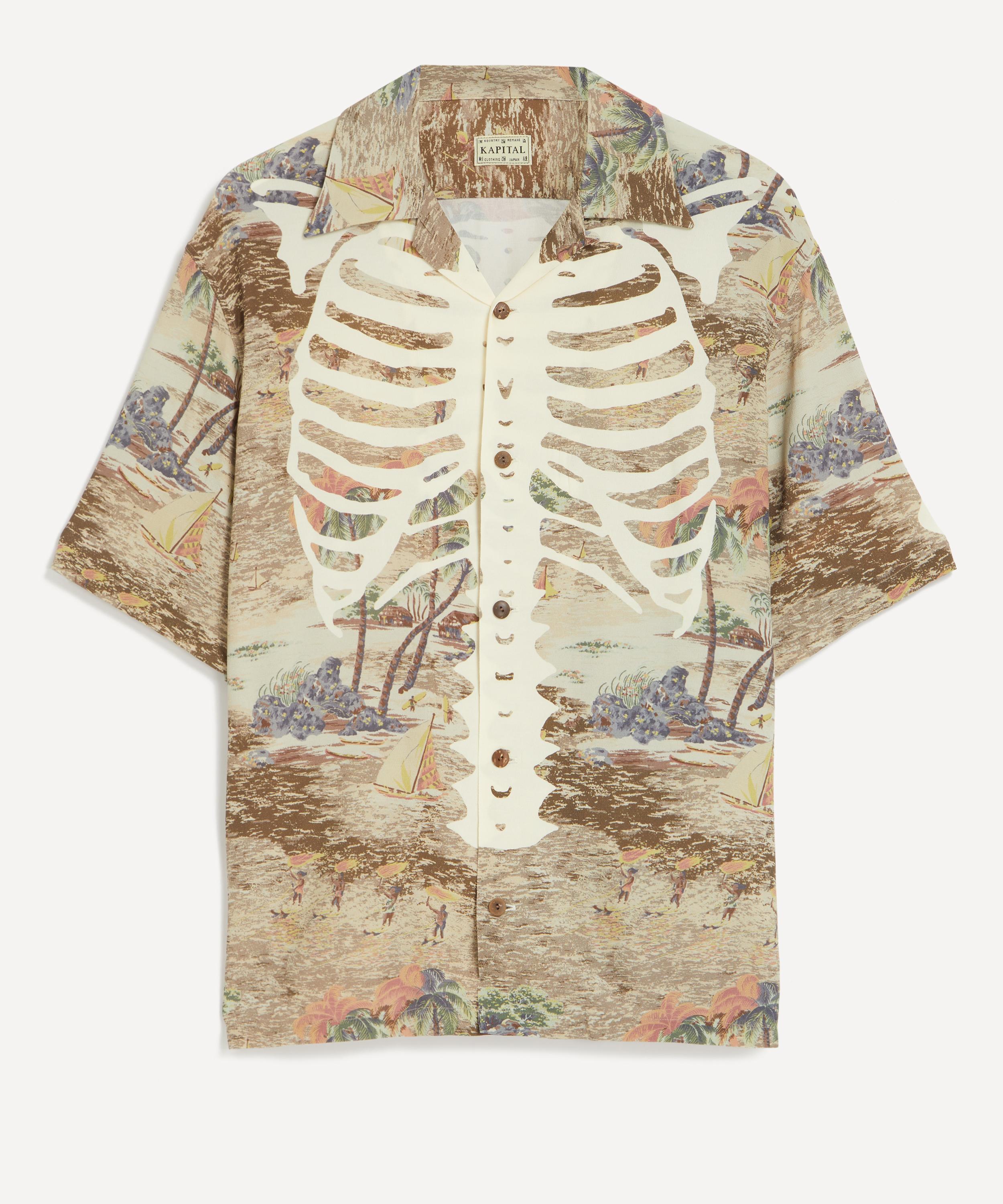 The Rayon KAMEKAMEHA BONE Aloha Shirt from cult Japanese label KAPITAL is designed with a modern, streetwear-inspired aesthetic.