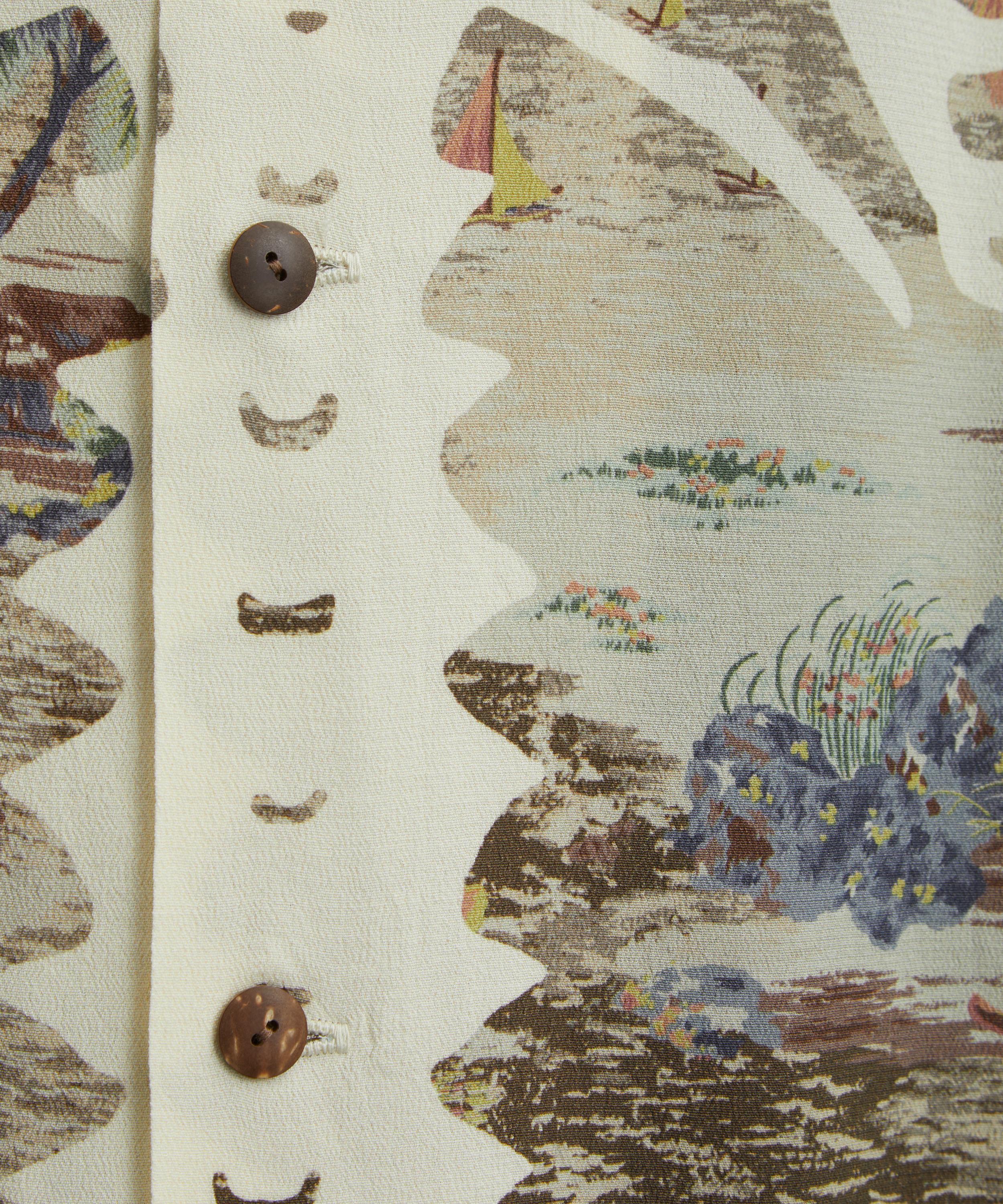 Made in Japan from lightweight rayon, the Aloha Shirt features a scenic island print and a relaxed fit, perfect for warm-weather ease. Designed with a Cuban collar and short sleeves, it’s finished with Kapital’s signature BONE intarsia across the front for a distinctive touch.