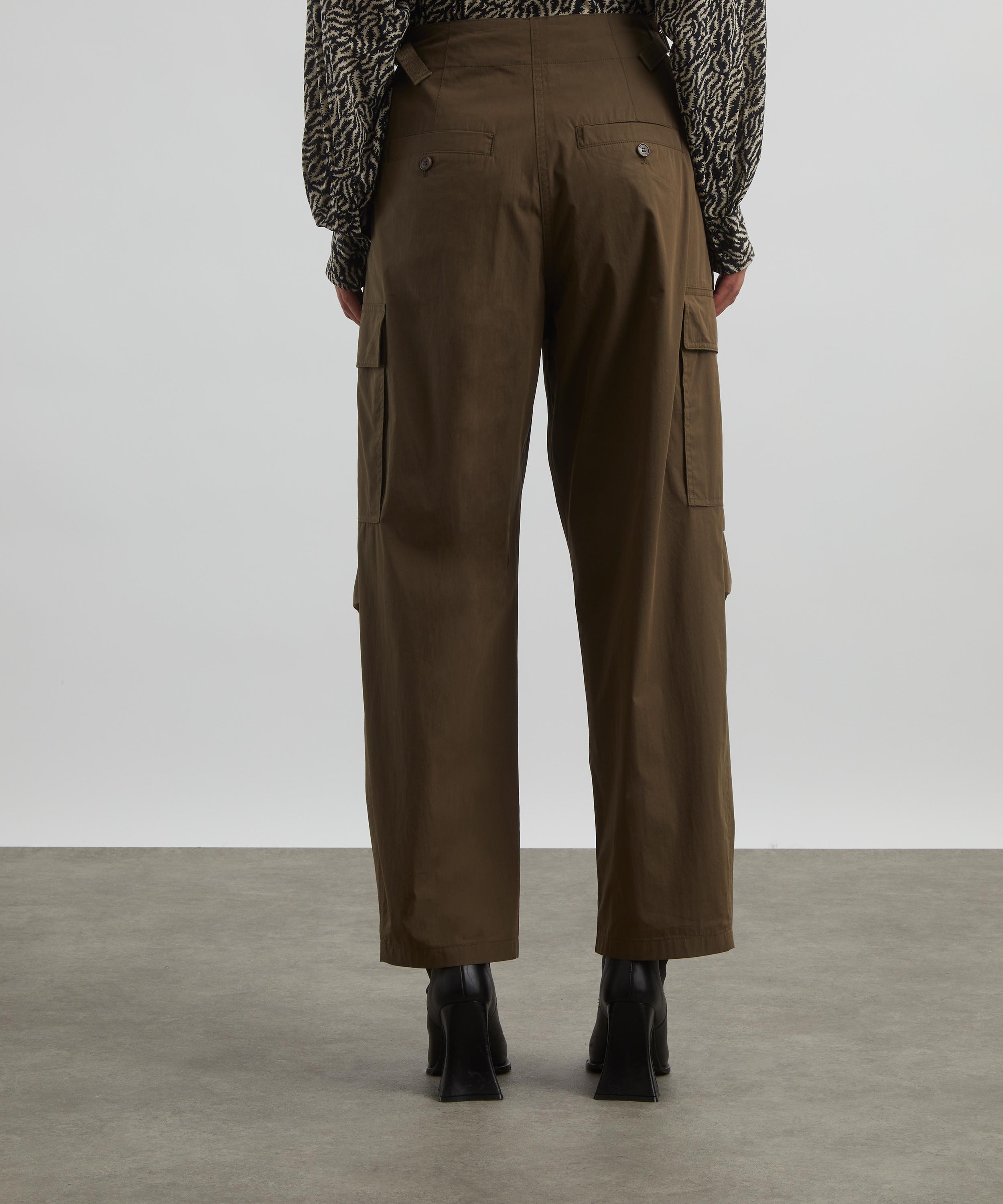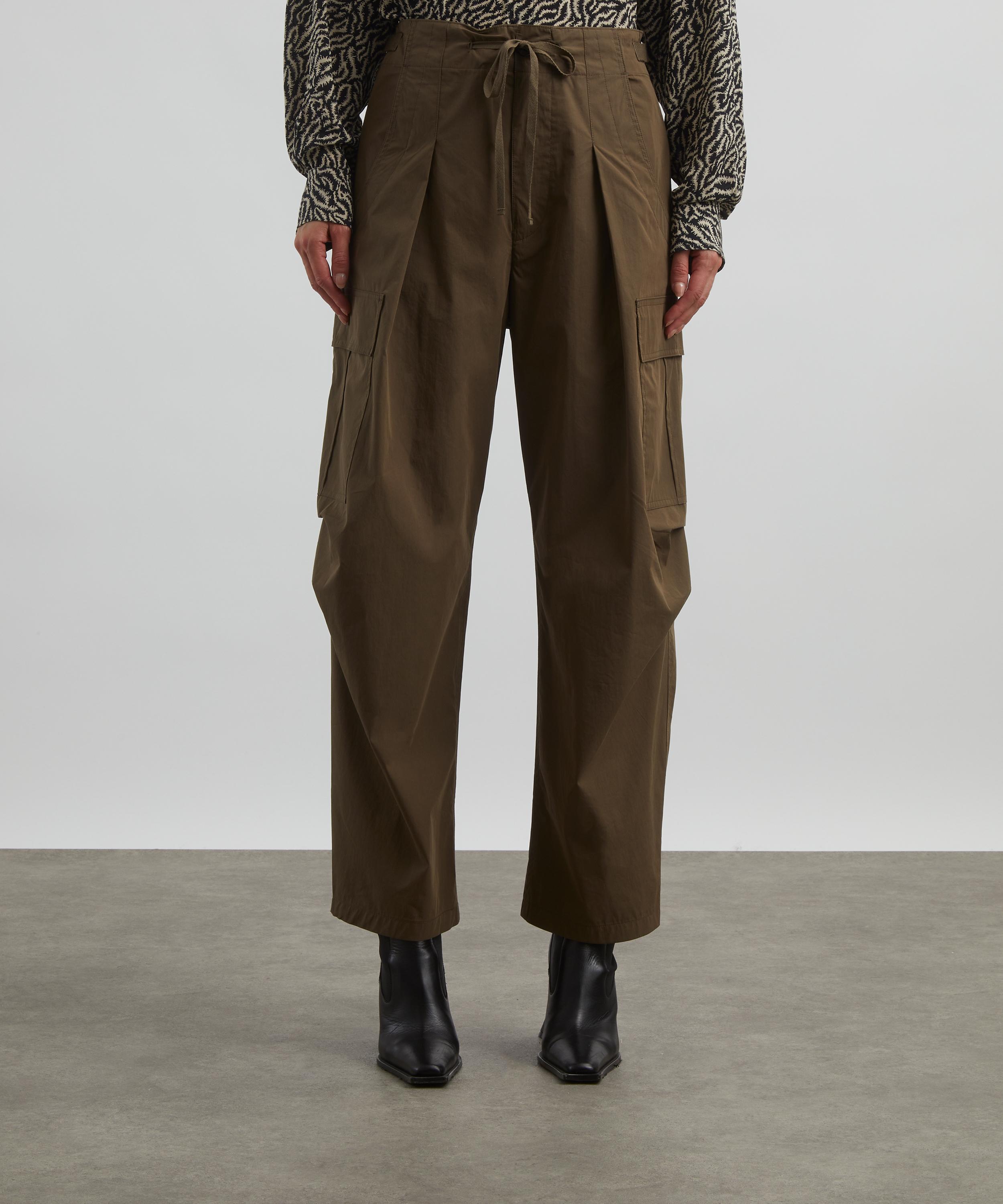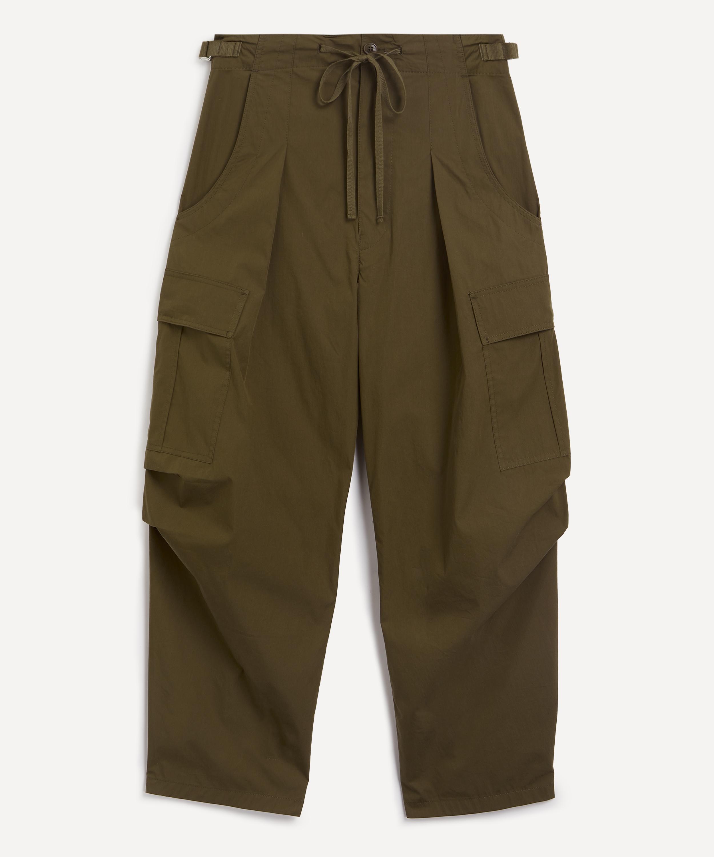 Woven from a khaki cotton blend throughout, these trousers are secured at the waist with drawstring ties and adjustable waist tabs for the perfect fit. Complete with multiple, cargo-style pockets to the sides and back, they’re detailed with pleating for a tailored finish.