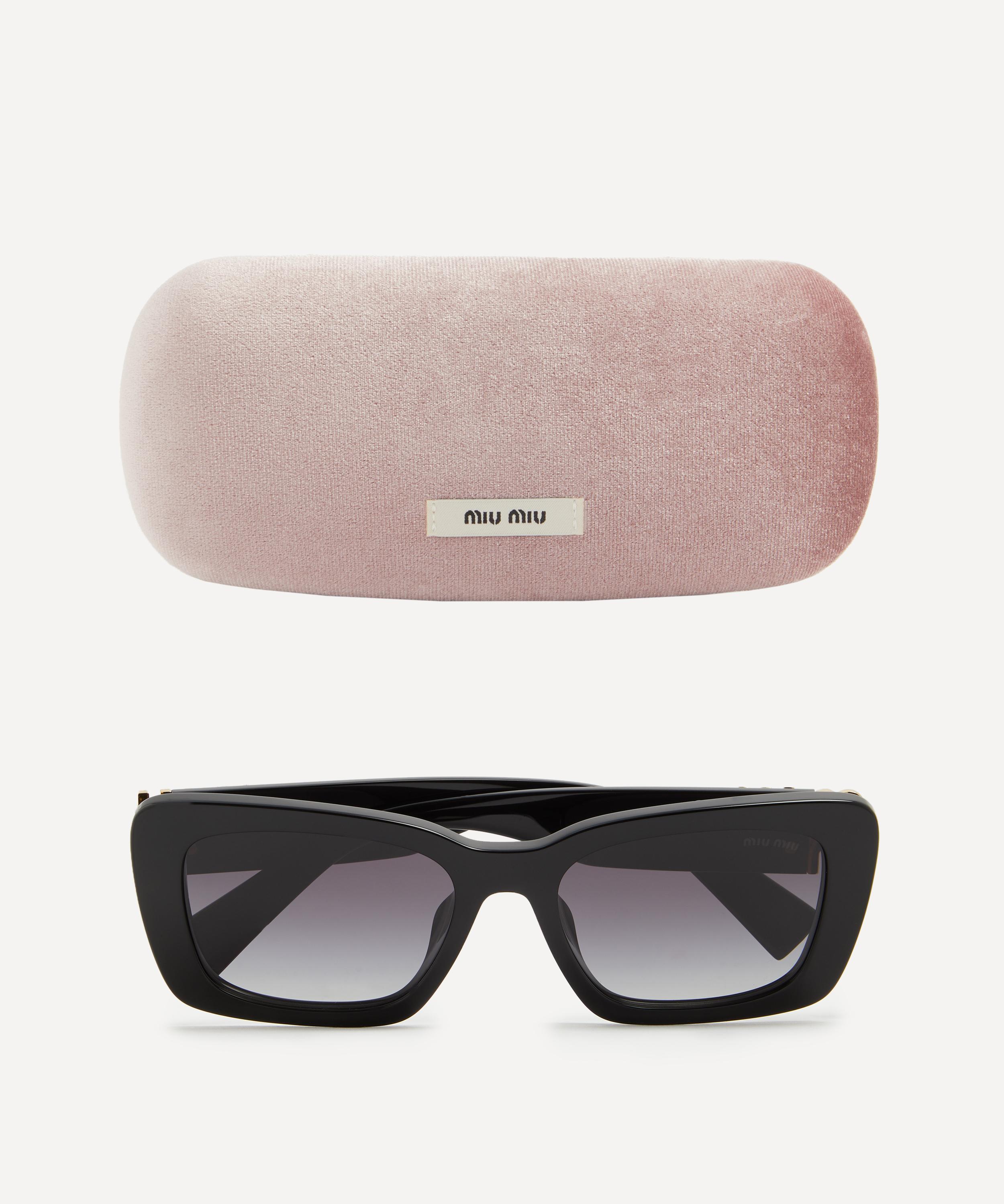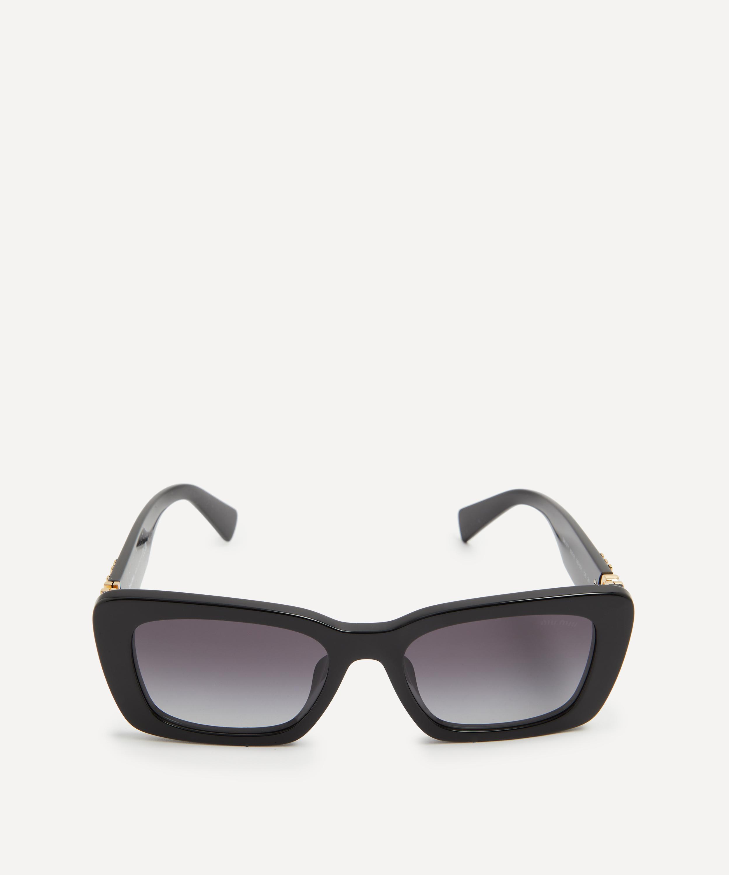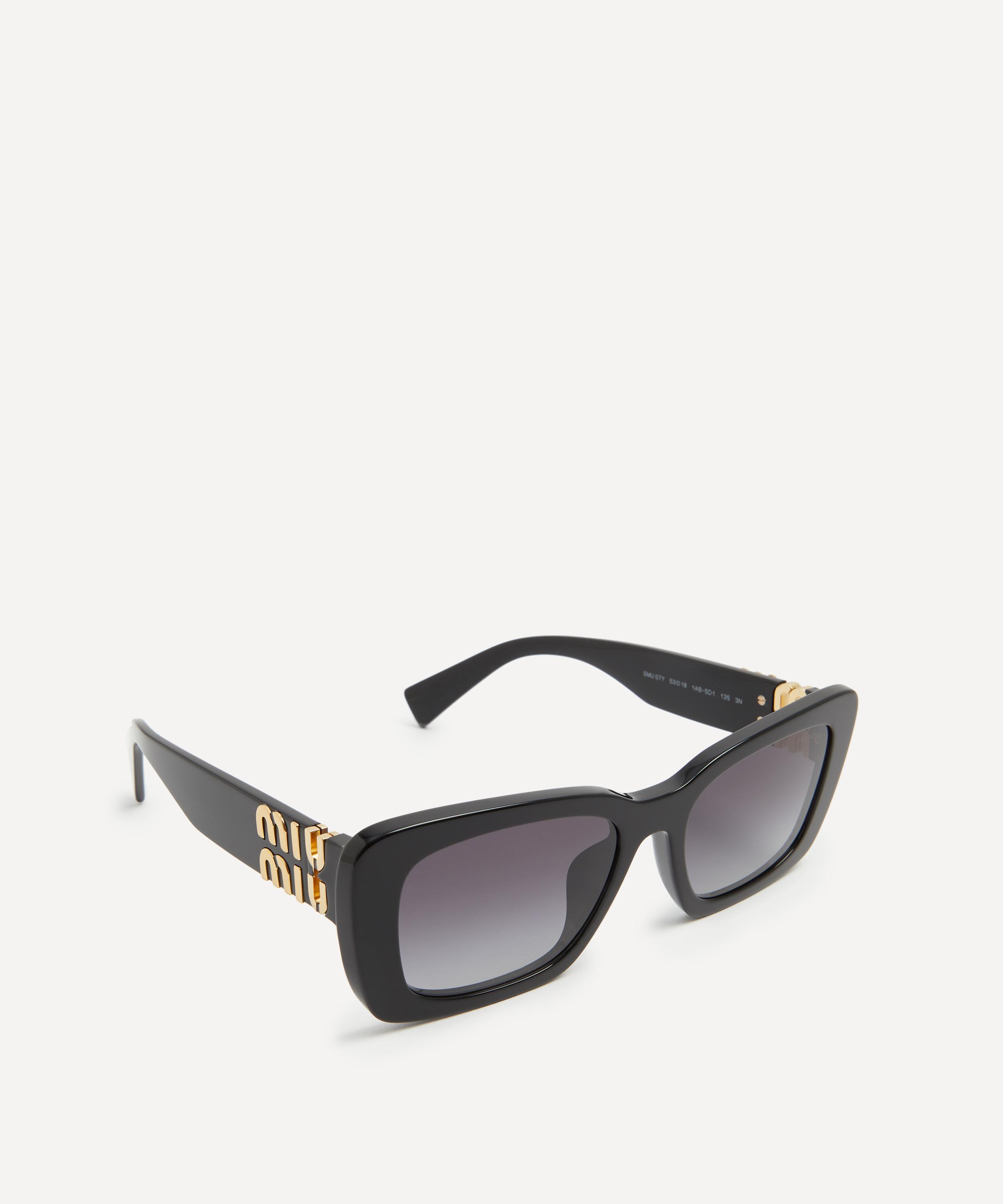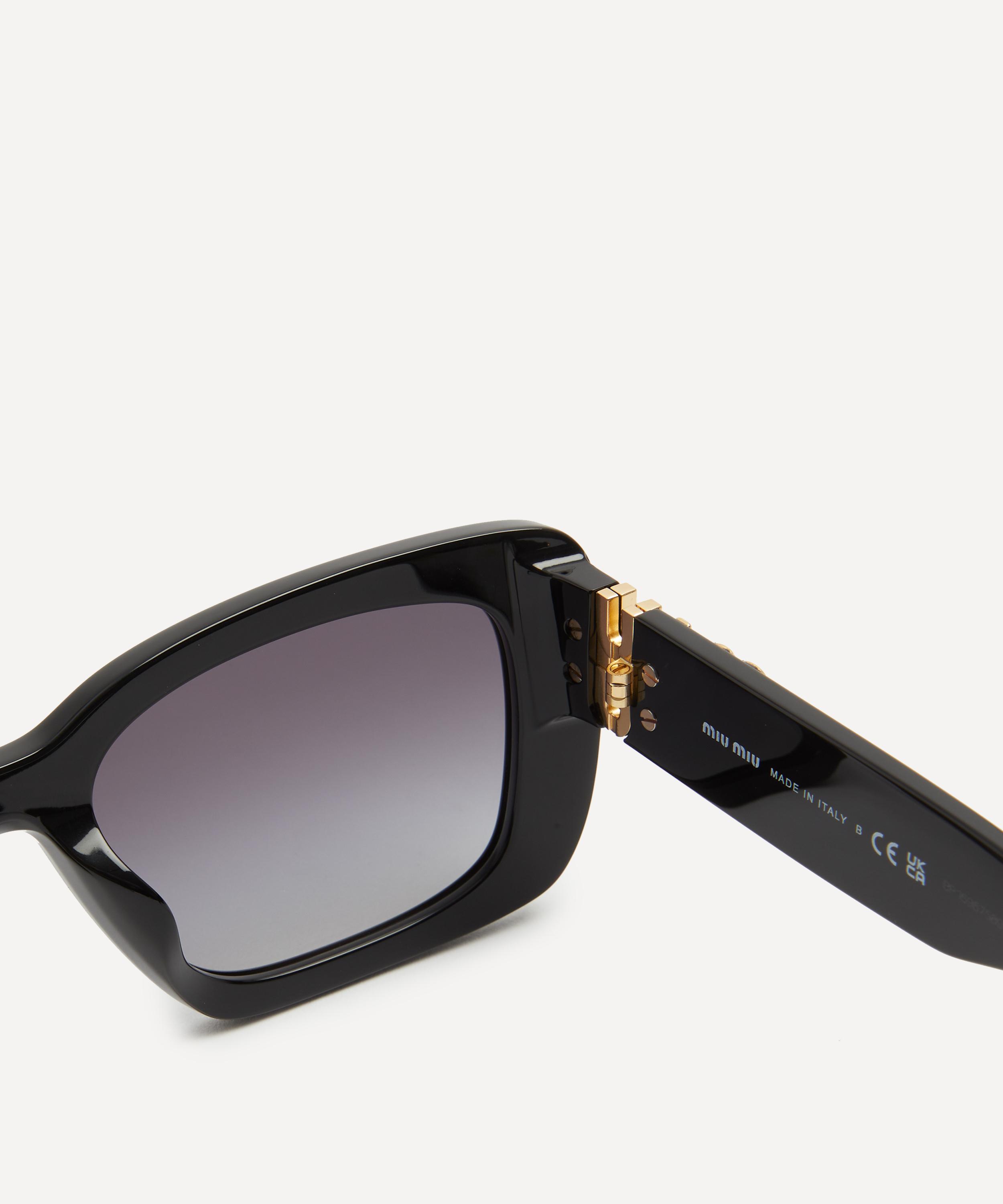 Heighten the impact of any attire with these rectangle sunglasses from Miu Miu. Expertly crafted from black acetate, to create a statement pair that instantly draws the eye, these sunnies are fitted with a saddle nose bridge and grey gradient lenses to shade and protect your eyes from UV light. Complete with the signature branding at the temples, they make for an ultra-chic finish to your curated looks.