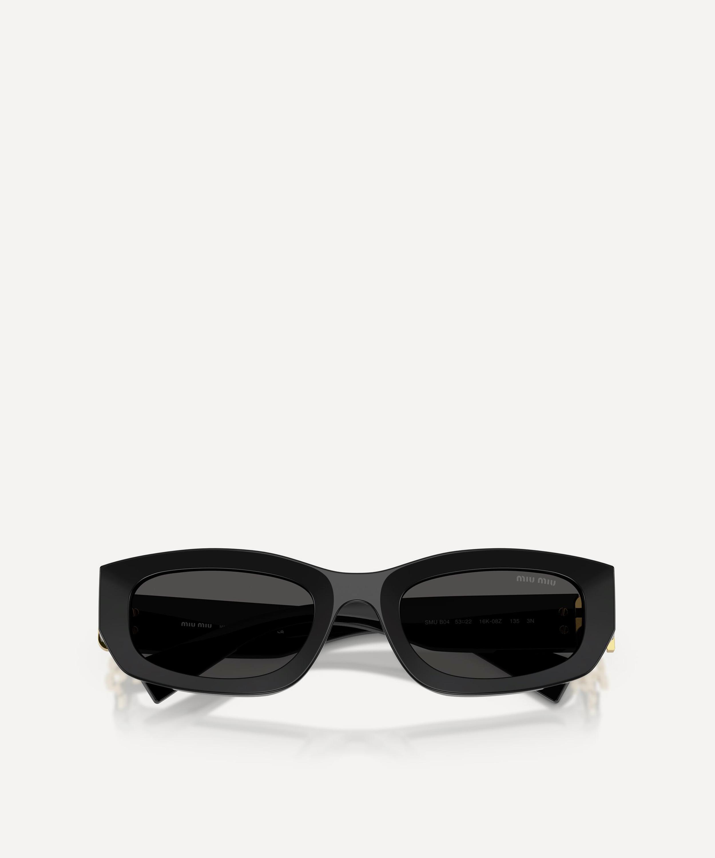 Heighten the impact of any attire with these rectangle sunglasses from Miu Miu. Expertly crafted from black acetate, to create a statement pair that instantly draws the eye, these sunnies are fitted with a comfortable saddle nose bridge and dark grey lenses to shade and protect your eyes from UV light. Complete with signature branding at the temples, they make for an ultra-chic finish to your curated looks.
