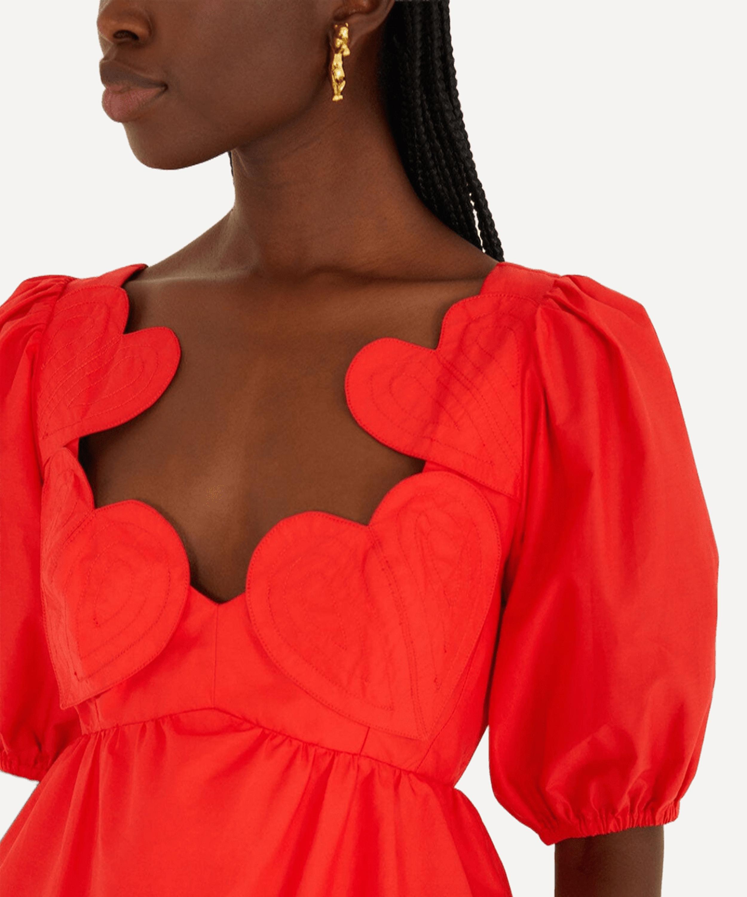 The Red Heart Blouse features crisp cotton, puff sleeves, an empire waist, and a heart-adorned deep V neckline for effortless romance.