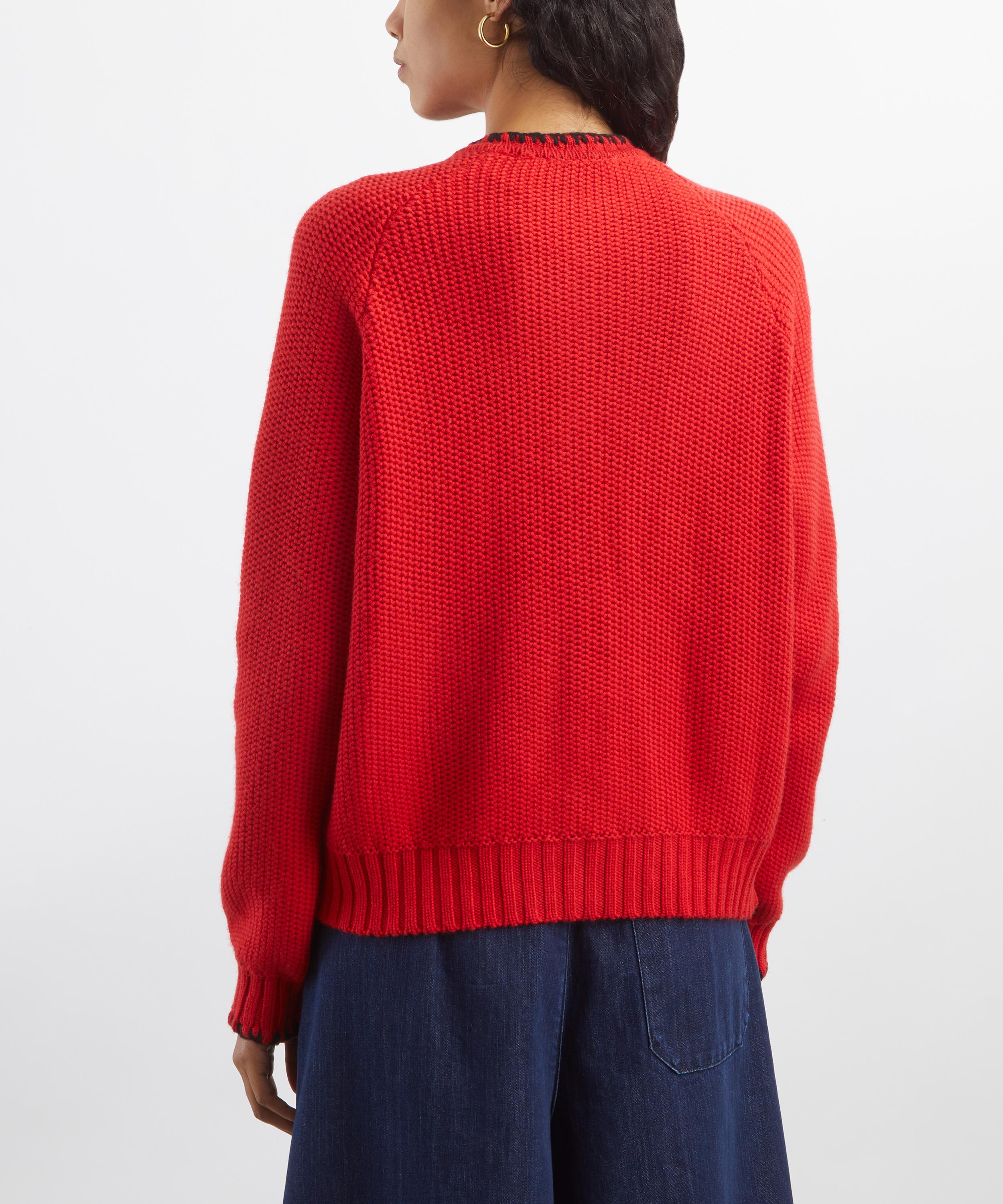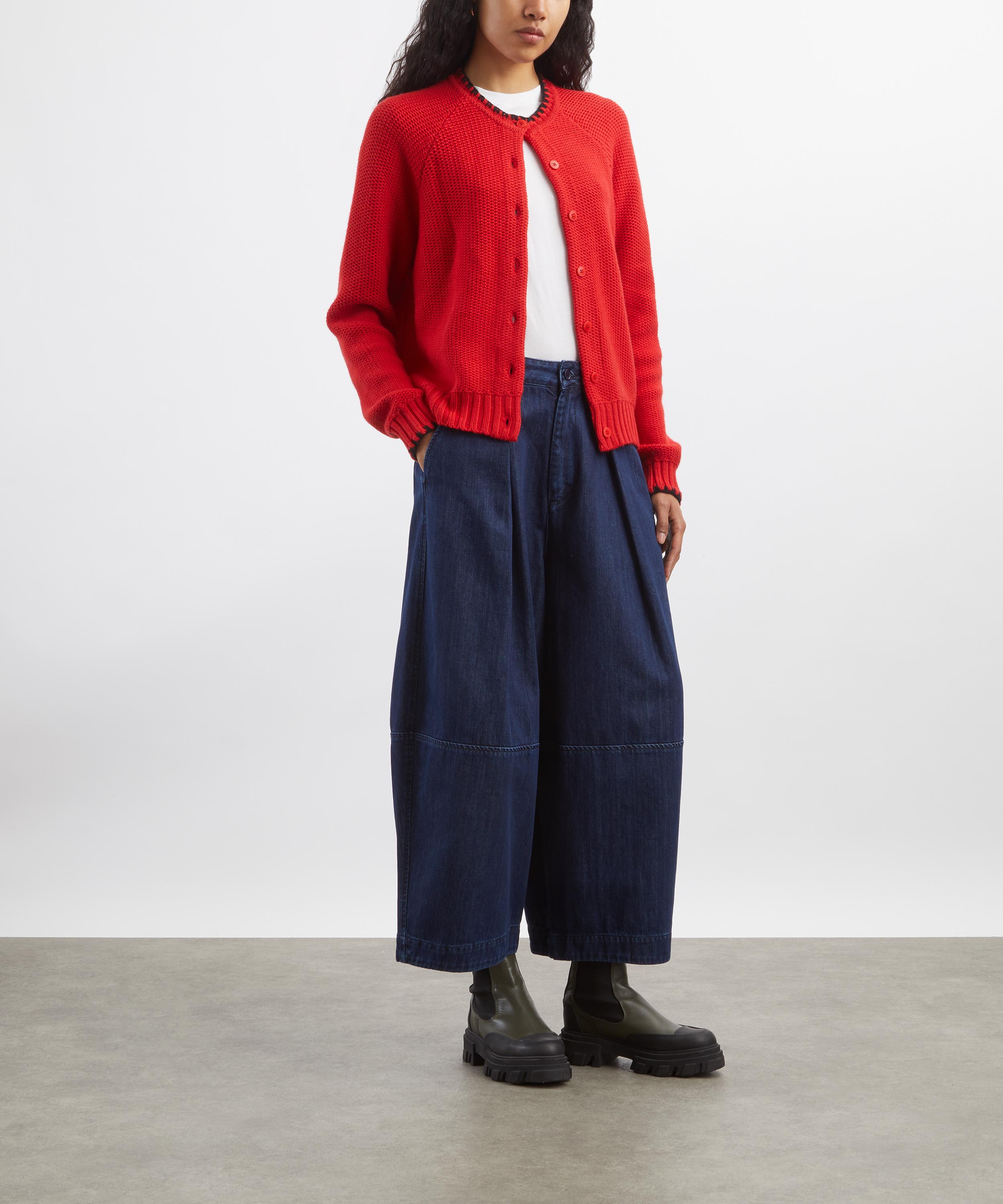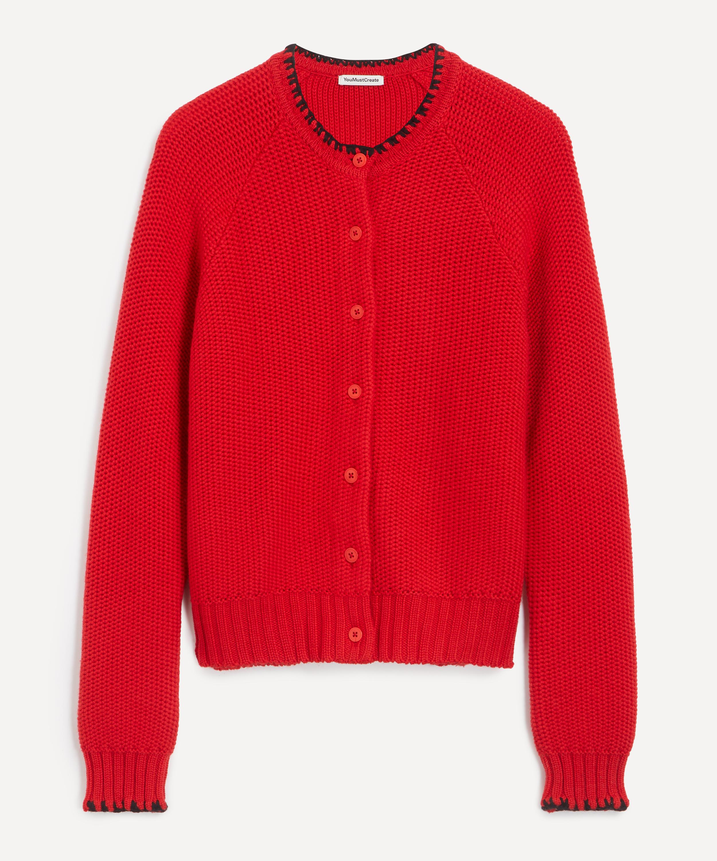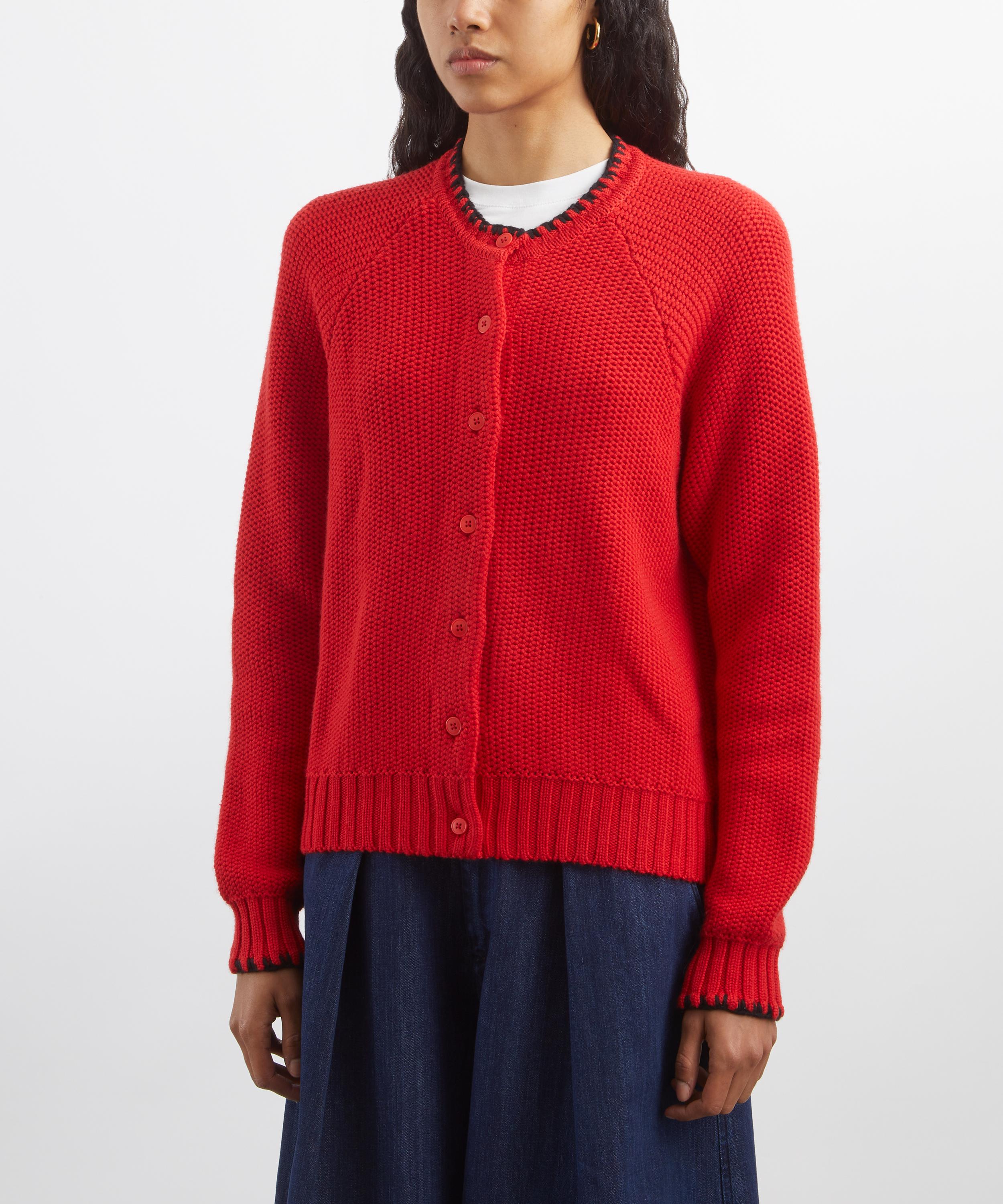 Crafted from a soft lambswool-blend yarn in red, the Lotus cardigan features a relaxed fit, round neckline, raglan sleeves, and corozo button fastening. Finished with rib-knit trims and black blanket–stitched edges, it delivers a relaxed, cosy feel with subtle texture and warmth.