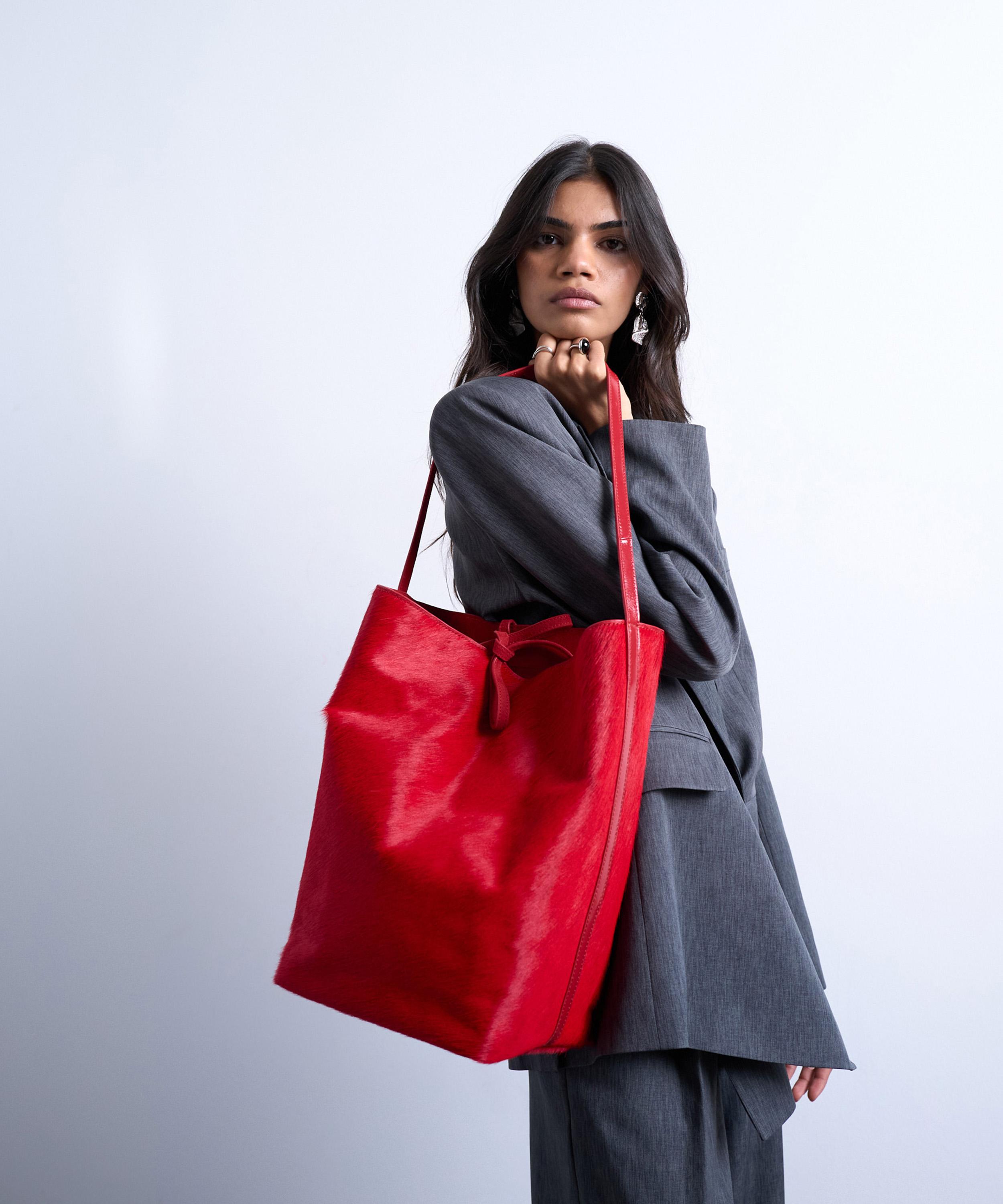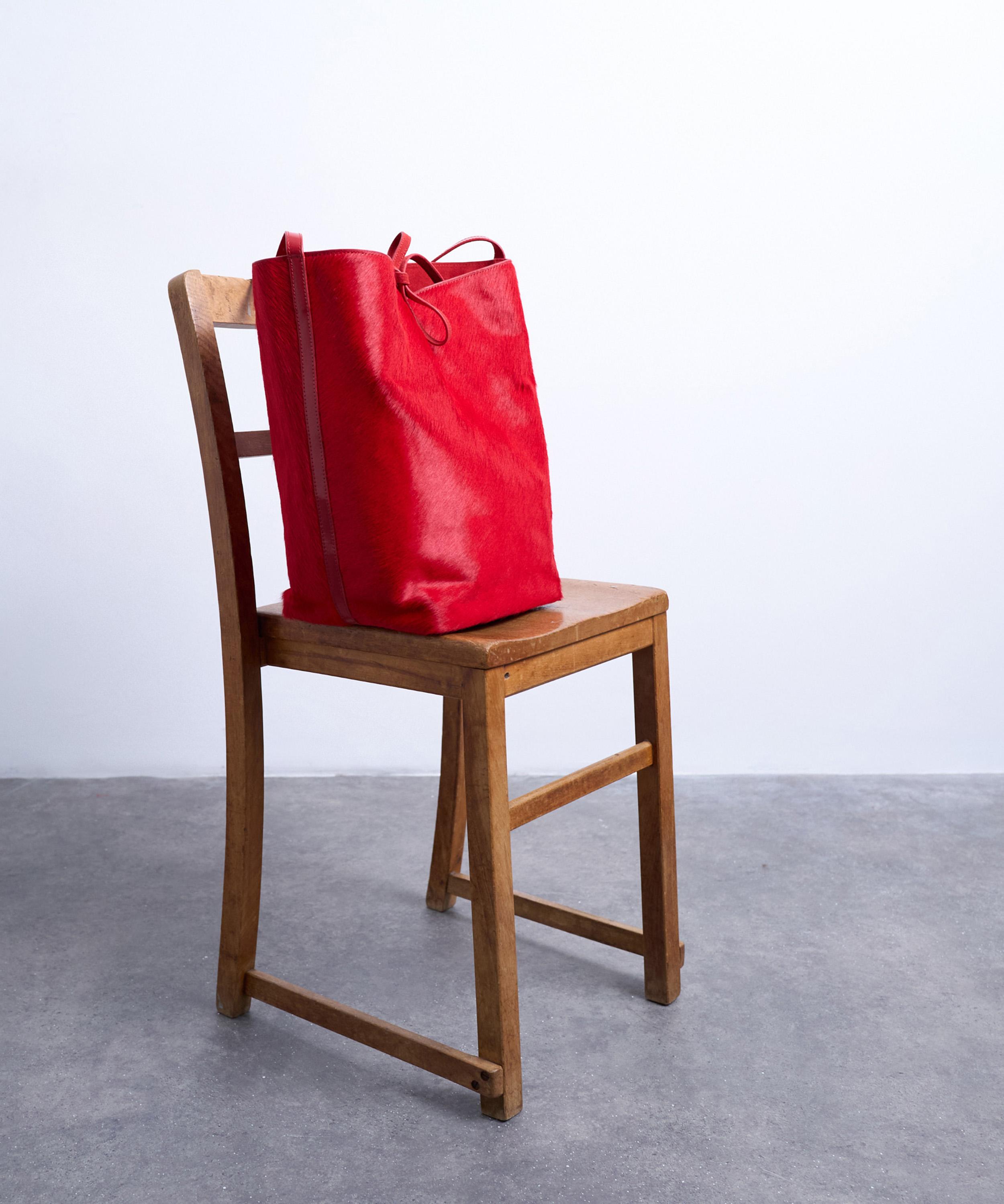 Crafted from pure suede with a tactile, hairy finish in vibrant red, the Luna tote bag features a flat base, two shoulder streets, and a tie fastening for easy access - perfect for carrying all your essentials in style.