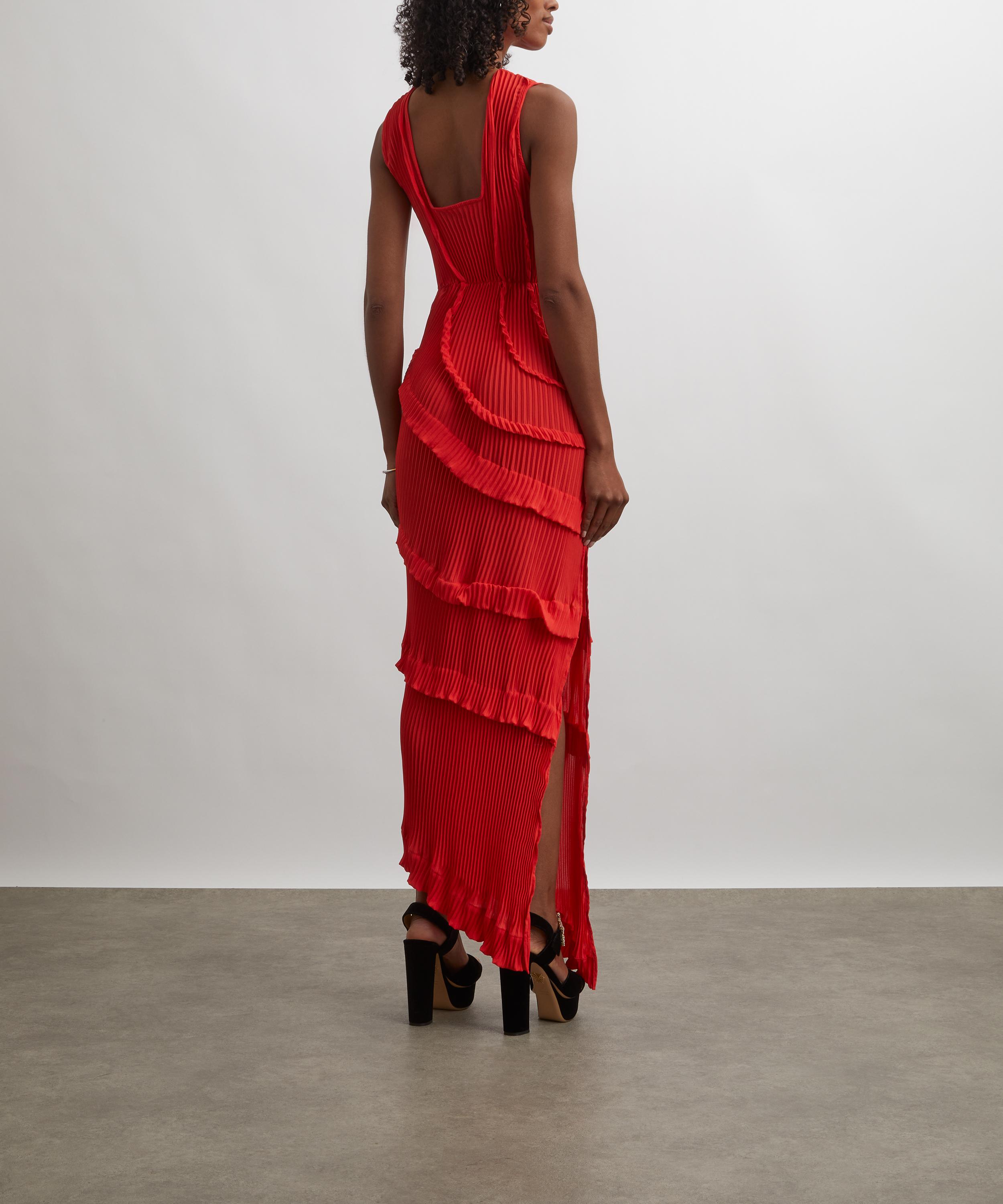 A bold expression of modern elegance, this floor-length red dress captivates with all-over pleating and sculptural tucks that swirl in a circular motion across the body. Effortlessly flattering, a gathered side panel artfully cinches the waist, while a side slit adds fluidity and ease of movement.