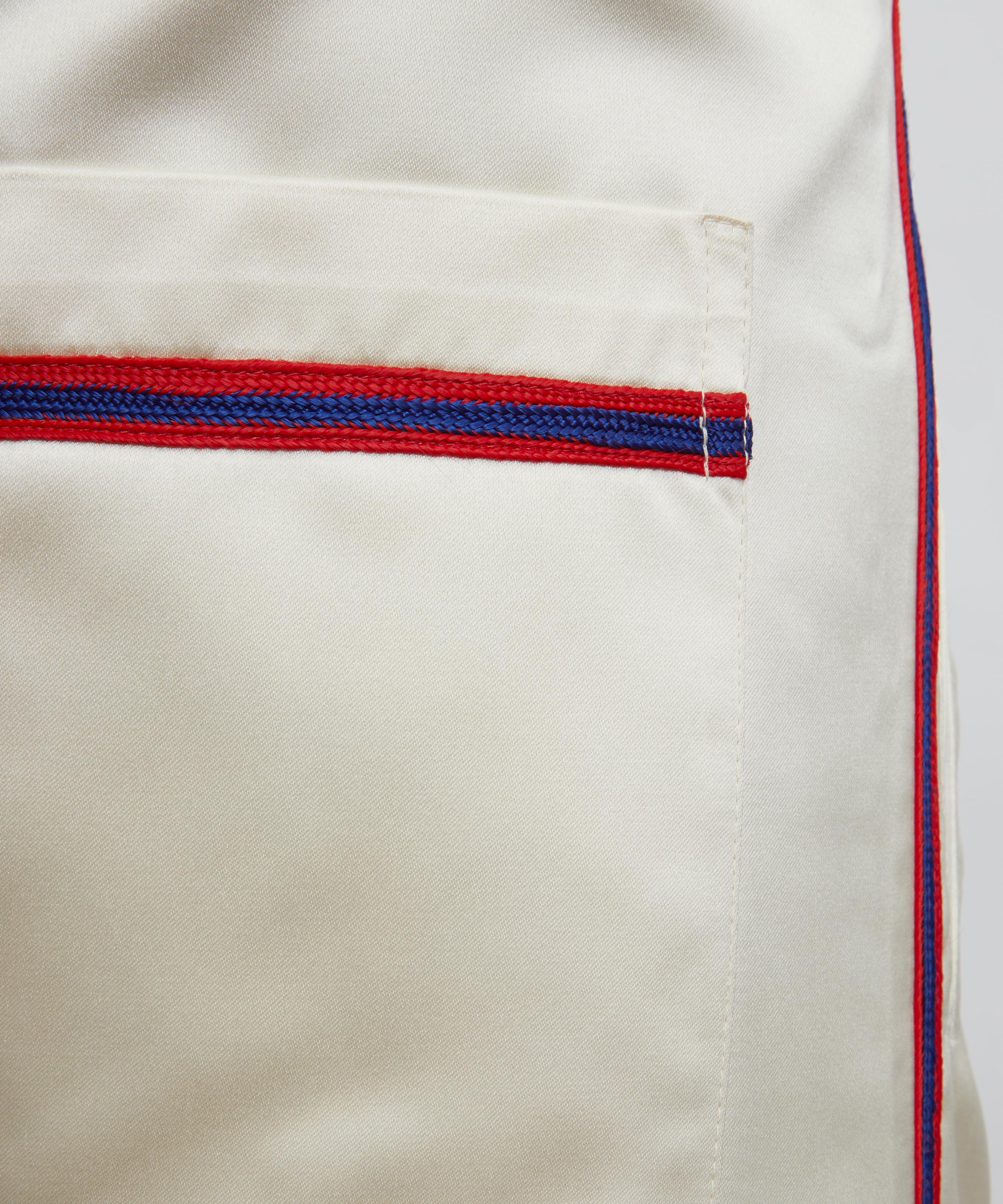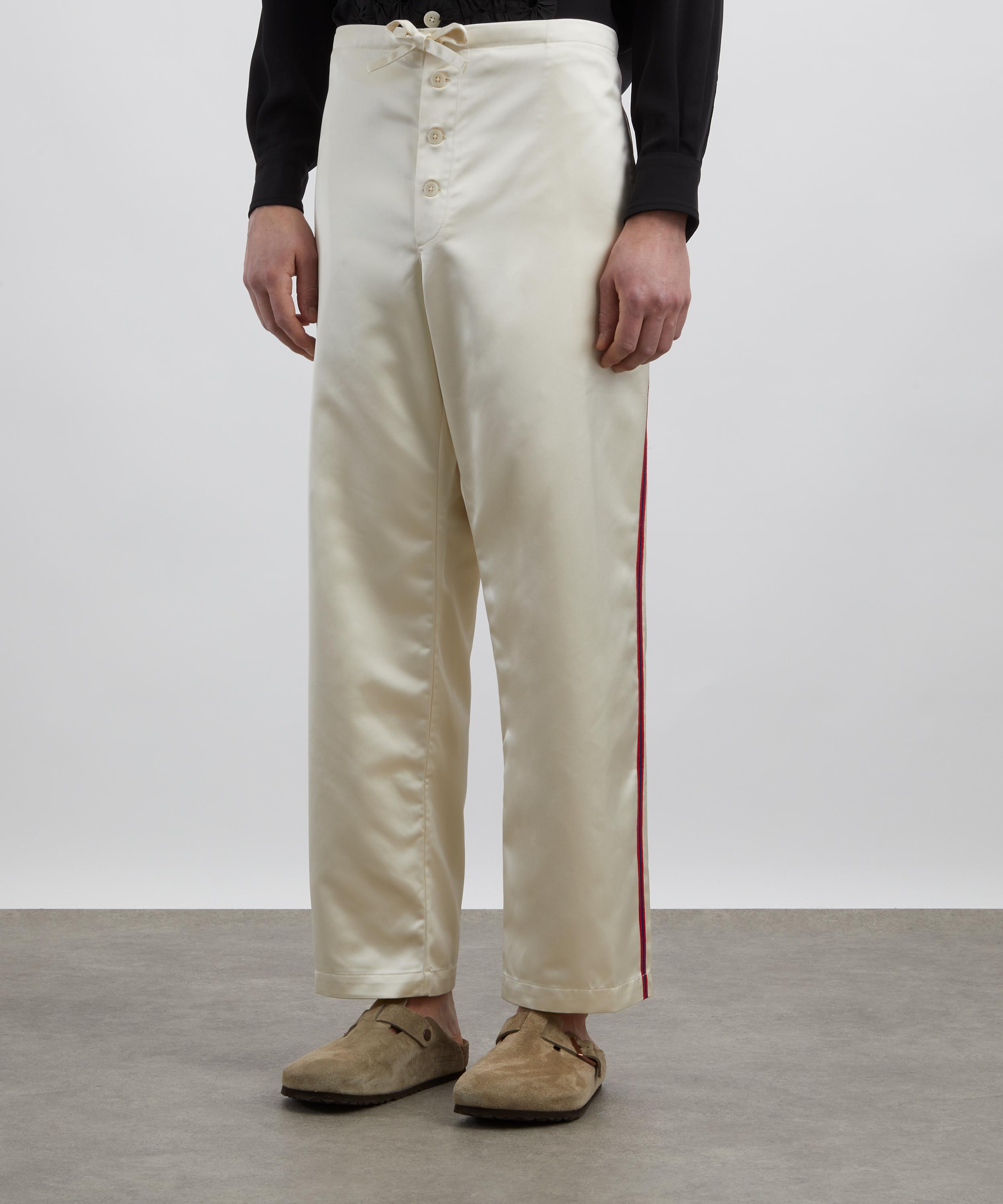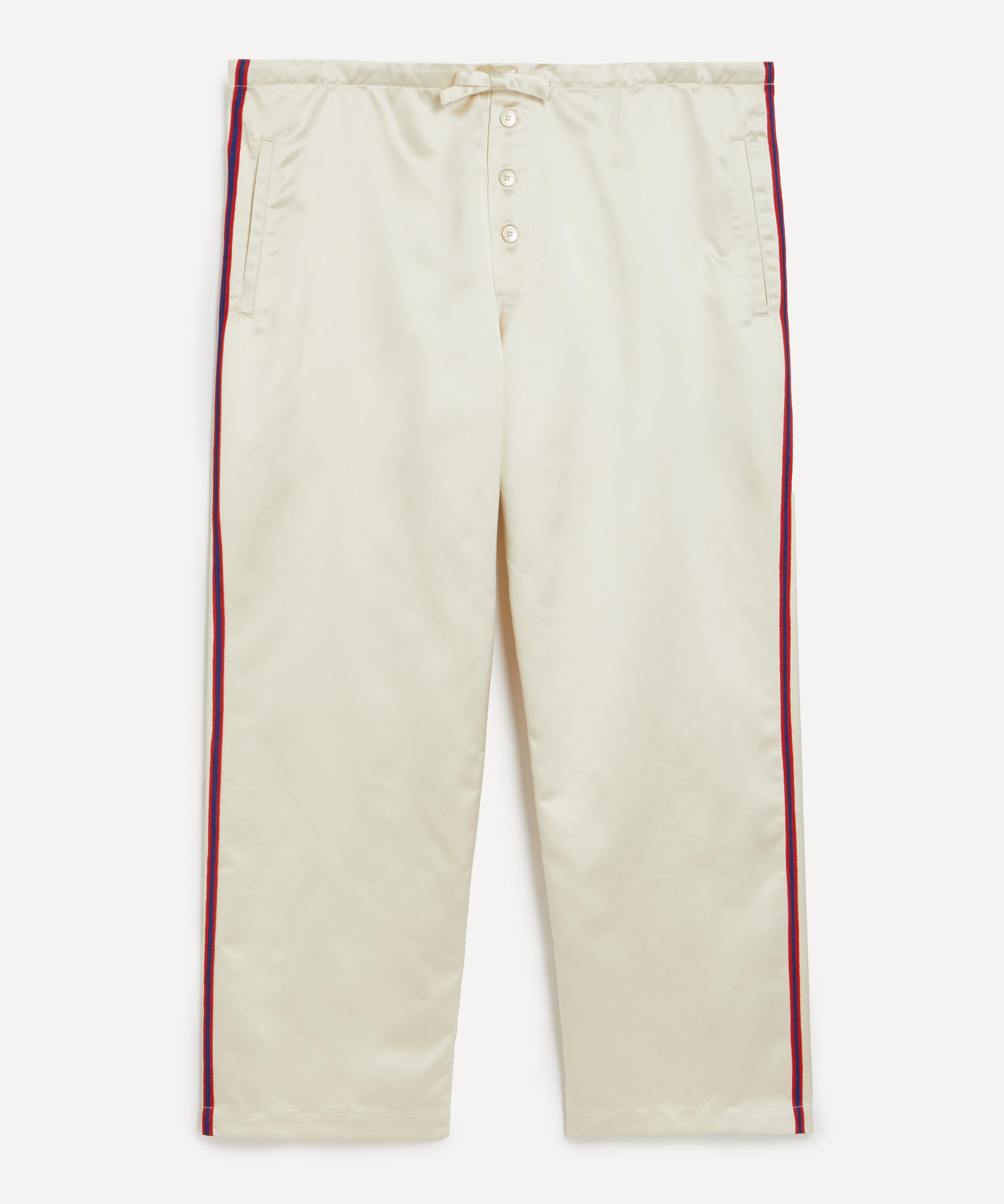Inspired by a 1960s printed baseball uniform, these pyjama-style trousers are crafted from a midweight satin weave. Featuring a drawstring waist, they are accented with contrast side trims, adding a sporty touch to the design.