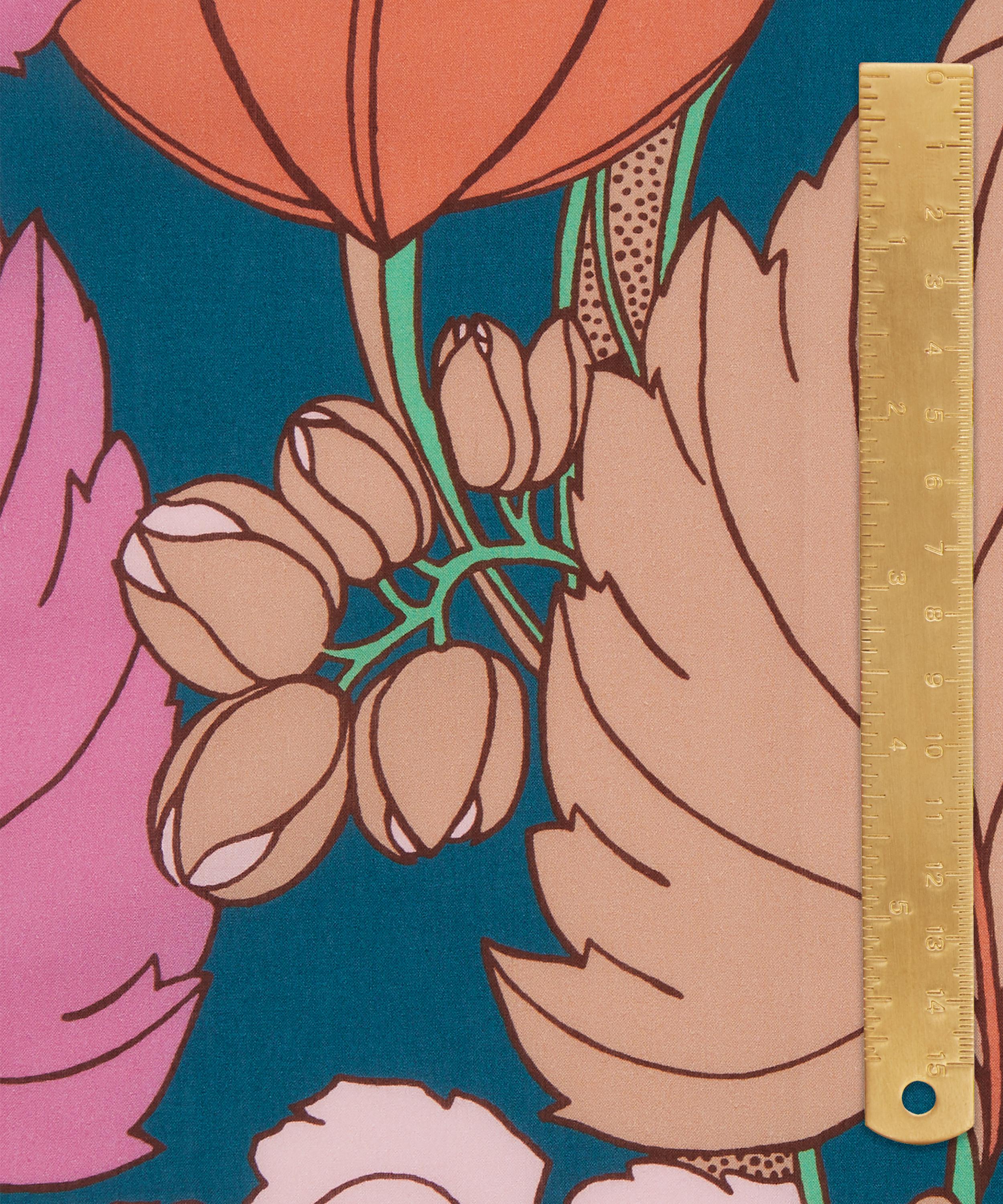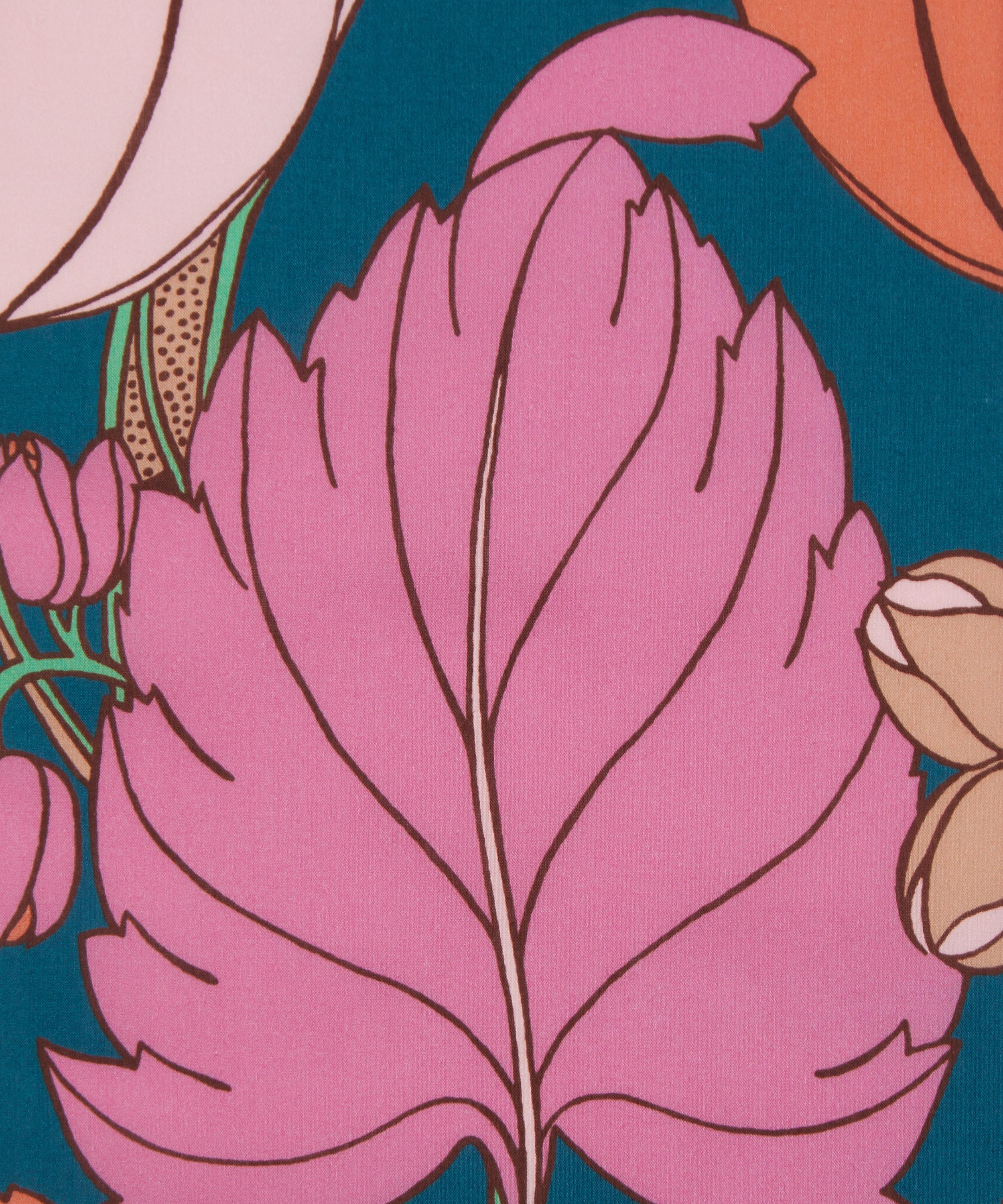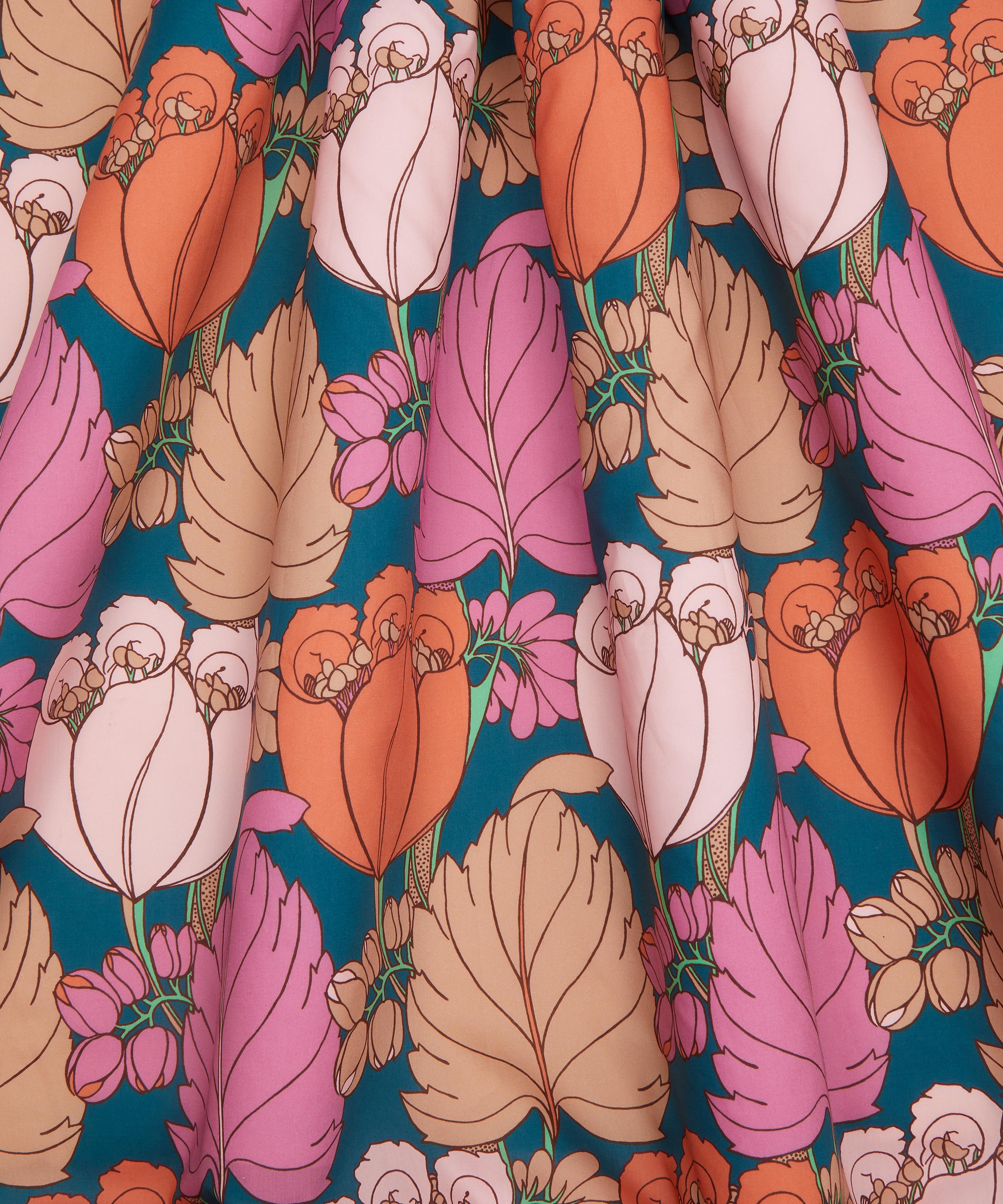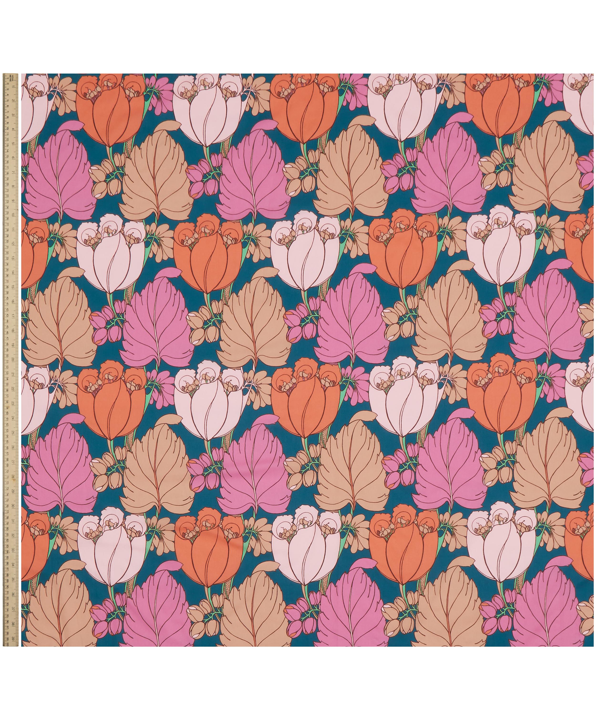 Regency Petals was originally designed as a Liberty furnishing fabric in 1966, during the height of the late 1960s Art Nouveau revival. Blending period elegance with a bold, retro edge, this luxurious design features stylised tulips, delicate flower buds, and graceful leaves, arranged in a balanced, symmetrical composition. Drawing from the refined aesthetic of Regency-era gentleman’s clubs, its bold areas of flat colour create a look both sophisticated and sartorial.