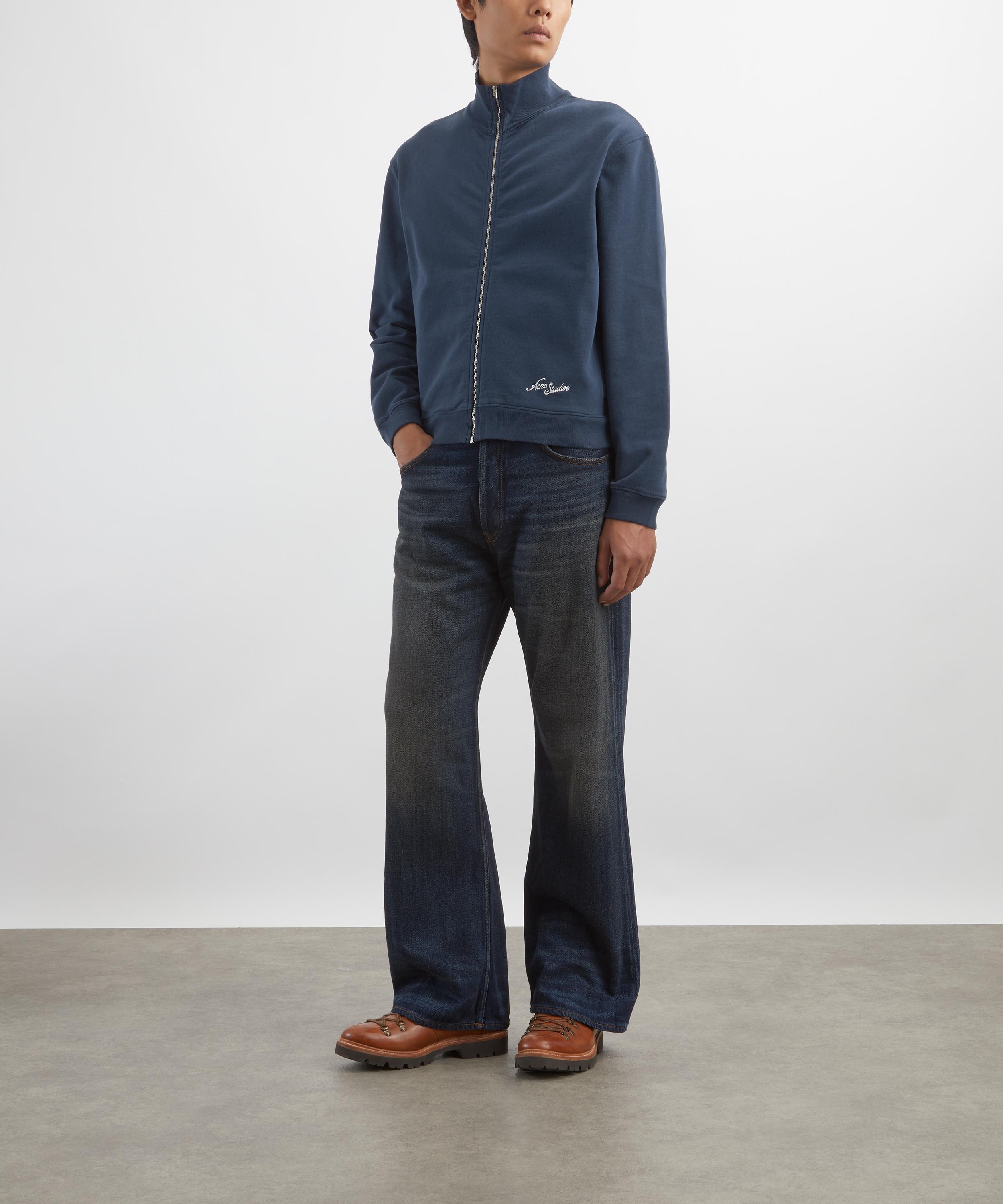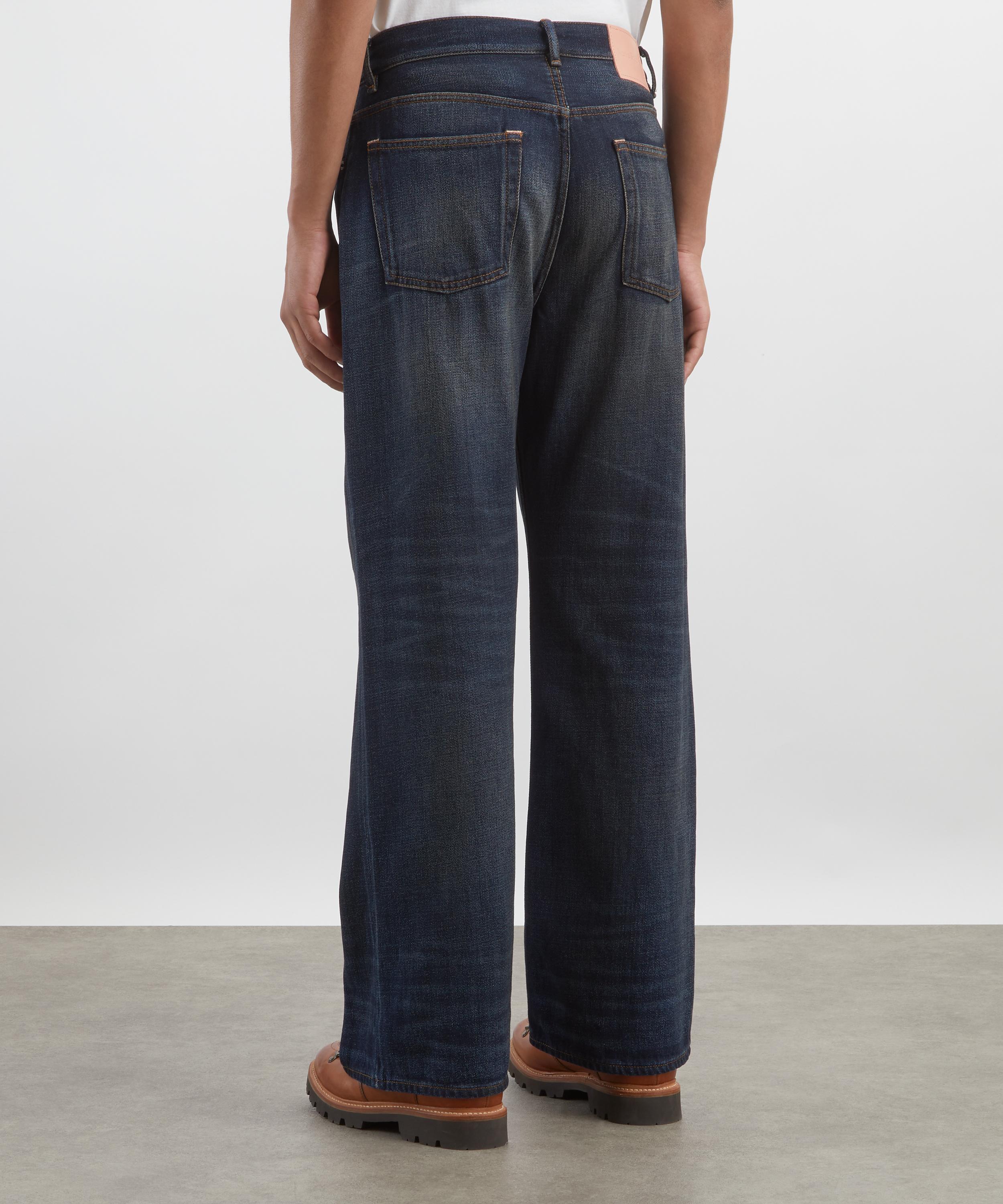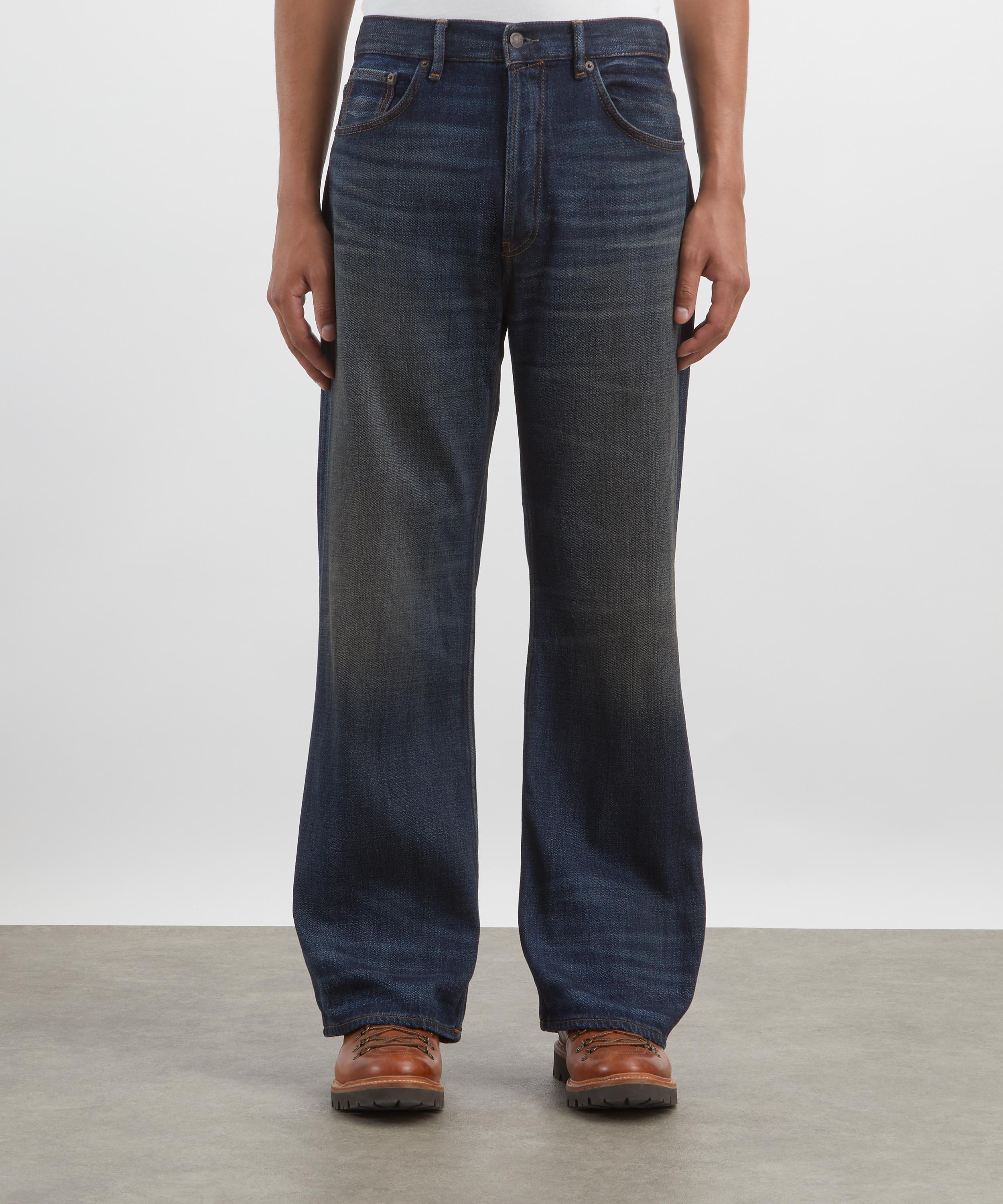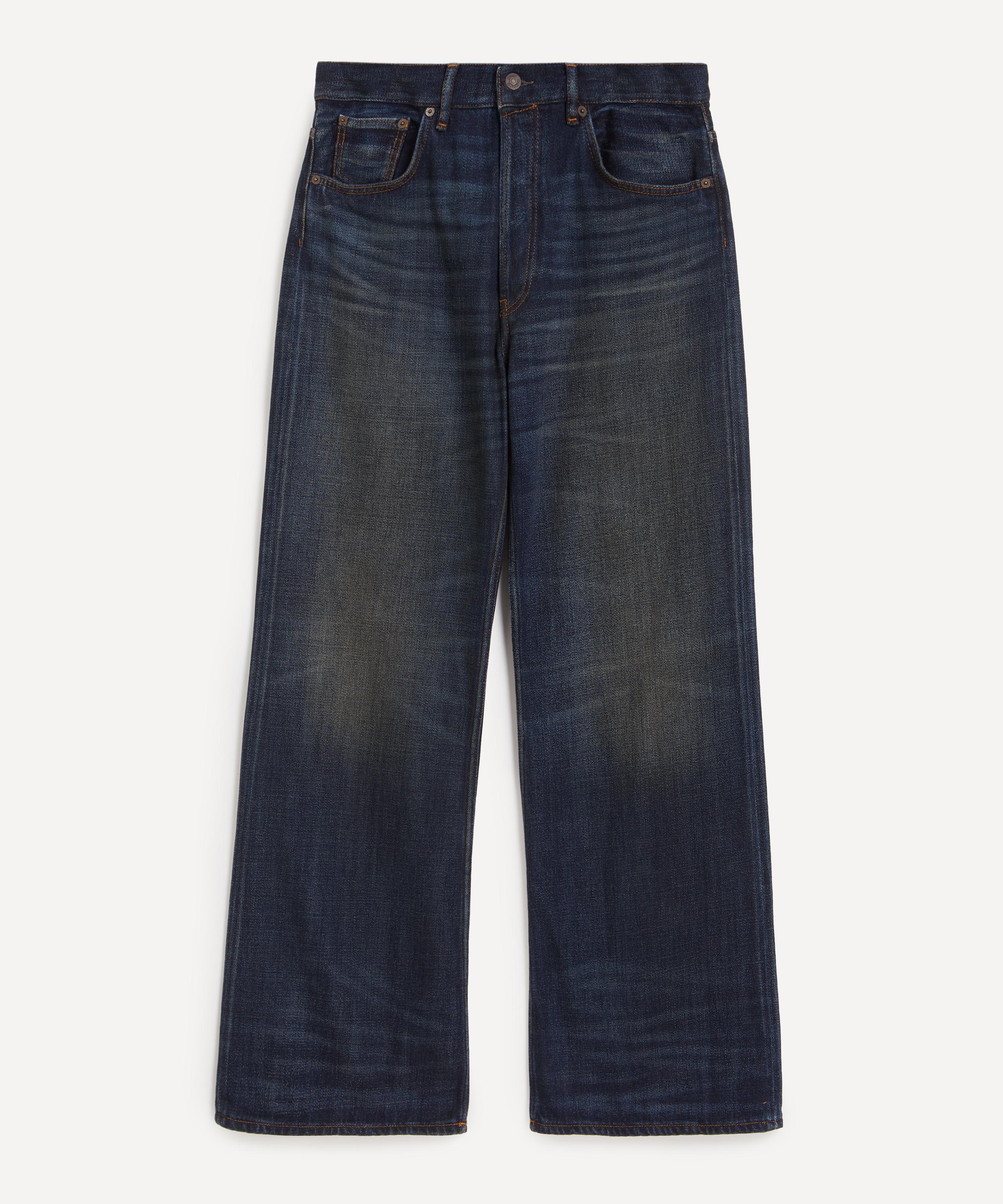 Crafted from rigid denim in a deep blue wash, the 2021 Jeans feature a mid-rise waist and a regular fit with wide legs that subtly flare from the knee. Finished with a dirty tint and distressed detailing, they deliver an authentic vintage-inspired look.