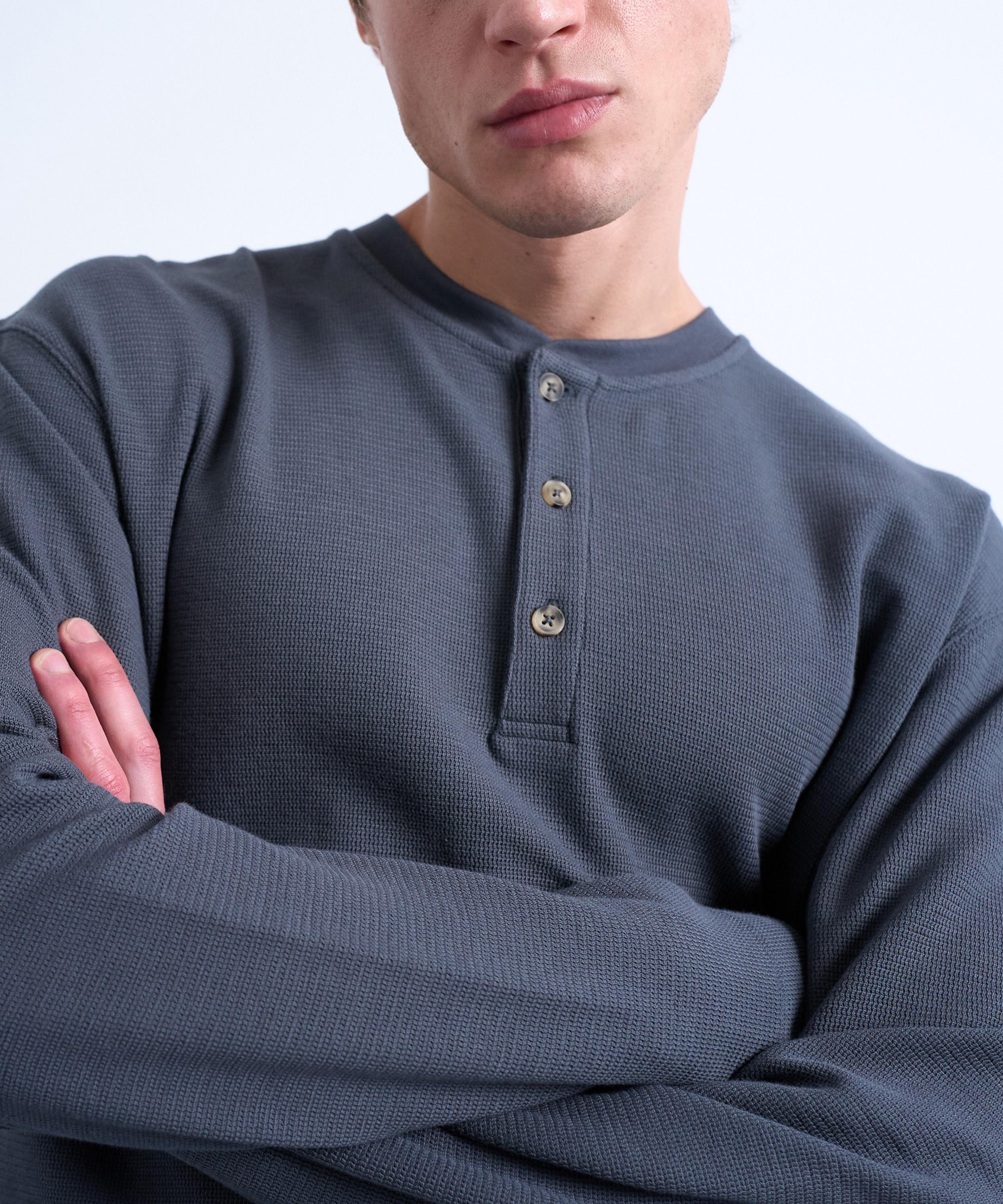 Crafted from thick, waffle-textured jersey, this top is designed with a relaxed, slouchy fit and features dropped shoulders and long sleeves. A classic Henley collar with a partial button placket completes the look, making it a timeless everyday essential.