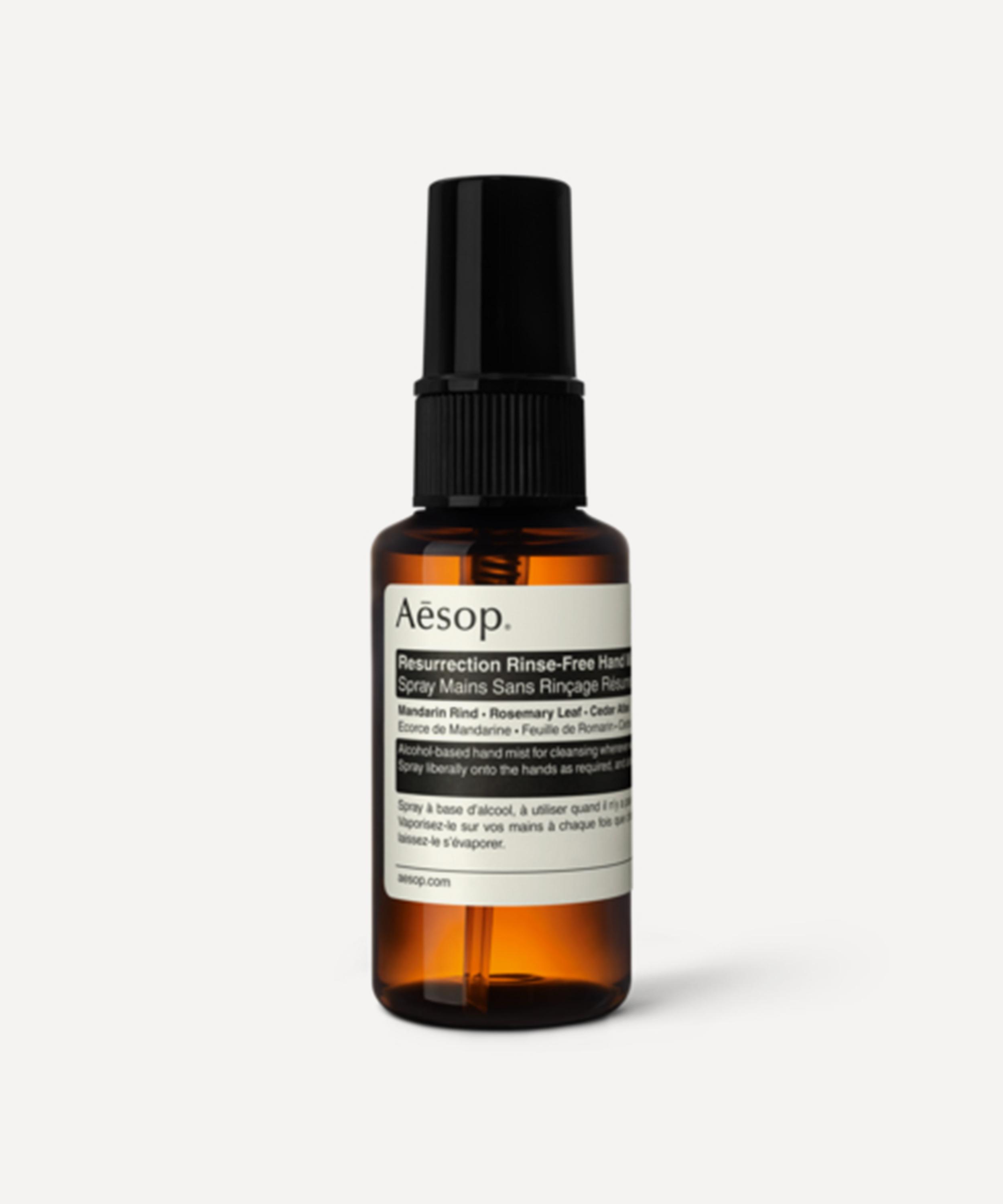 Aesop Resurrection Rinse-Free Hand Mist is a non-drying, alcohol-based formula designed for cleansing hands on-the-go.