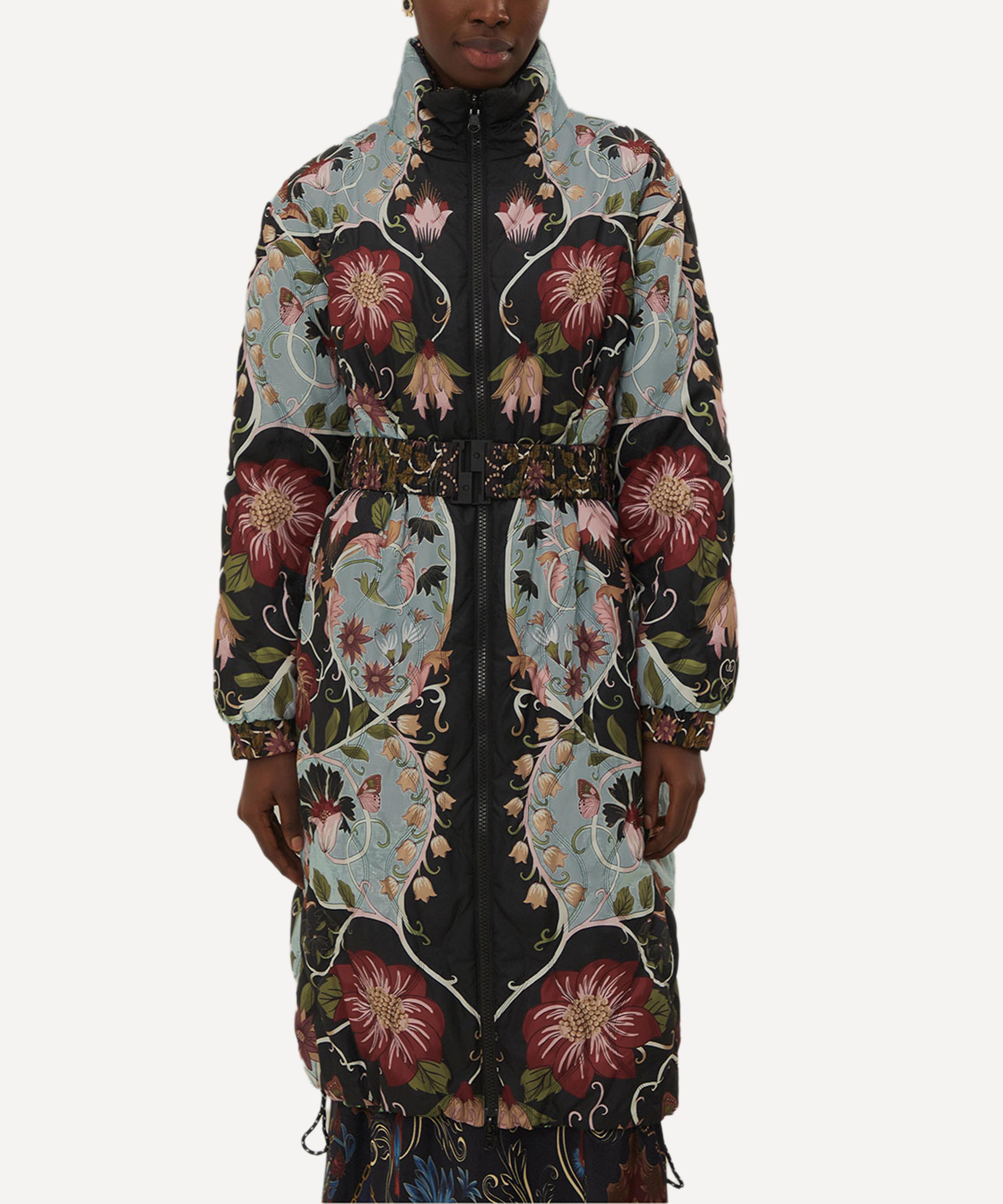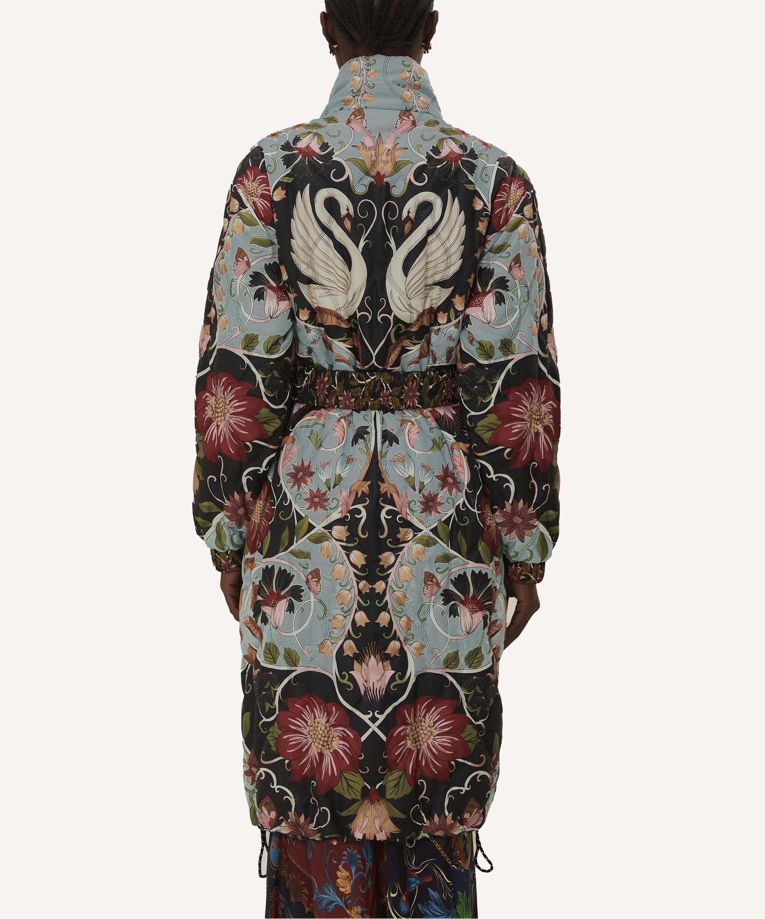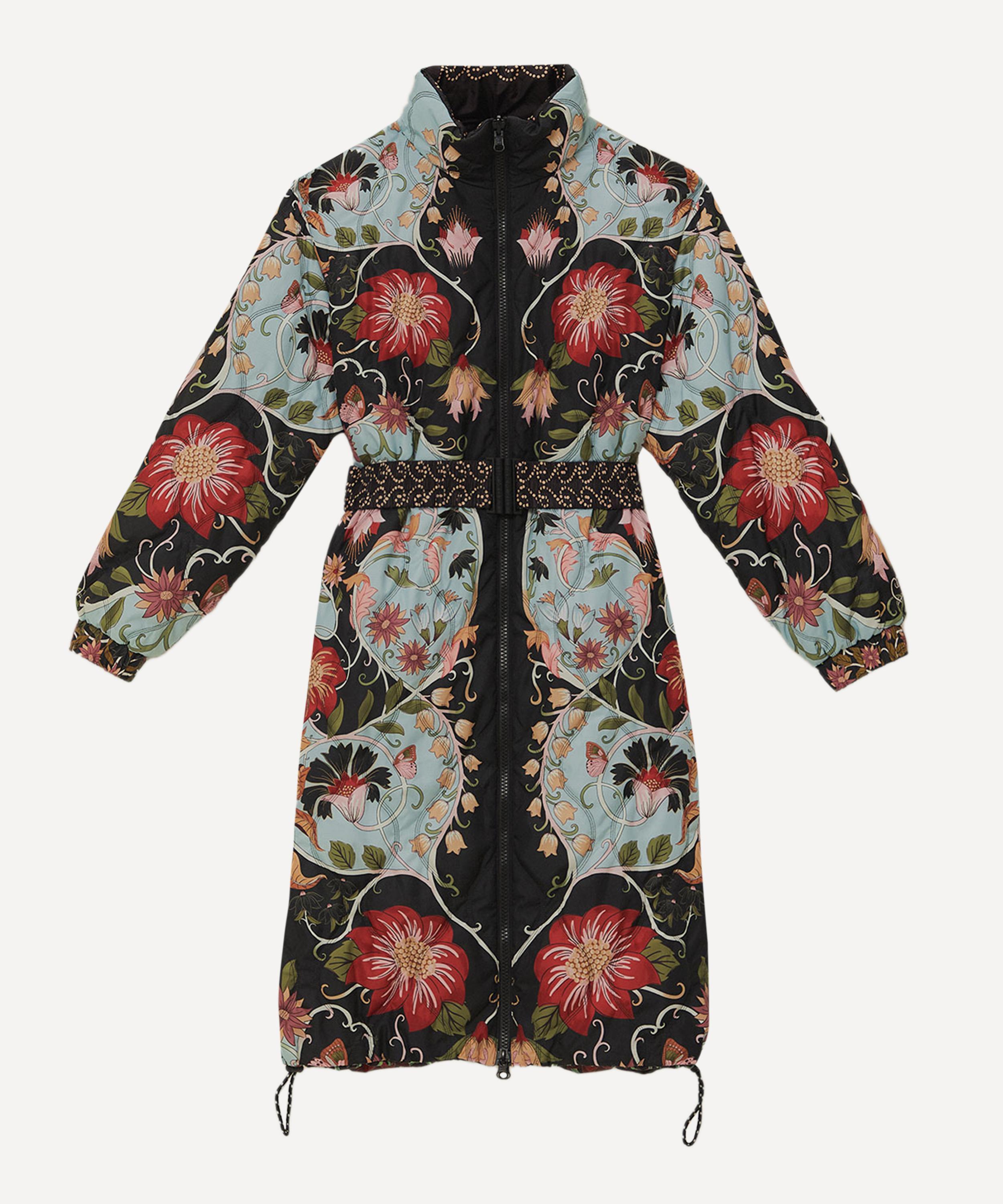 Wrap yourself in the vibrant enchantment of this playful reversible jacket, on which one side showcases a dusky palette adorned with lush floral motifs and elegant patterns in a blocked design, while the other side reveals a striking combination of dusky and light, ethereal hues with whimsical florals and two swans at the back in an intricate pattern. Complete with a cosy high neckline, it’s secured with a two-way zip closure adorned, and includes a detachable buckle belt at the waist for a flattering silhouette.