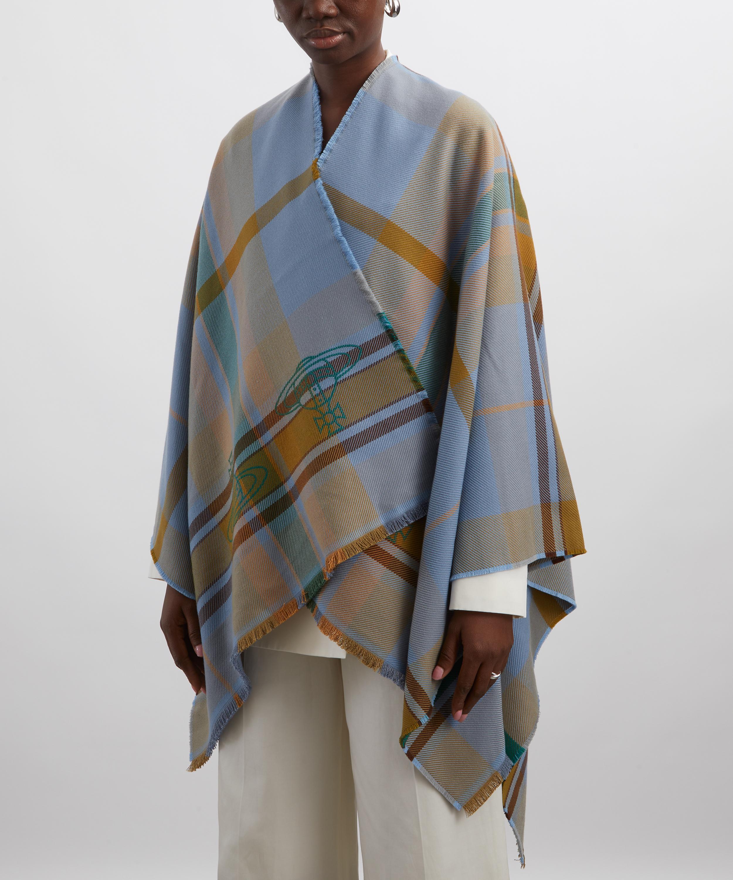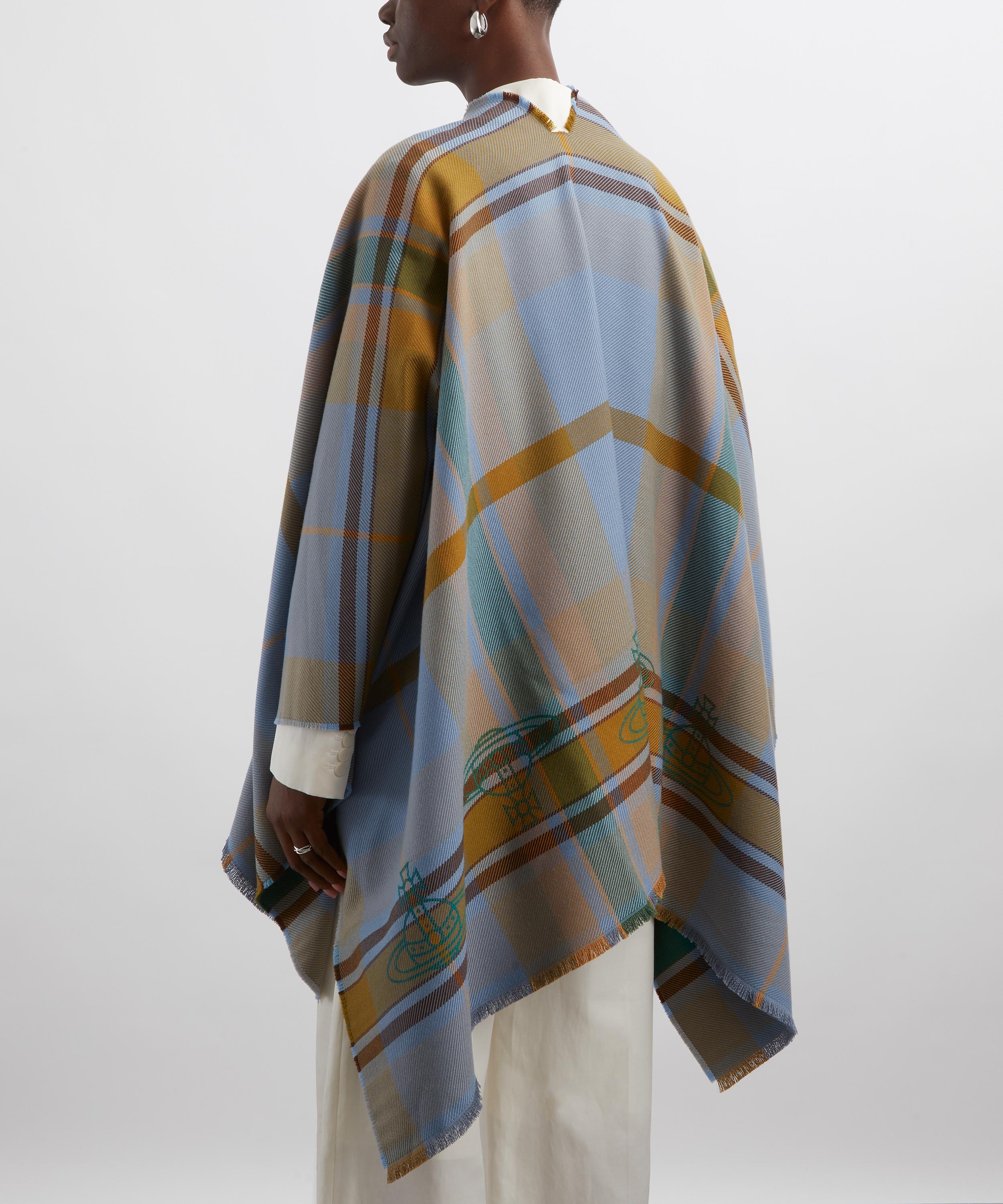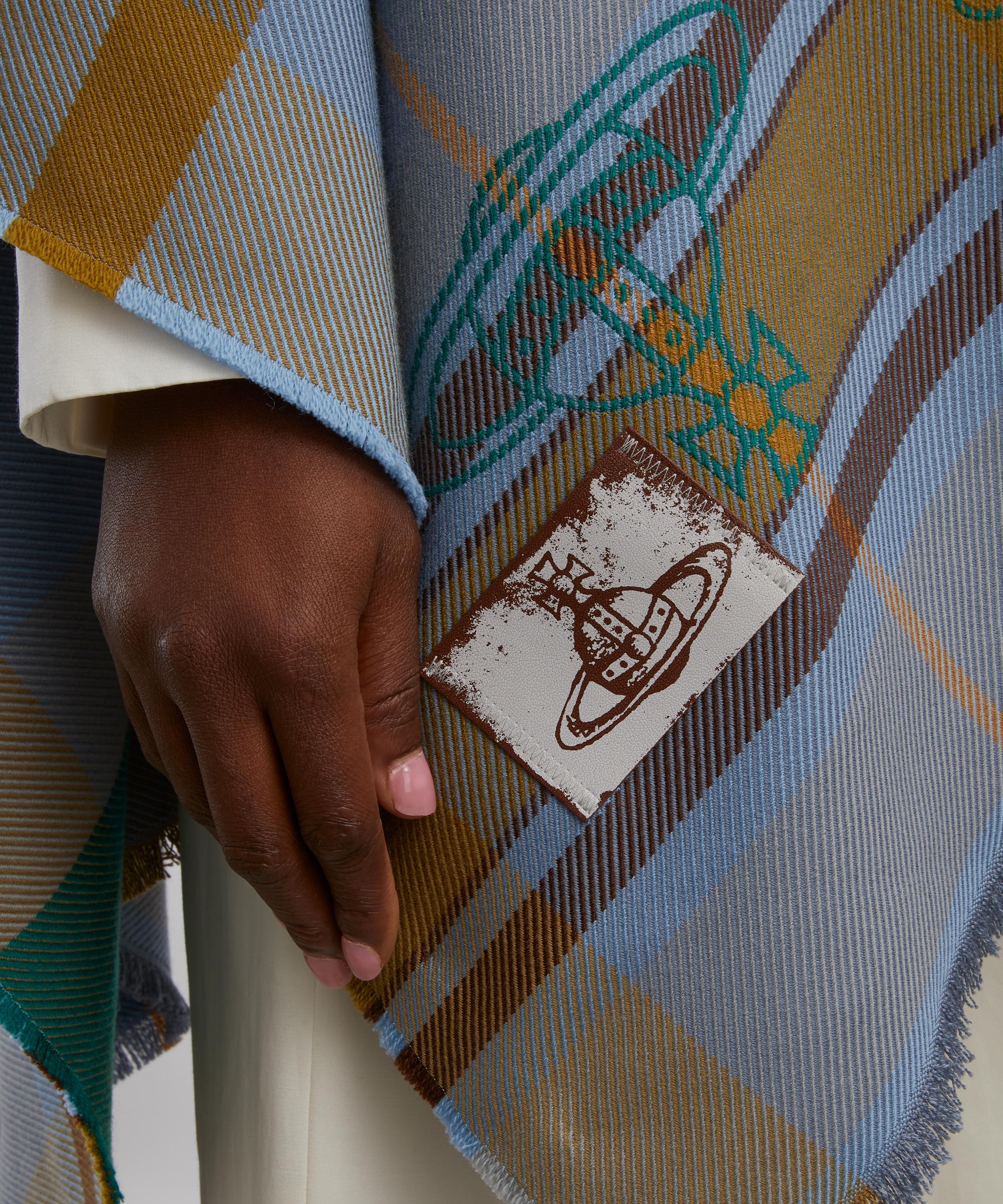 Inspired by Scottish Highland regalia, this reversible wool-cotton poncho showcases a tartan pattern on both sides, accented with signature enlarged orbs. The design beautifully embodies the ethos of merging the past with the future.