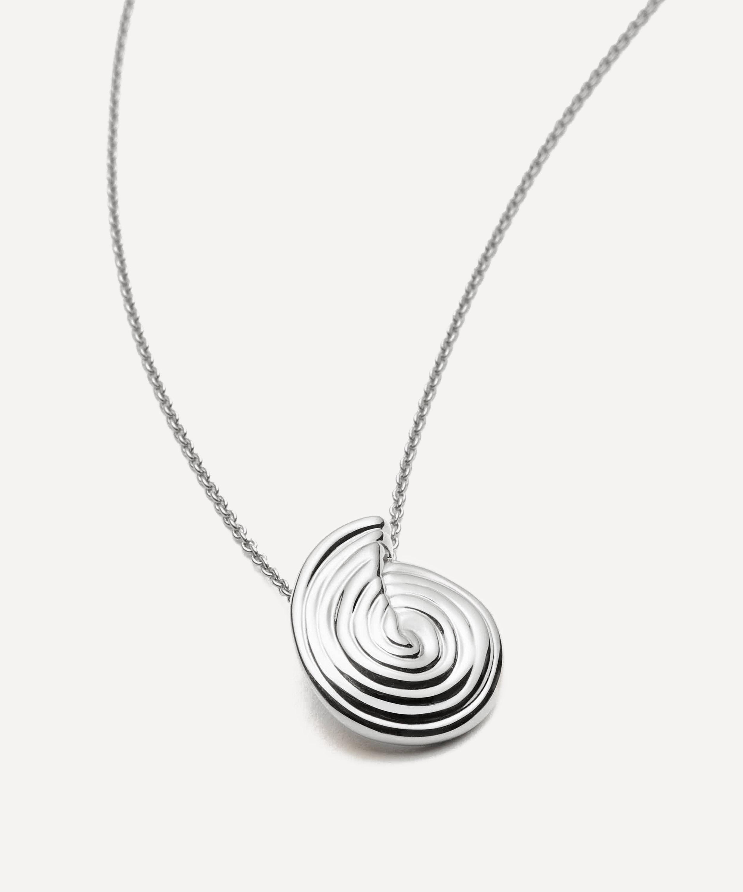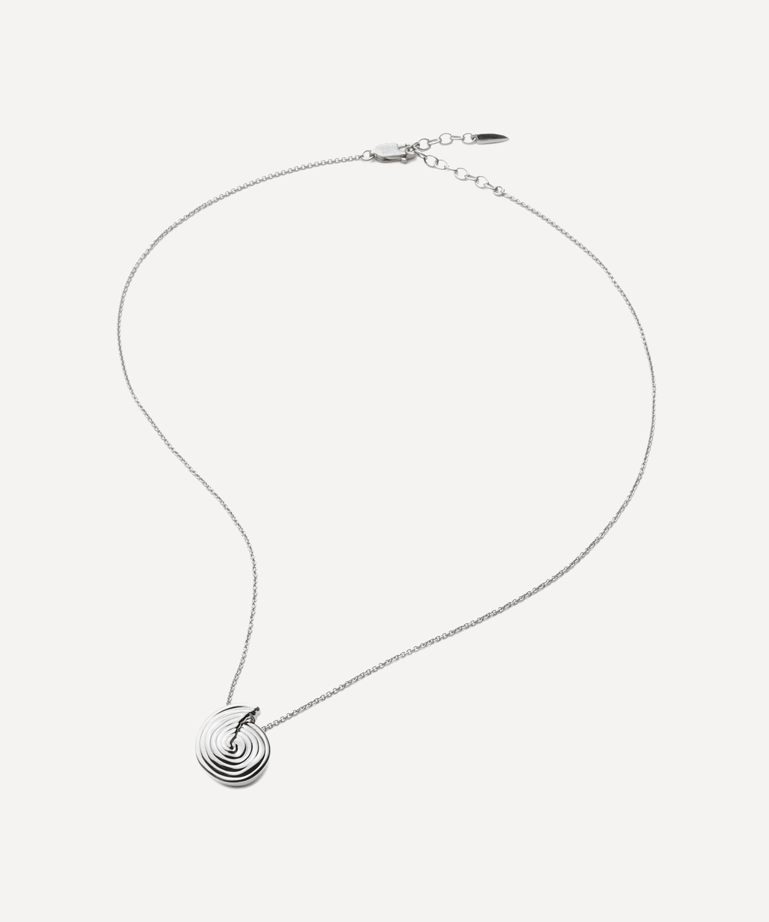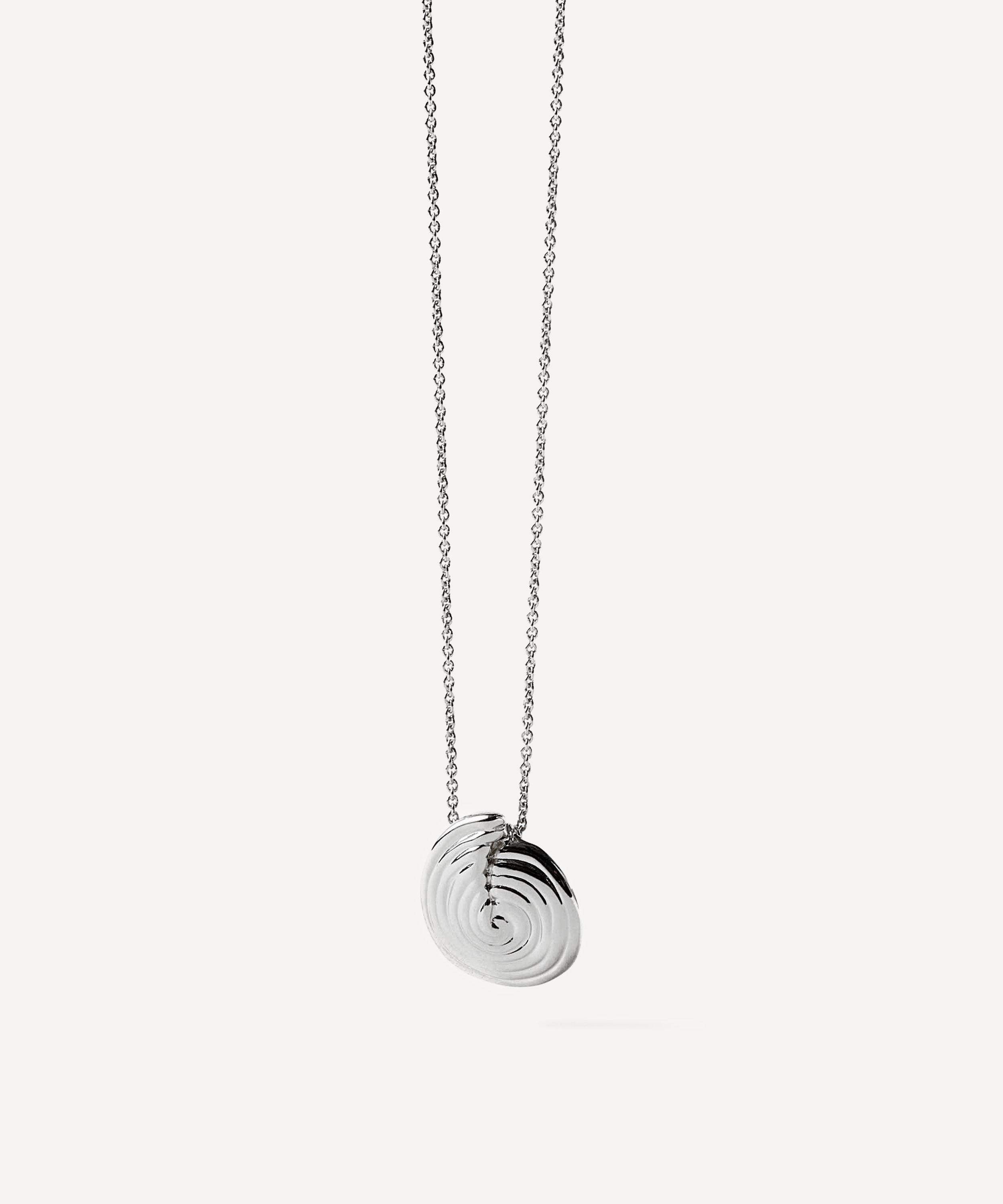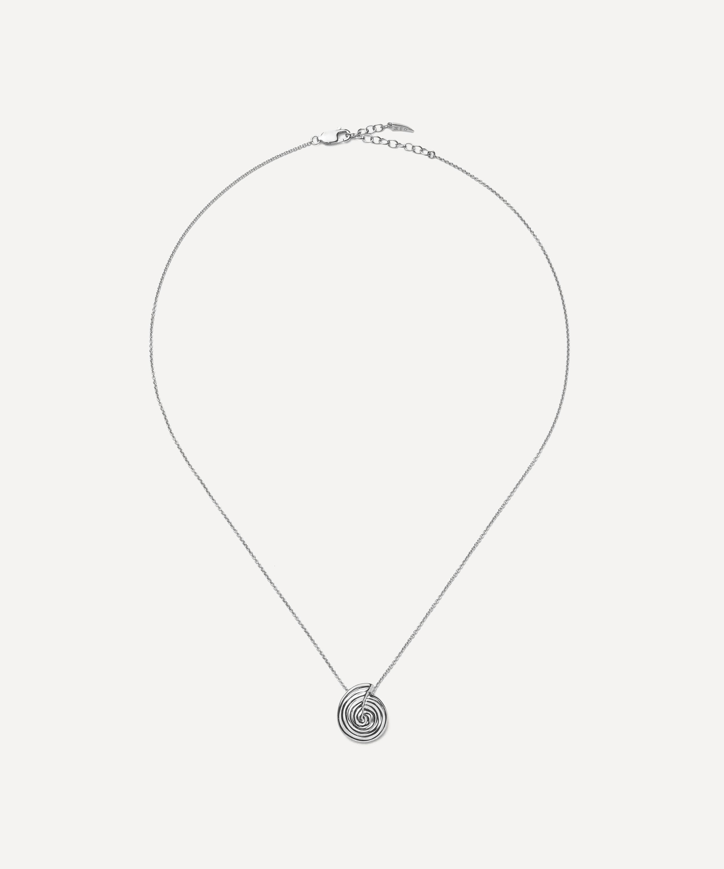 Drawing on elevated costal shapes, it features a fine cable chain adorned with a spiral pendant in rhodium-plated brass. Perfect for the summer season and beyond, it can be worn as a solo piece or complimented with a pair of bold earrings.