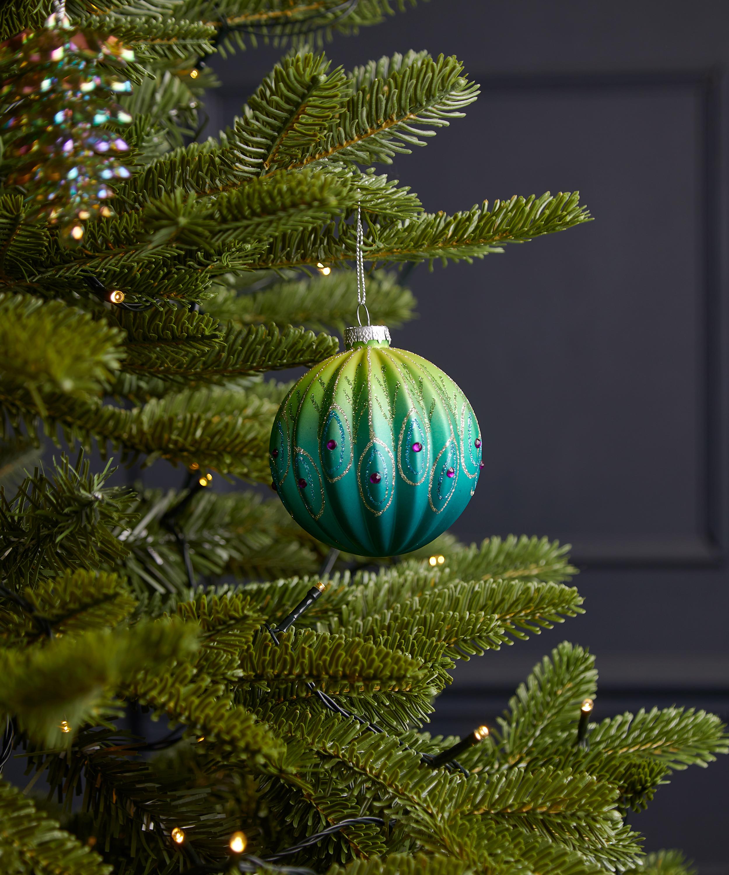 An alternative to traditional decorations, it’s exquisitely crafted from glass, featuring an ombre-green colourway with ribbed detailing, glitter and regal peacock feathers – a luxuriously embellished option for those seeking to express a bit of their personality in this year’s festive décor. Pair it with a mix of rioting colours and unexpected novelty ornaments to break the mould or let it become a small statement piece to make your traditional display pop.