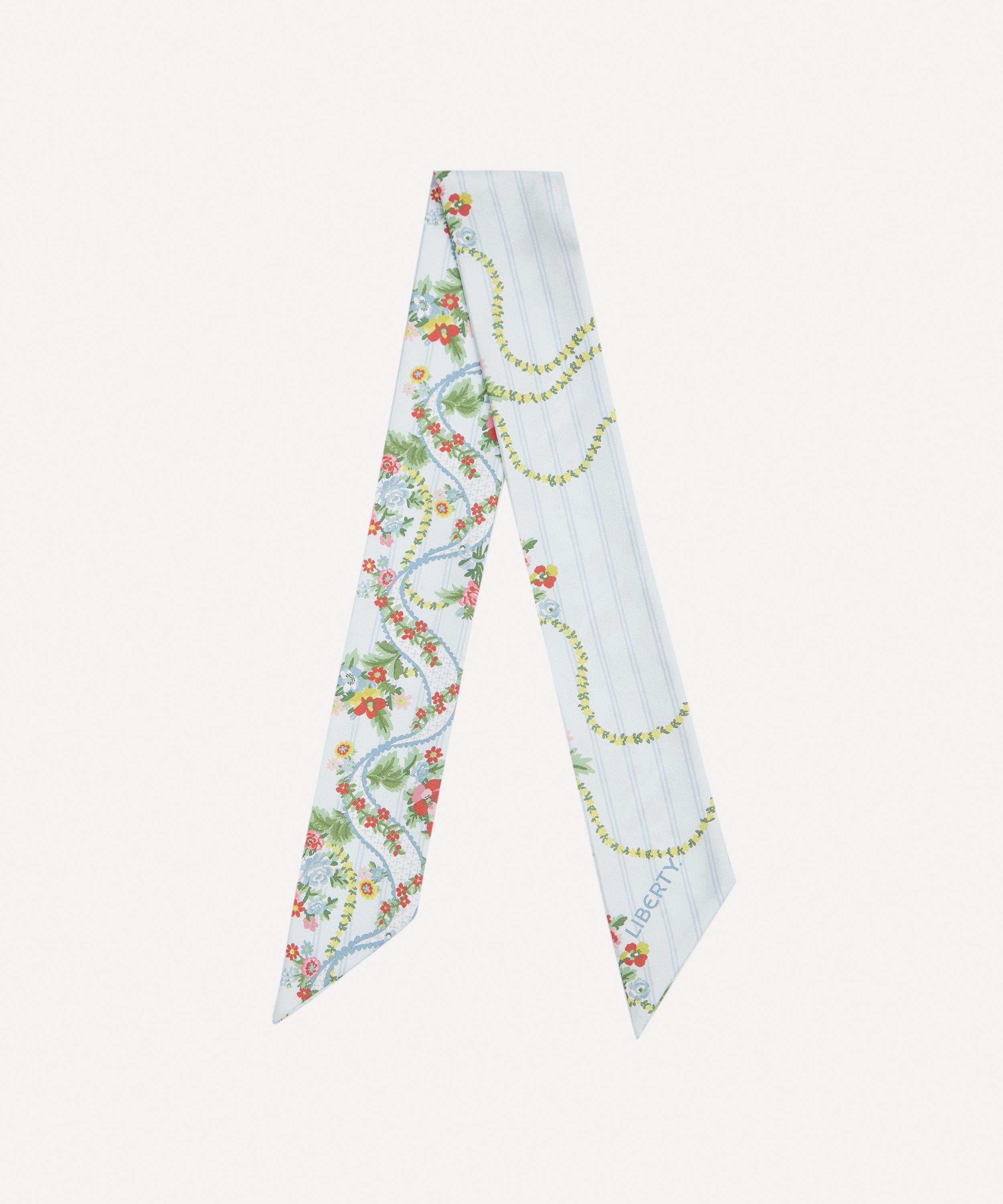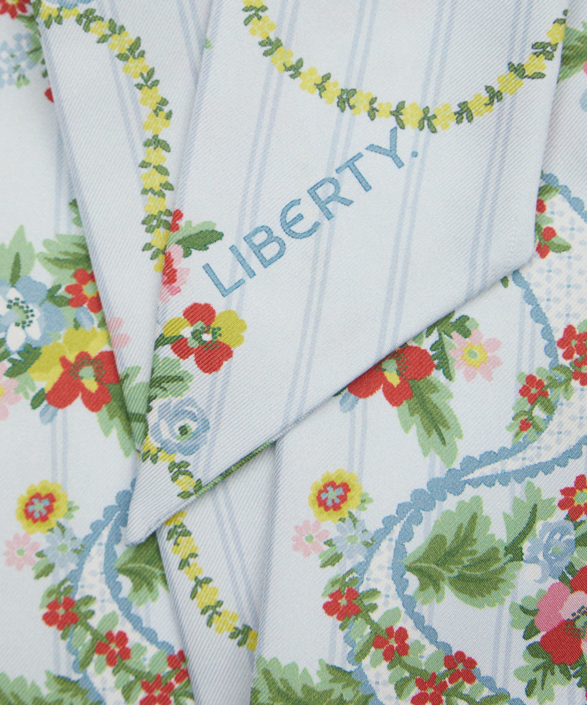 Expertly woven from ultra-soft silk twill, it showcases our delightful Ribbon Cacade print -inspired by a collection of 18th century hand-painted point papers from the Liberty archive, this design exudes poetic allure and graceful fluidity. Nostalgic rose, poppy, and daisy bouquets peek through finely embroidered ribbons and cascading floral chains, enhanced by a palette of soft pastel hues. Offering a subtle nod to Regency influences while remaining effortlessly wearable today, this scarf brings a touch of the ton’s luxurious world into the everyday—perfect for styling at the neck, in the hair, or wrapped around a favourite accessory.