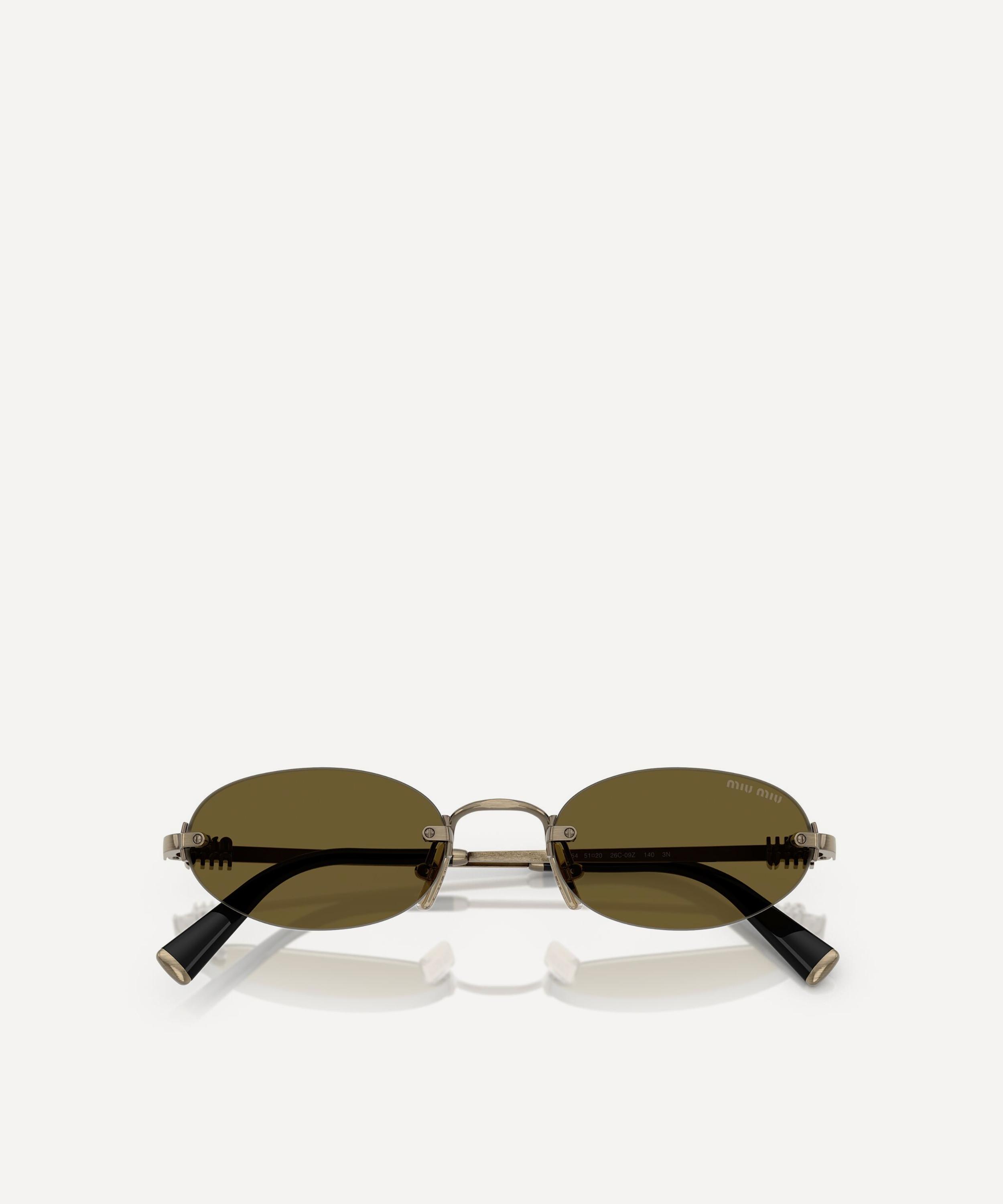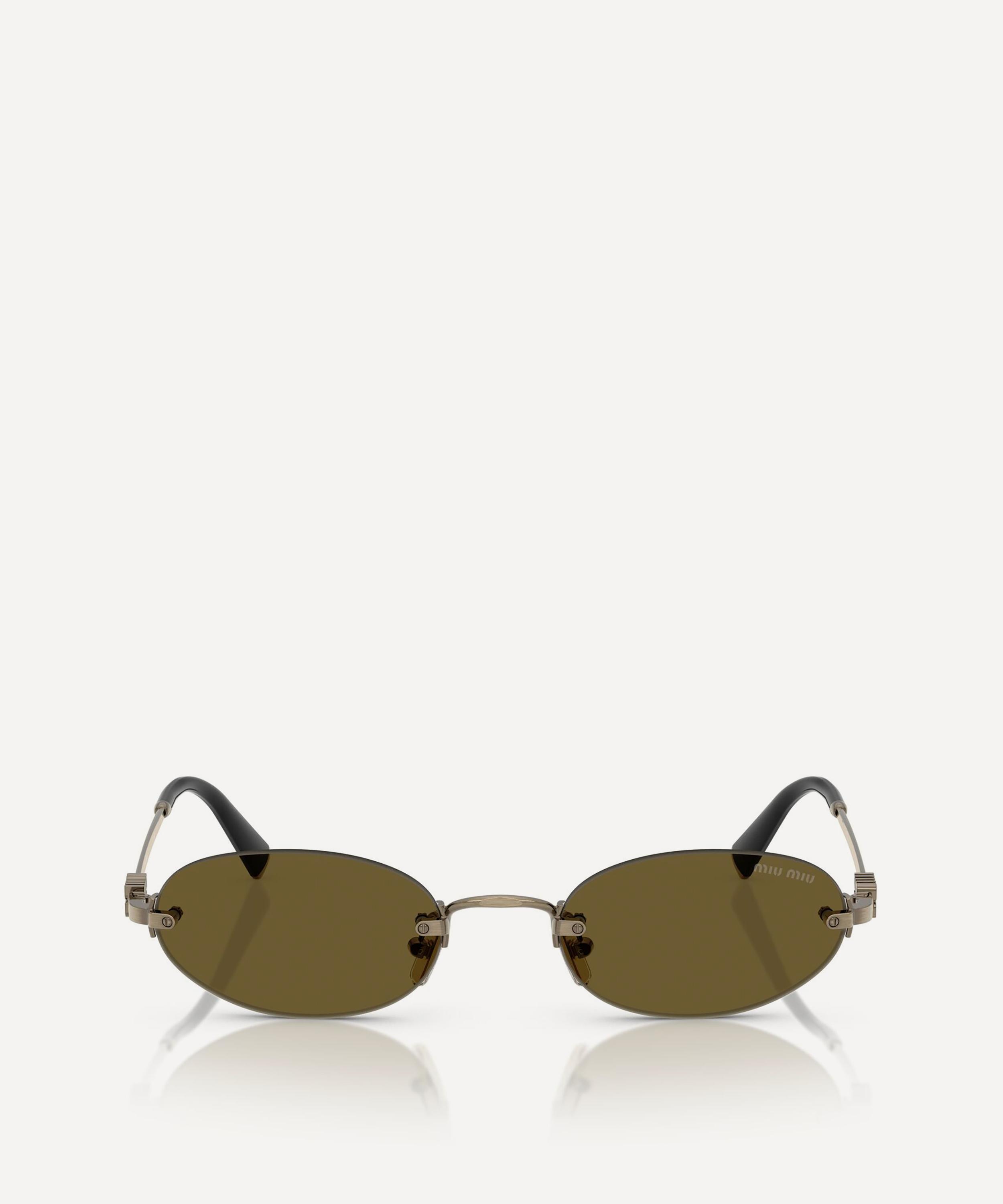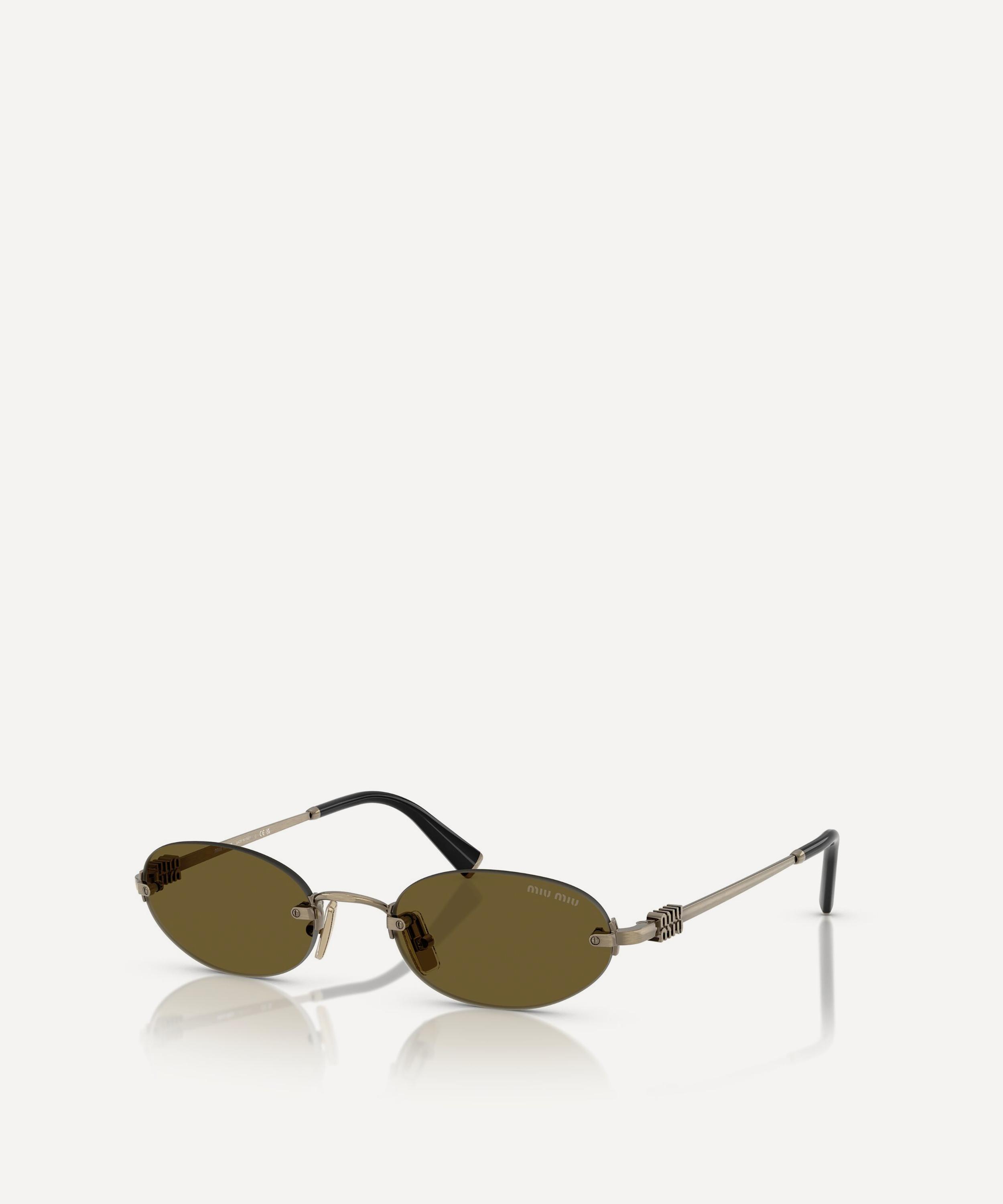 Heighten the impact of any attire with these oval sunglasses from Miu Miu. Expertly crafted from old-gold metal, to create a statement pair that instantly draws the eye, these rimless sunnies are fitted with adjustable nose pads and dark-brown lenses to shade and protect your eyes from UV light. Complete with acetate temple tips and the signature branding at the temples, they make for an ultra-chic finish to your curated looks.