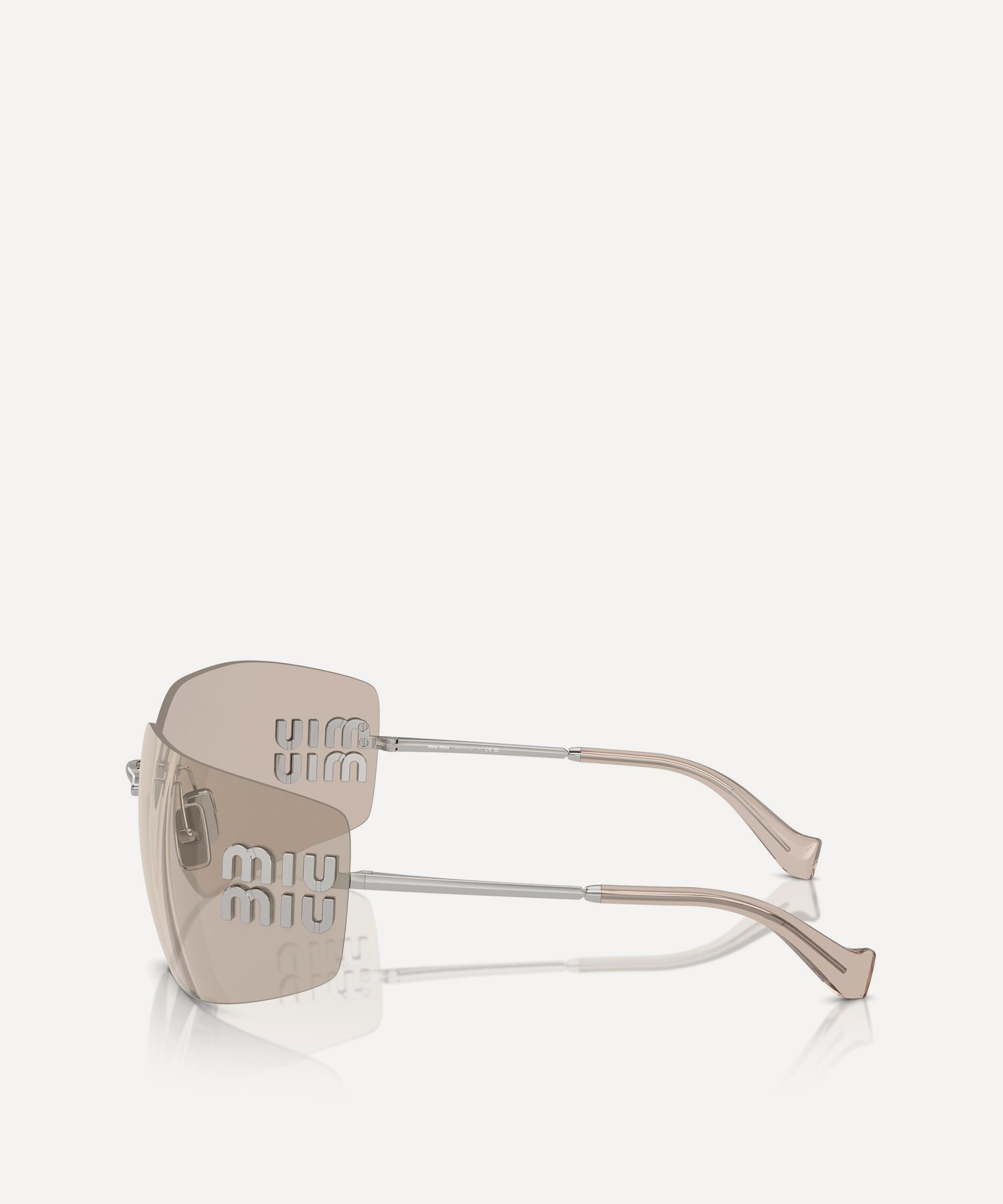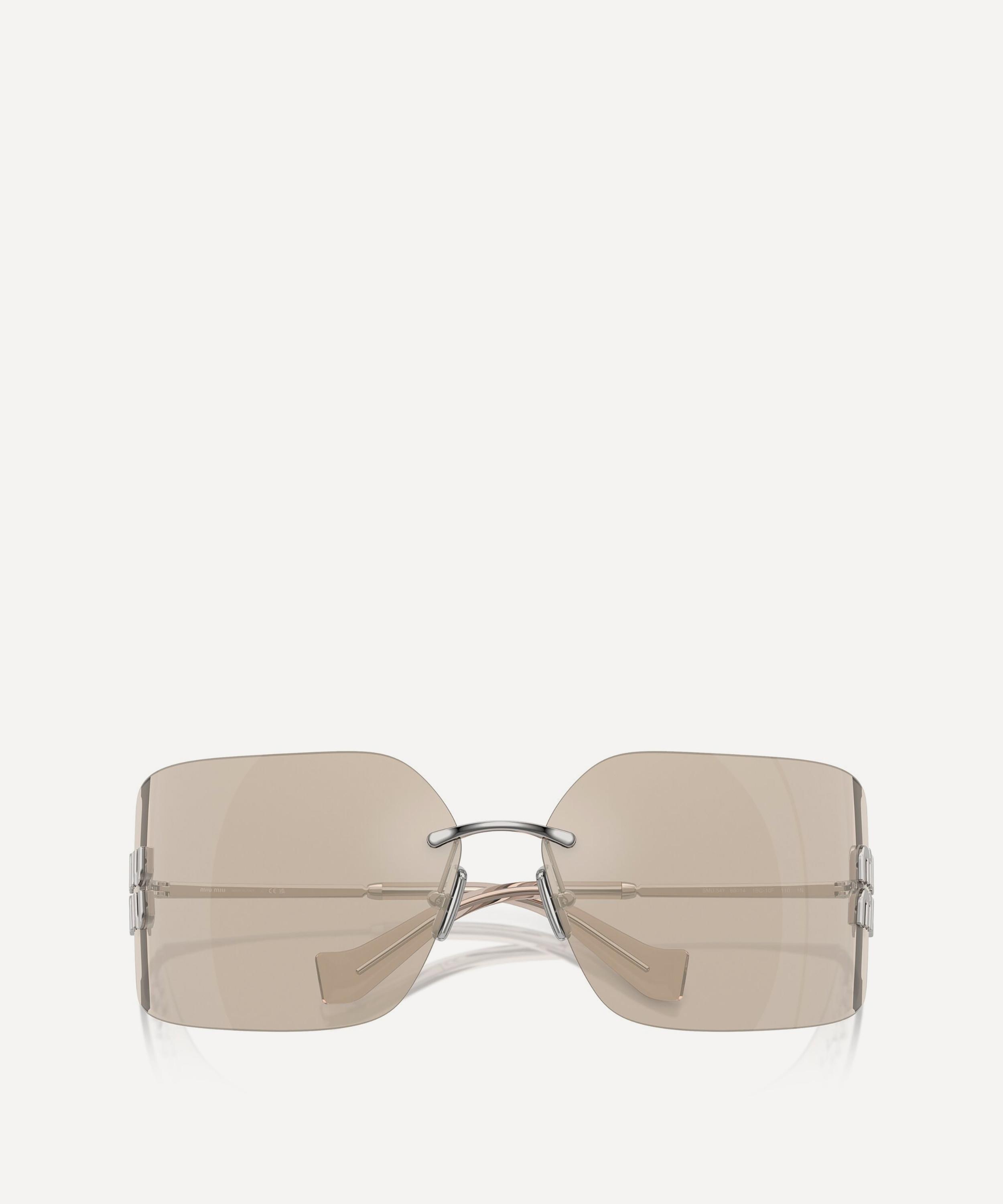Heighten the impact of any attire with these rectangle sunglasses from Miu Miu. Expertly crafted from silver-tone metal to create a statement pair that instantly draws the eye, these rimless sunnies are fitted with adjustable nose pads and large, light brown lenses to shade and protect your eyes from UV light. Complete with acetate temple tips and the signature branding at the temples, they make for an ultra-chic finish to your curated looks.
