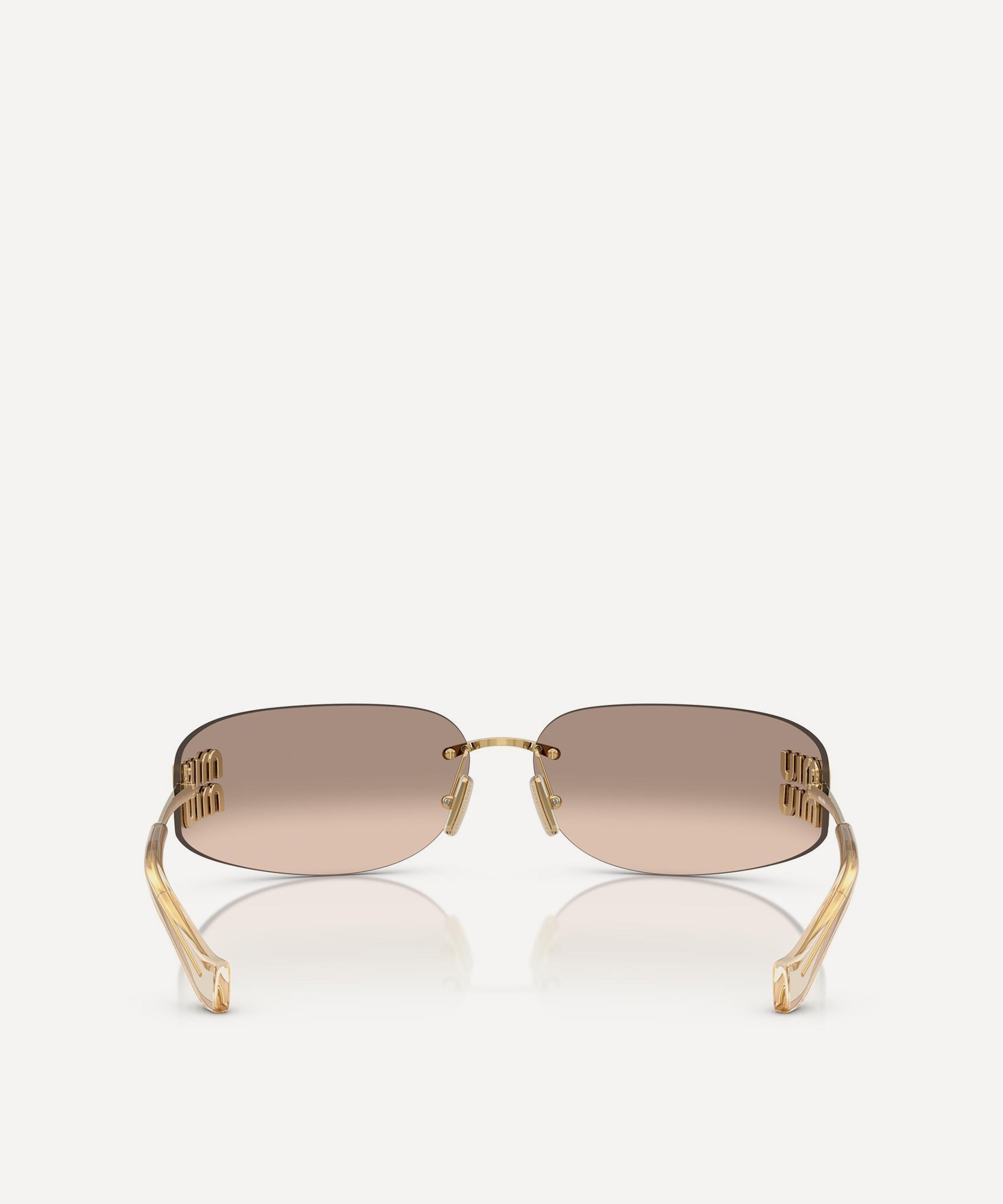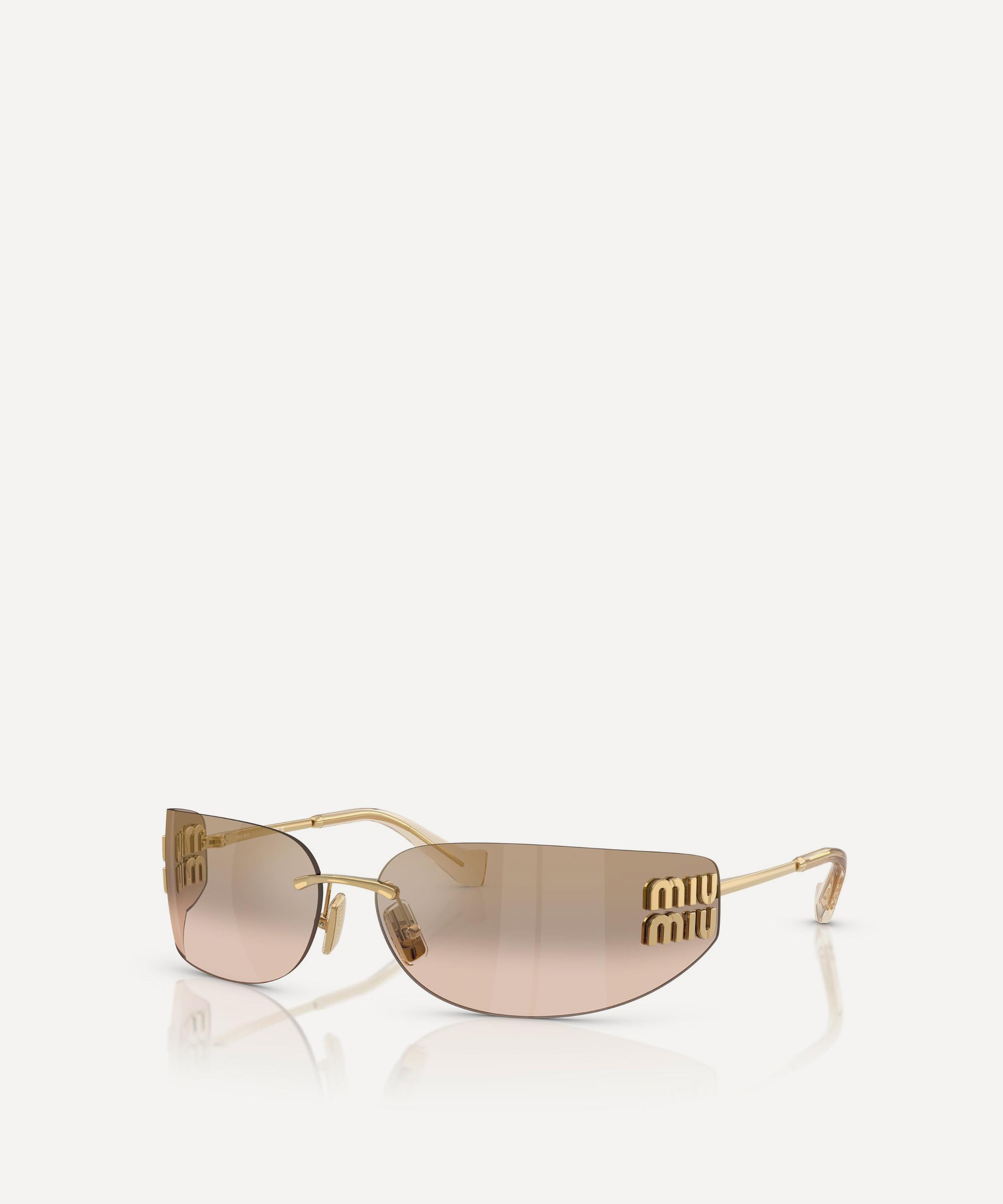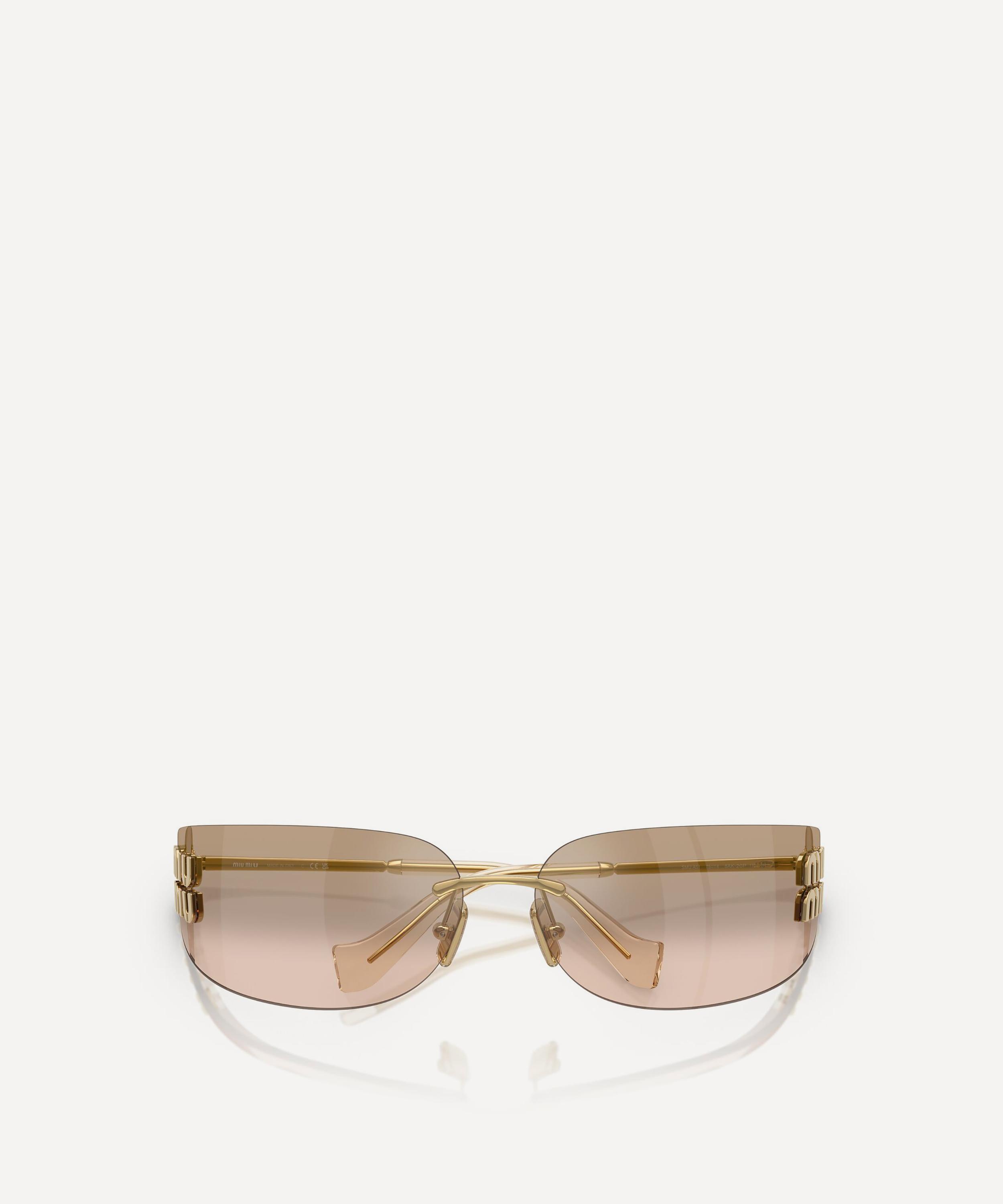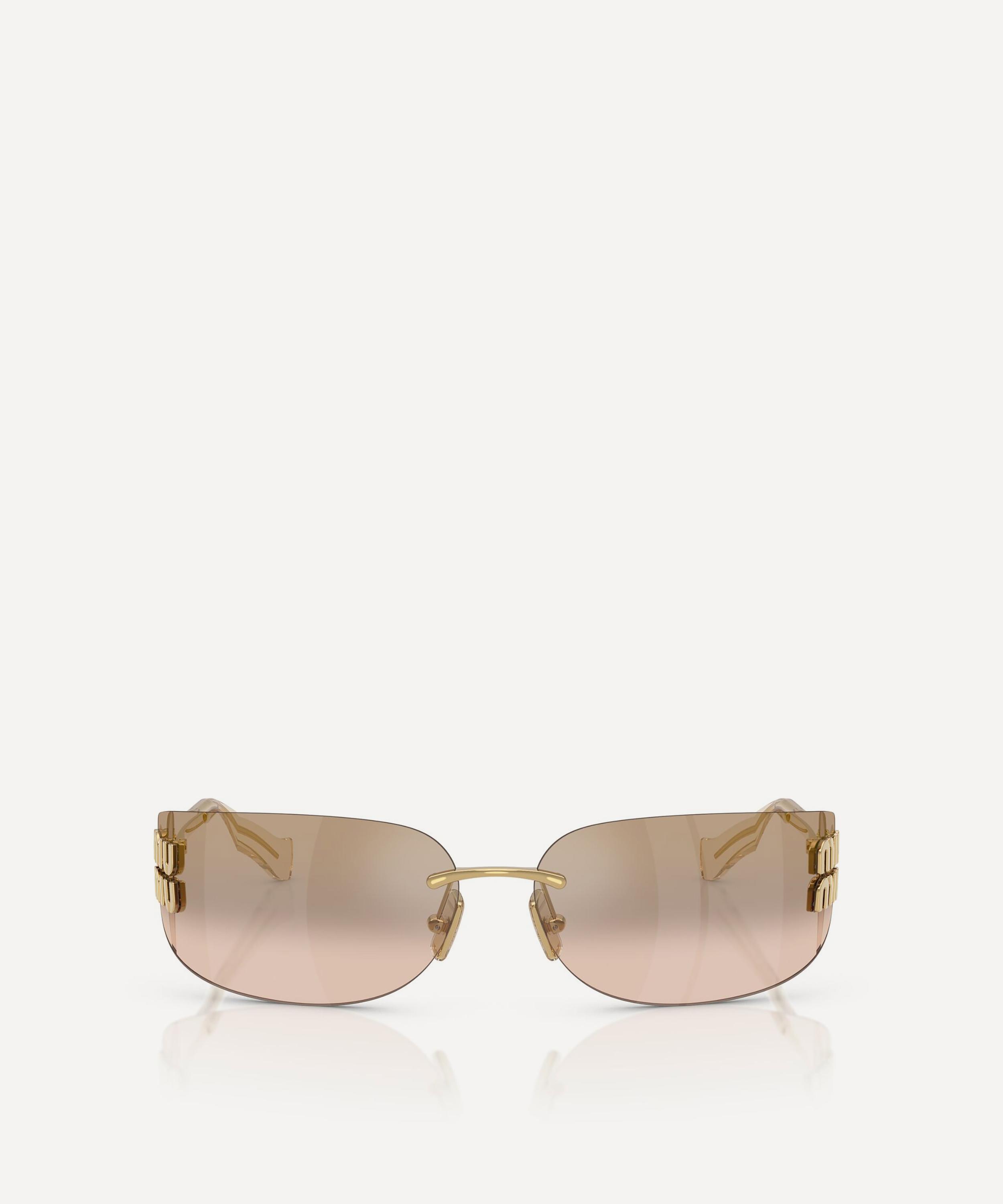 Heighten the impact of any attire with these rectangle sunglasses from Miu Miu. Expertly crafted from gold-tone metal, to create a statement pair that instantly draws the eye, these rimless sunnies are fitted with adjustable nose pads and large, bronze-brown lenses to shade and protect your eyes from UV light. Complete with acetate temple tips and the signature branding at the temples, they make for an ultra-chic finish to your curated looks.