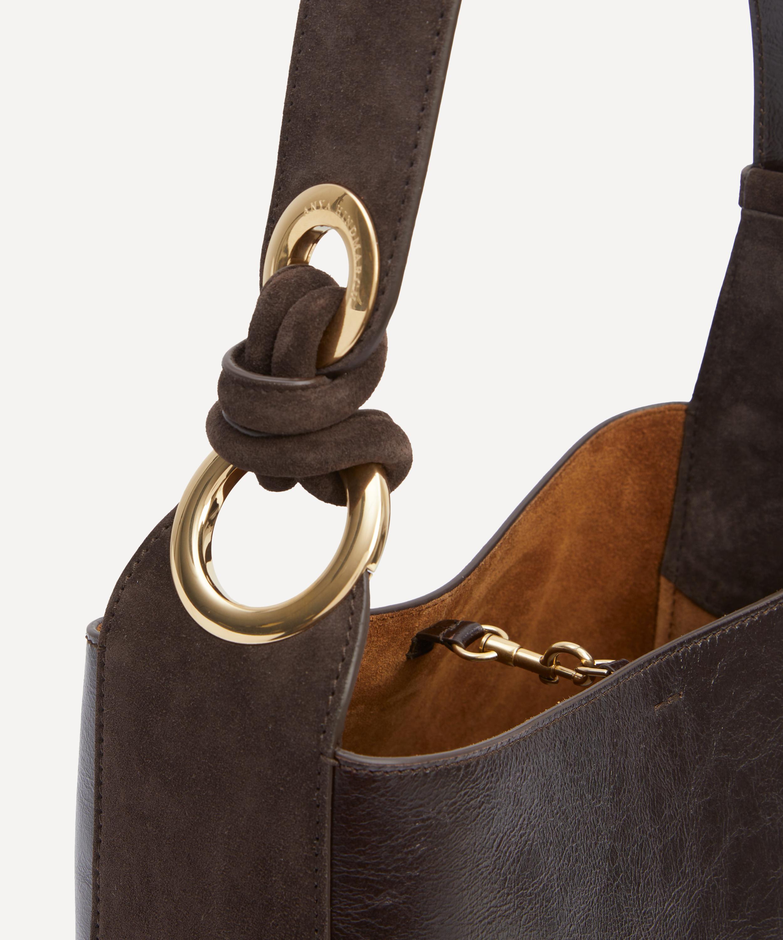 Expertly crafted from calf and suede leather, this shoulder bag is complemented by an adjustable shoulder strap, detailed with a rouleaux knot and ring eyelets. It opens to reveal a spacious interior for housing a book, a wallet, or your essential on-the-go makeup. With signs of wear, and a gold hardware finish, it serves as the most stylish, and versatile, bag for your daily and evening edits.