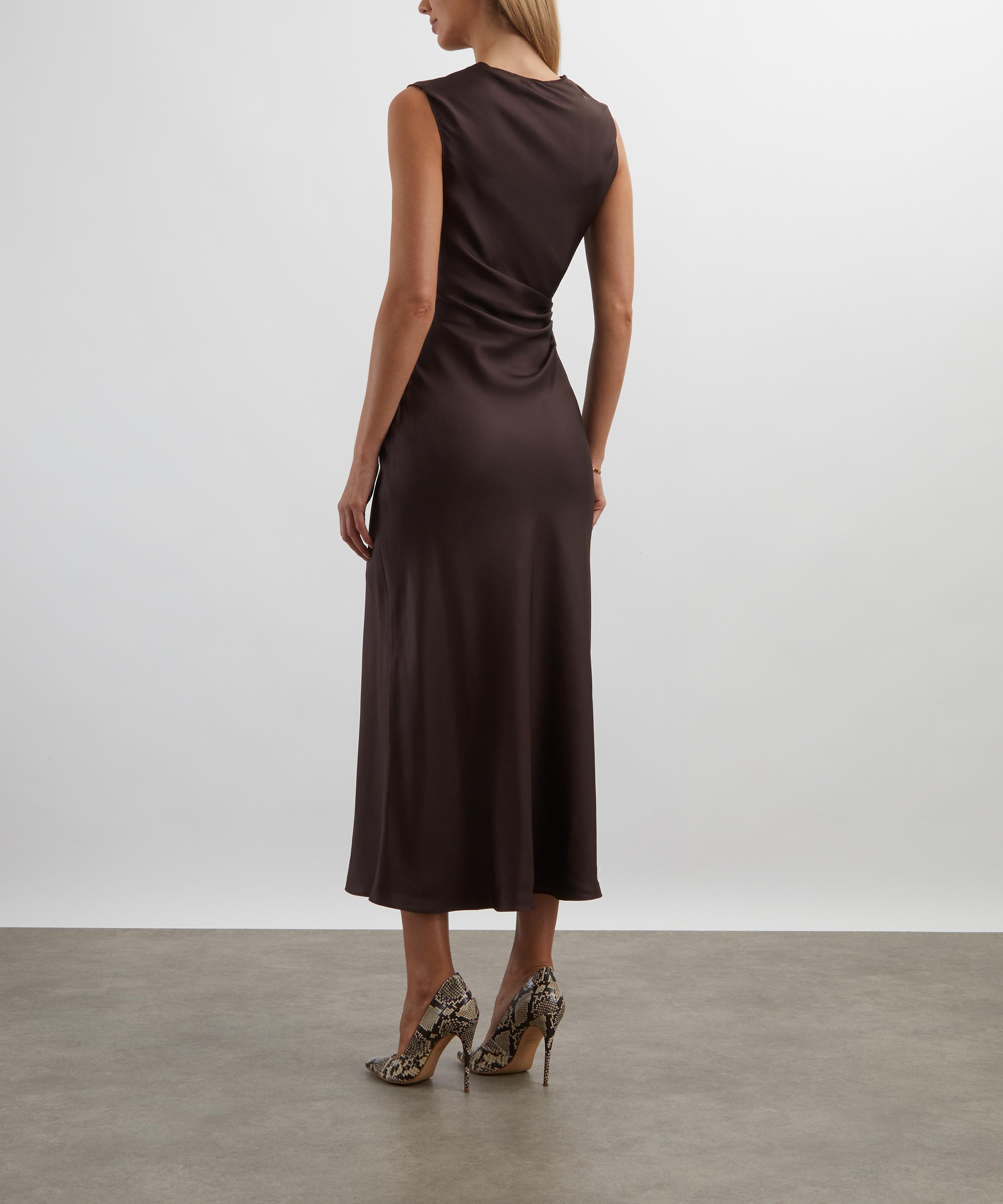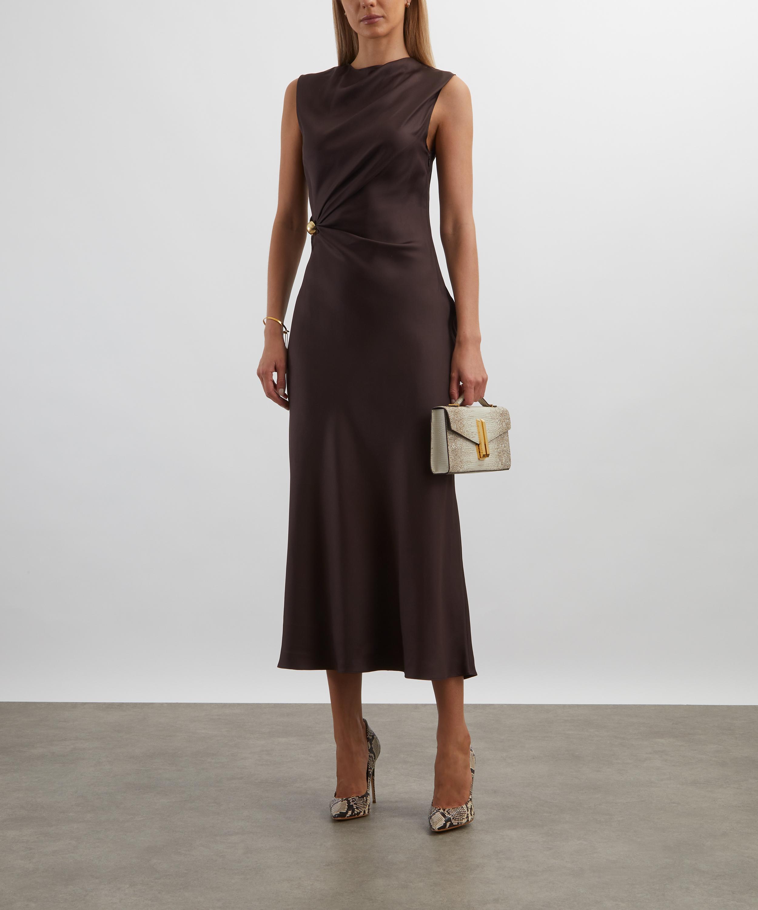 Crafted from lustrous silk-twill that drapes beautifully, the Roan Dress exudes effortless sophistication. Minimal in design with a high neckline and sleeveless cut, it’s finished with a single gold-tone embellishment at the waist for a softly gathered effect.