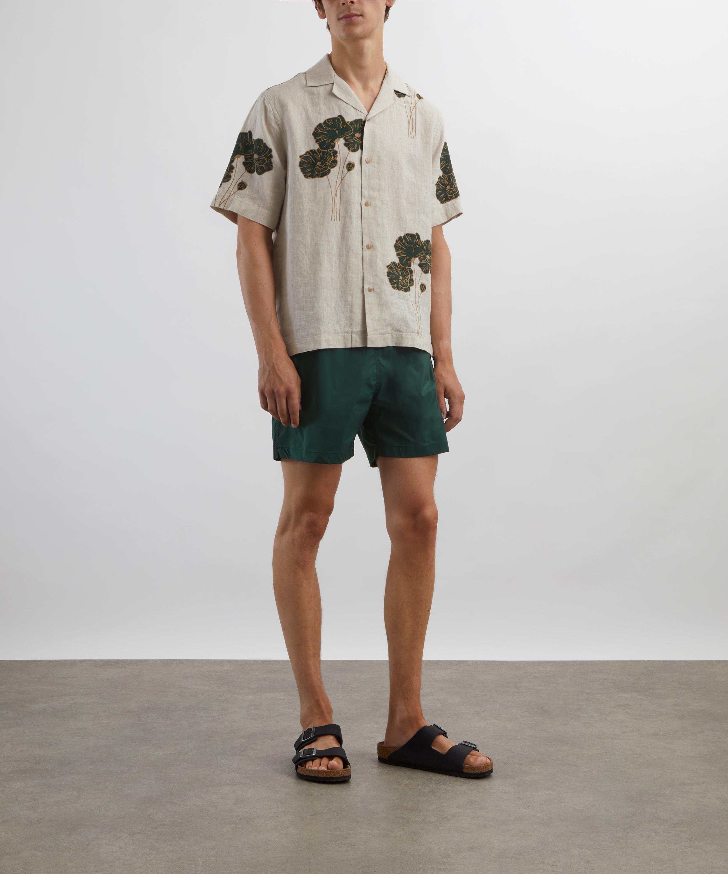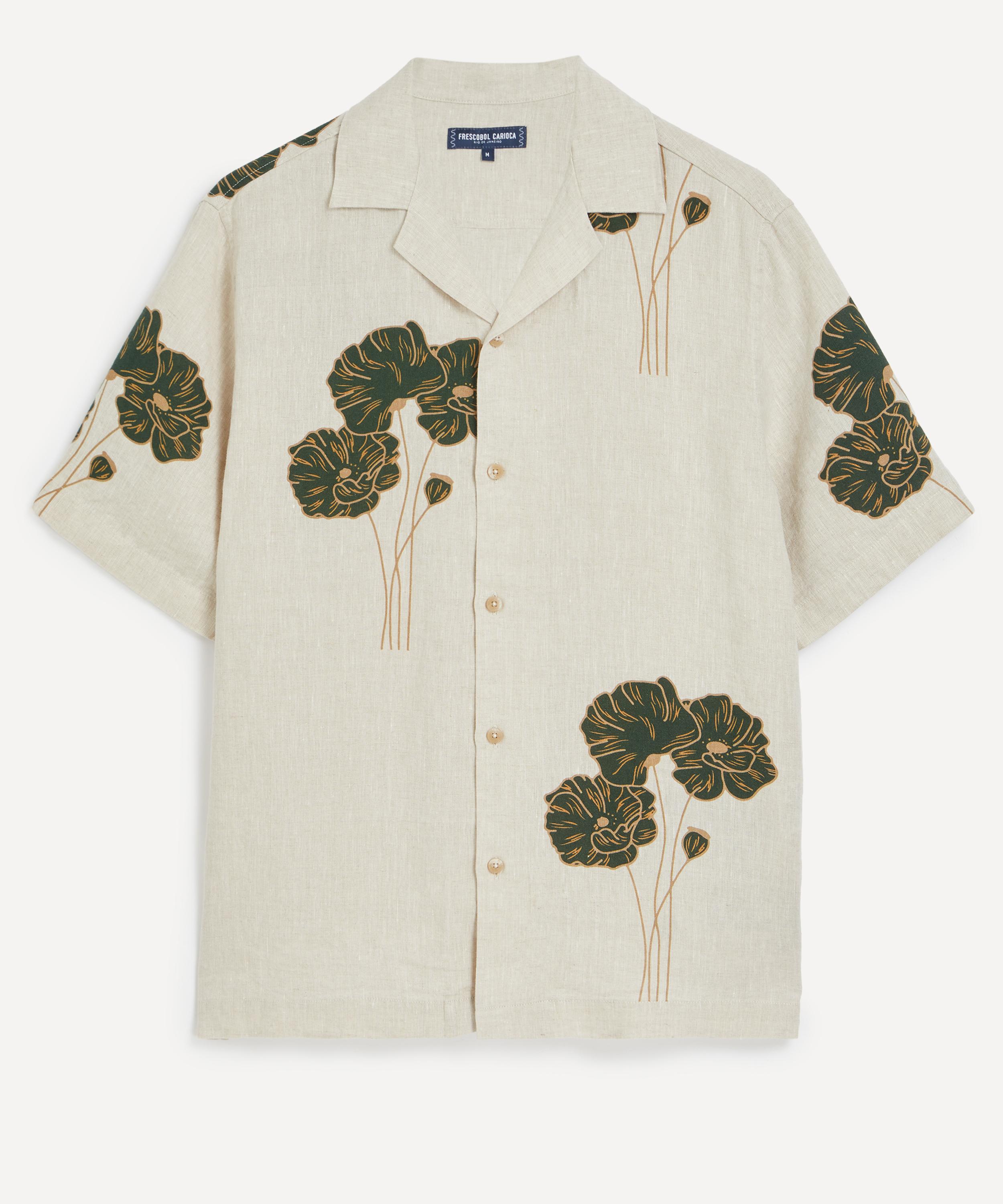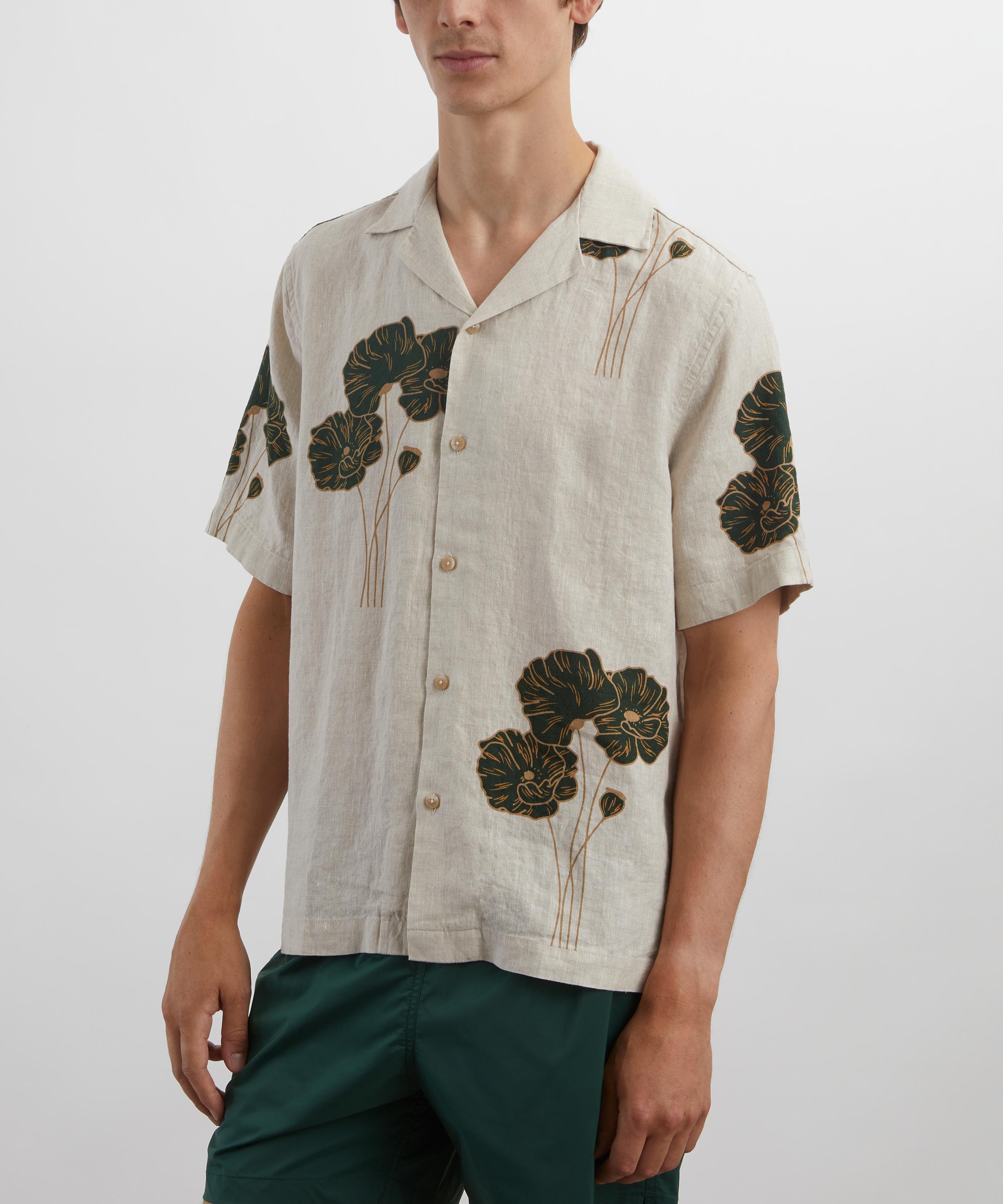 Crafted from lightweight, breathable linen, this short-sleeve shirt features a relaxed fit and is adorned with a linear floral print inspired by Rio de Janeiro’s state flower, the Begônia. Finished with a classic camp collar, it offers an effortless blend of comfort and casual sophistication.