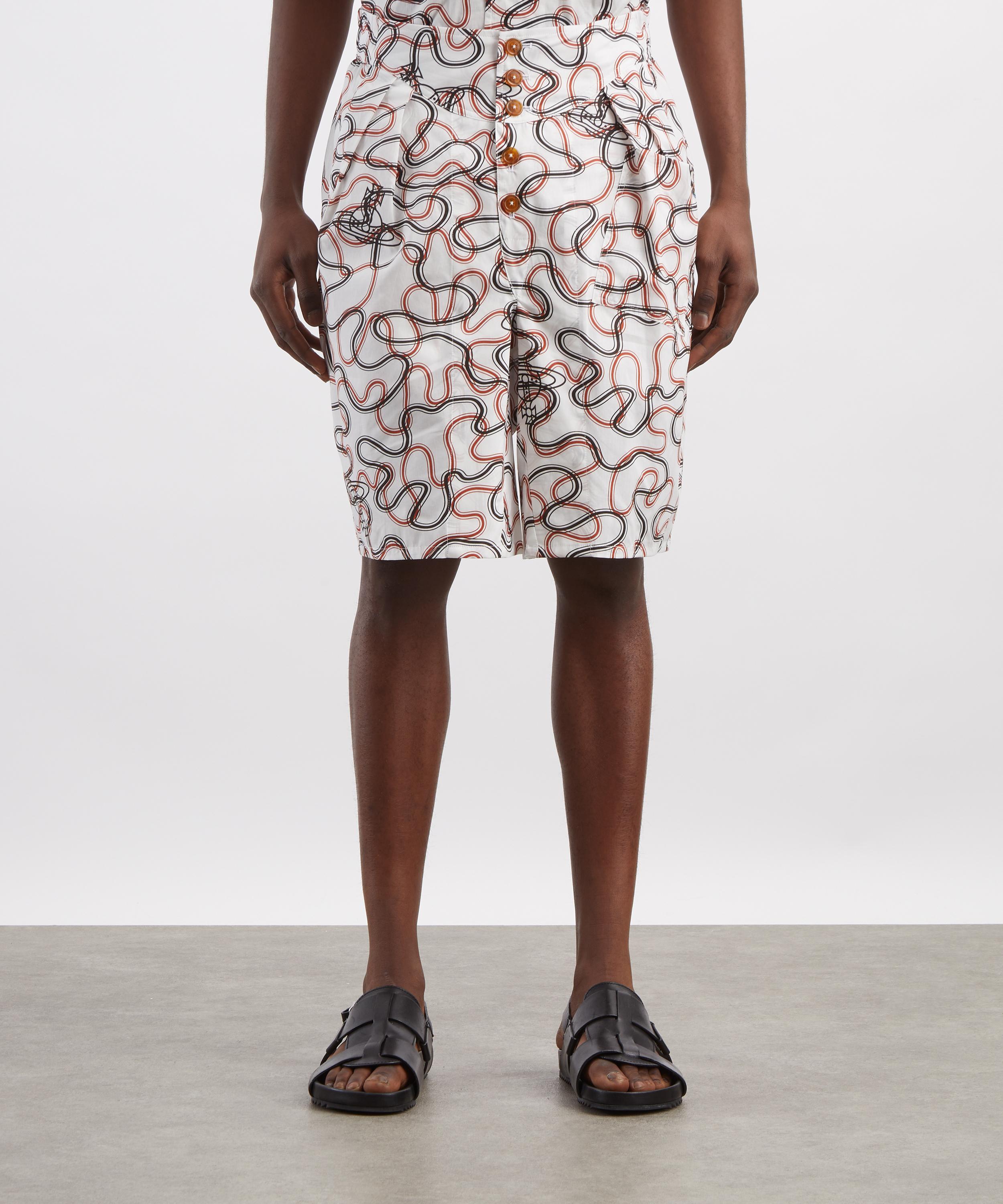 Adorned with a distinctive wiggle pattern, inspired by Vivienne Westwood’s signature ‘Squiggle’ print, these cotton shorts are cut to a relaxed, knee-length silhouette. Front pleats and a buttoned mid-rise waistband lend a subtle, tailored finish, balancing playful irreverence with refined structure.
