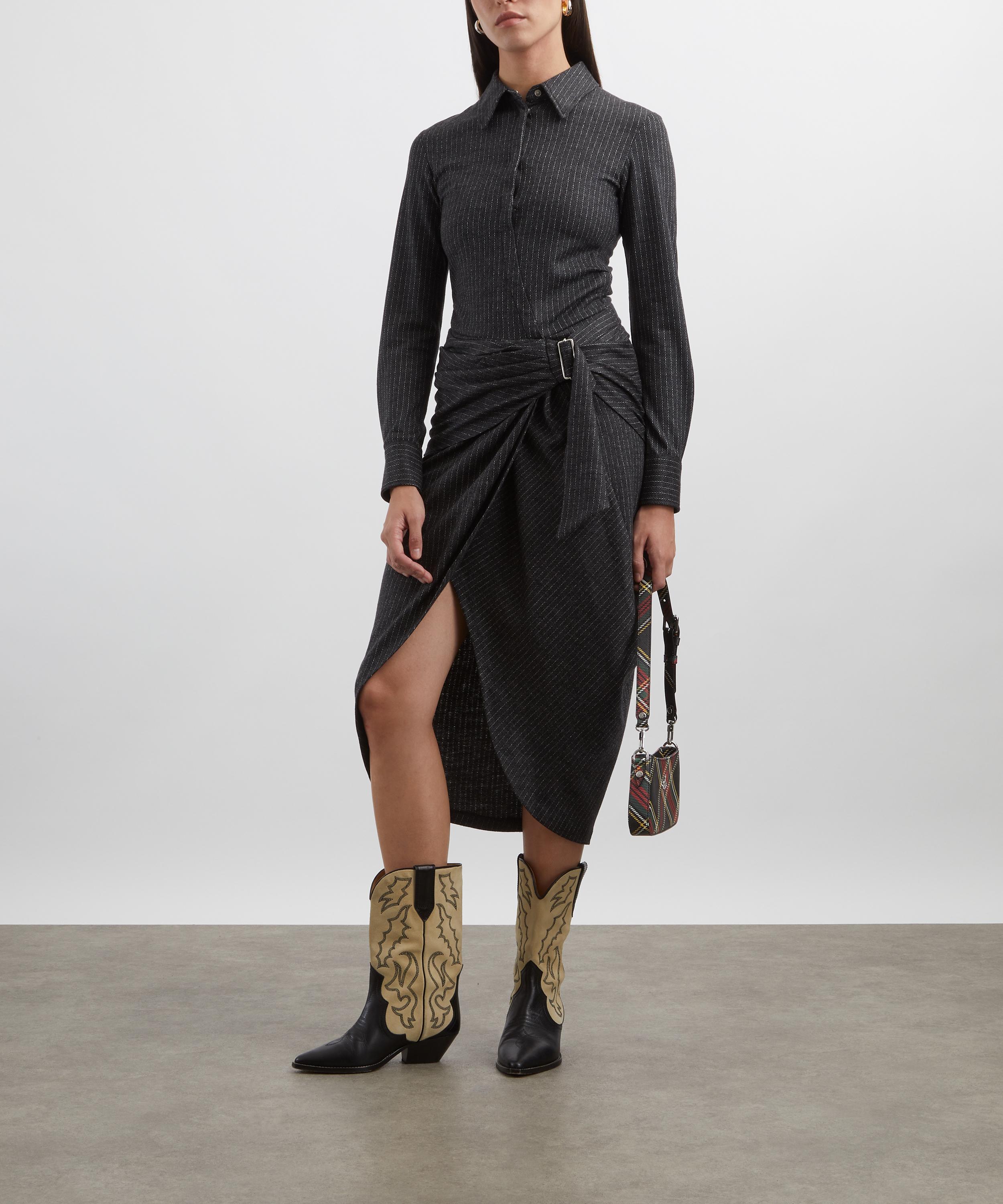 The Rosalie Draped Pinstripe Midi Dress by Isabel Marant adds a touch of effortless Parisian bohemian chic to your new-season wardrobe.