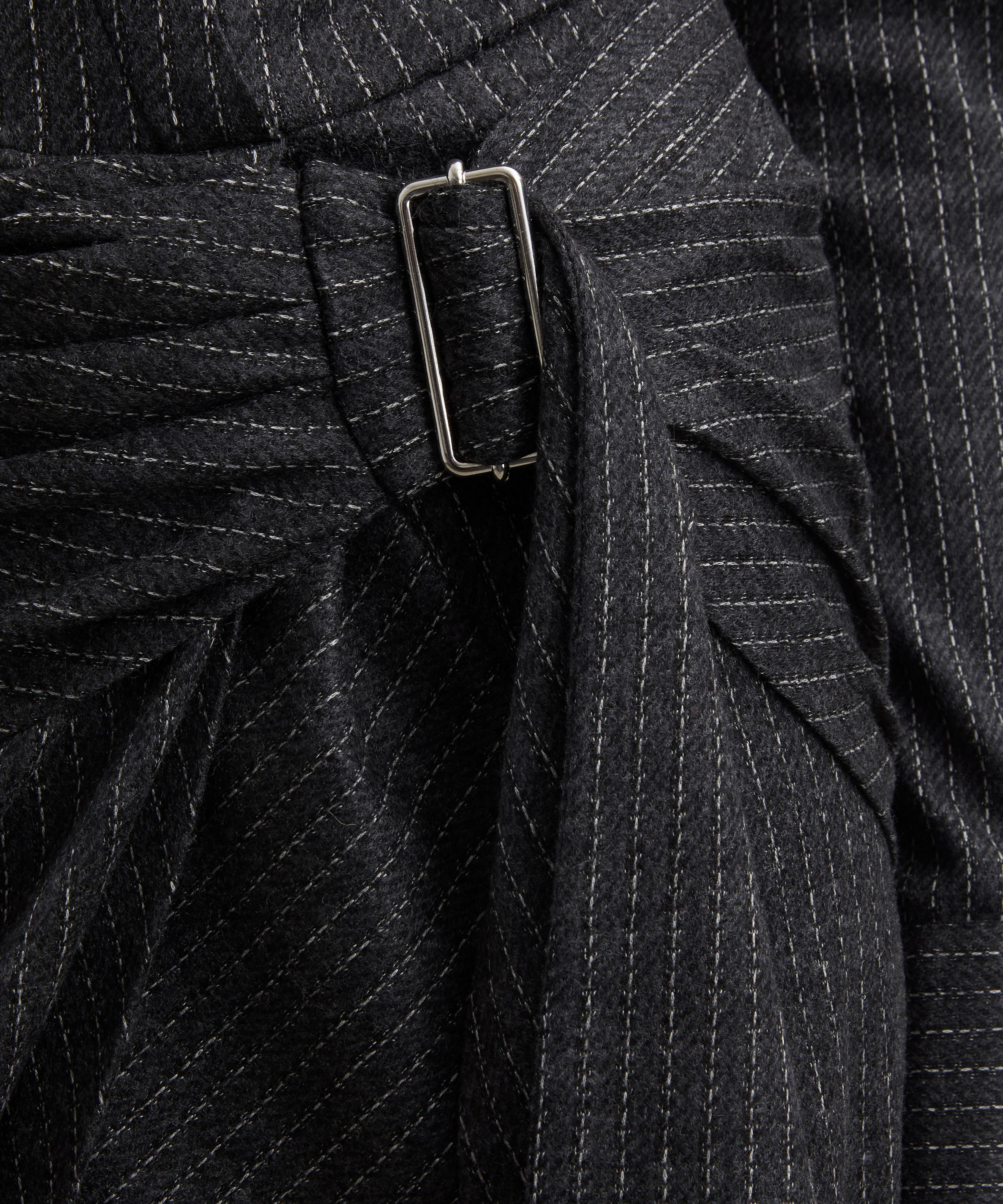 Crafted from a pinstriped wool-cotton blend, the Rosalie Shirt Dress features a classic collar, partial snap placket, and a wrap skirt that gathers at the waist for a softly draped, feminine finish.