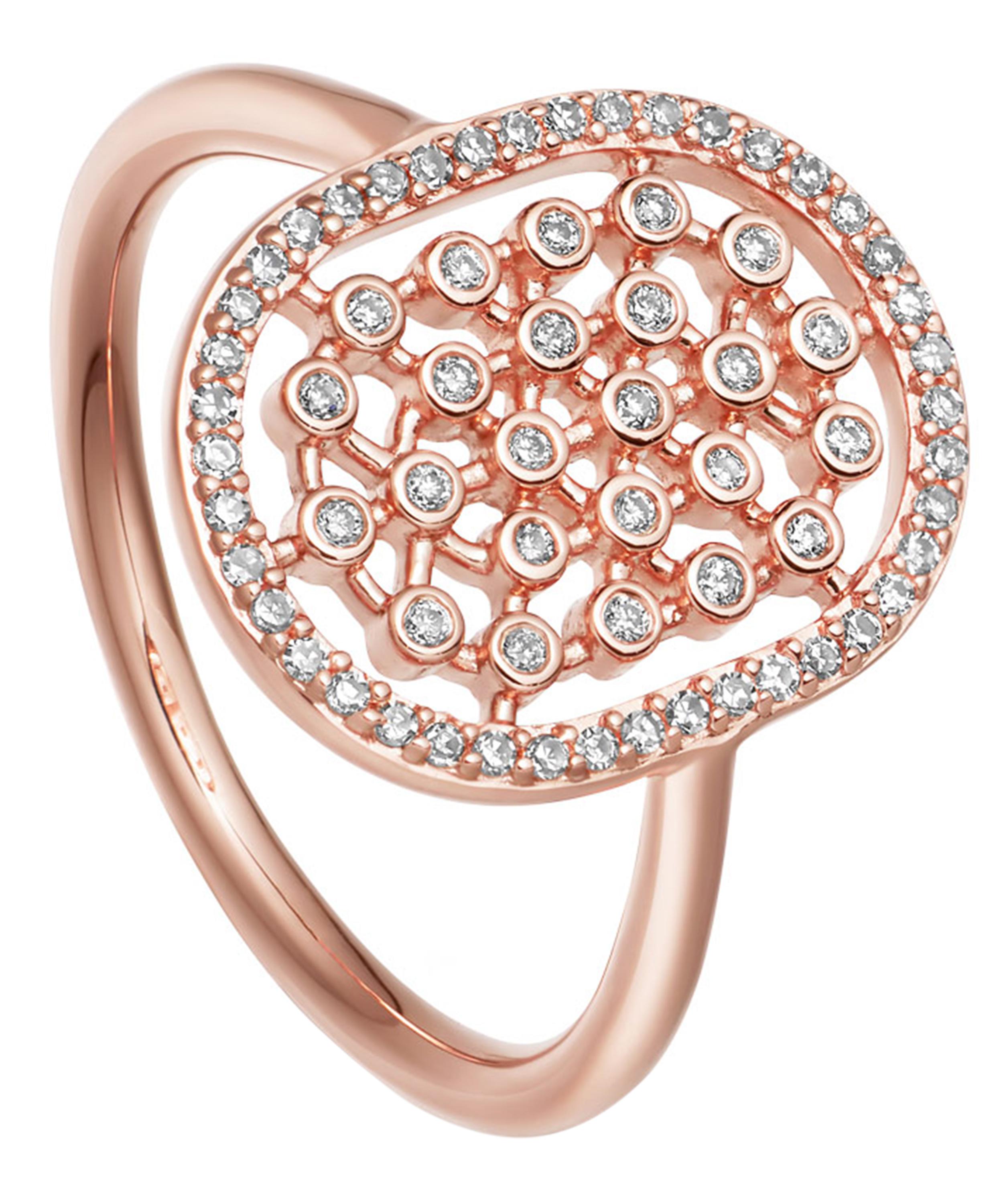 The Icon Nova diamond ring from Astley Clarke features an elaborate arrangement of brilliant- and single-cut diamonds, supported by an intricate rose gold geometric structure on a narrow, polished band.