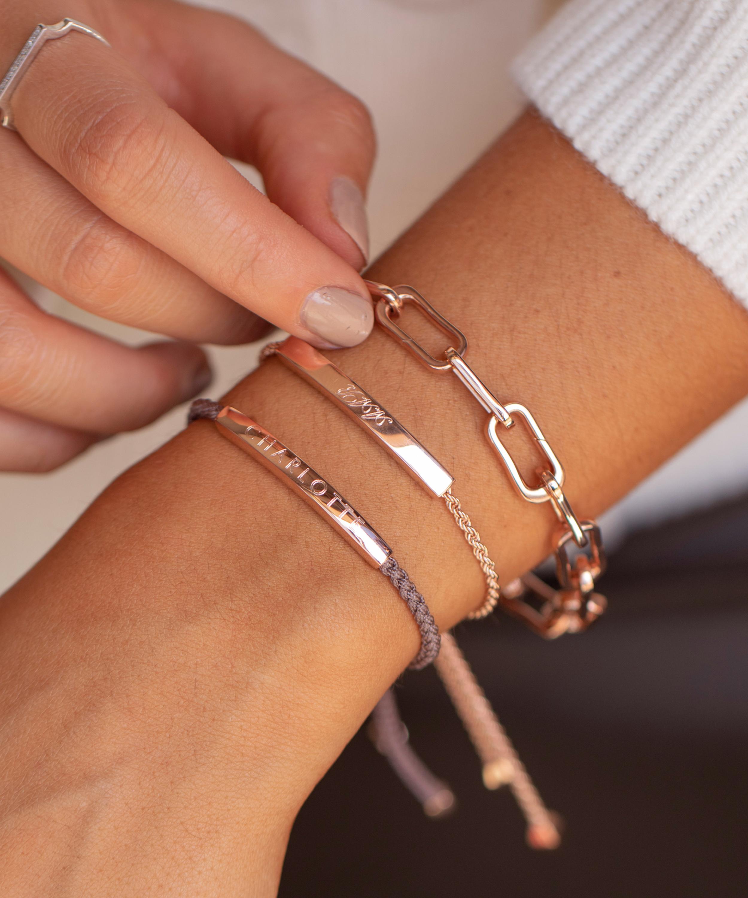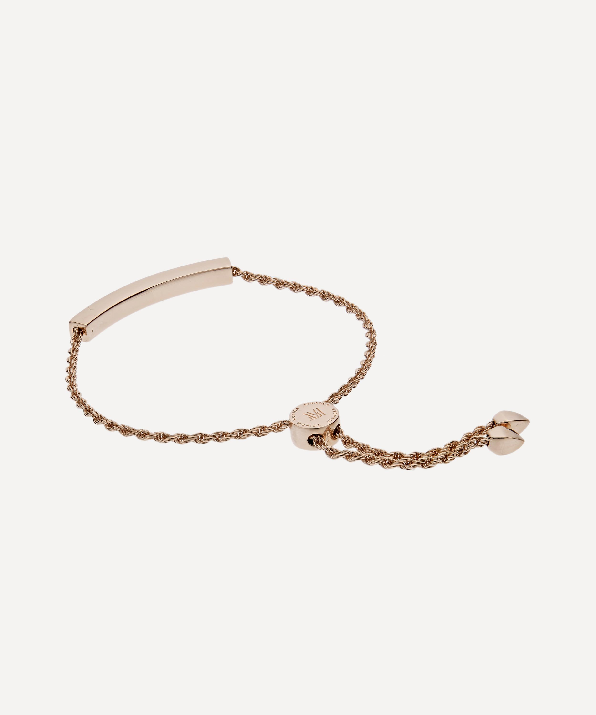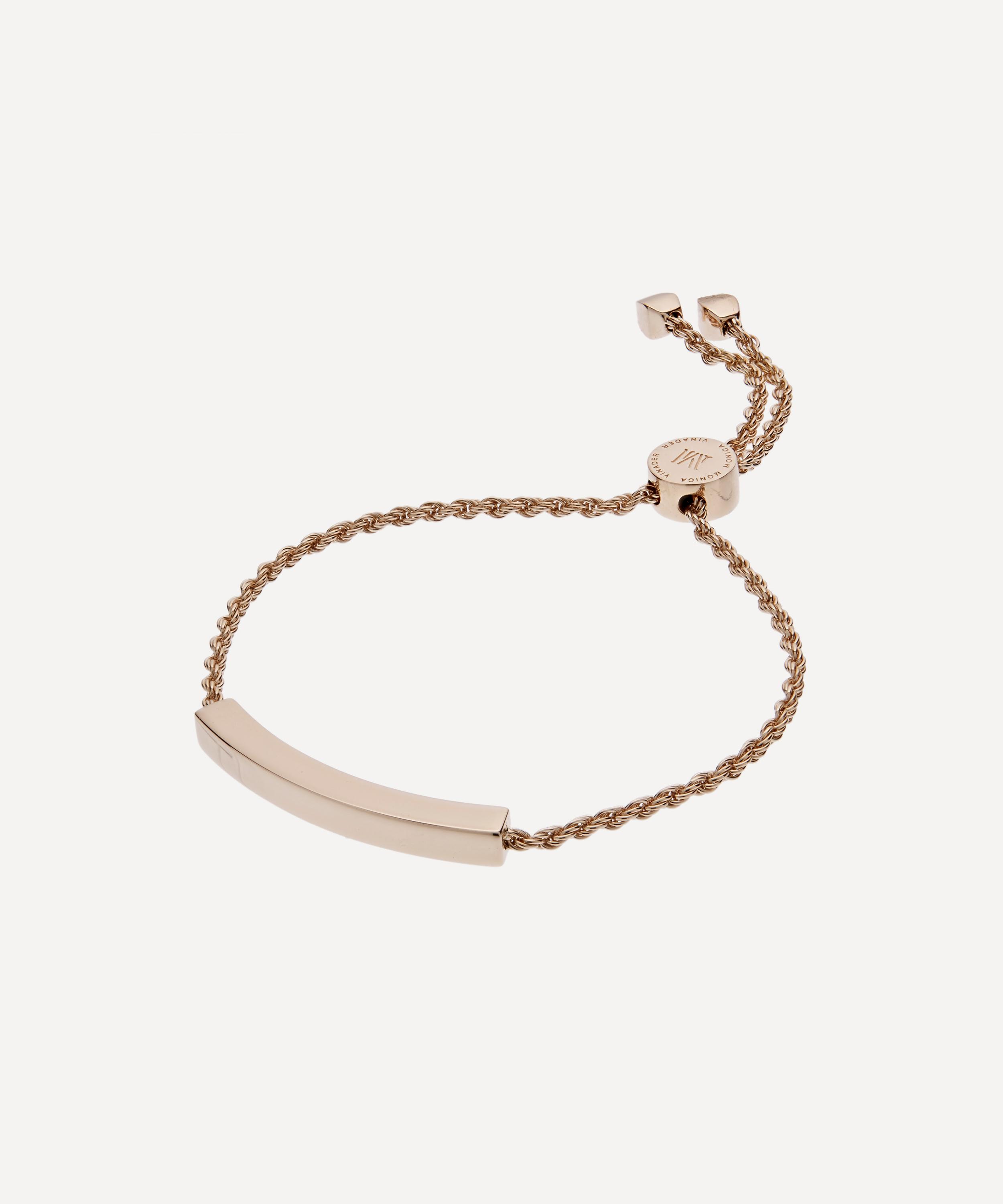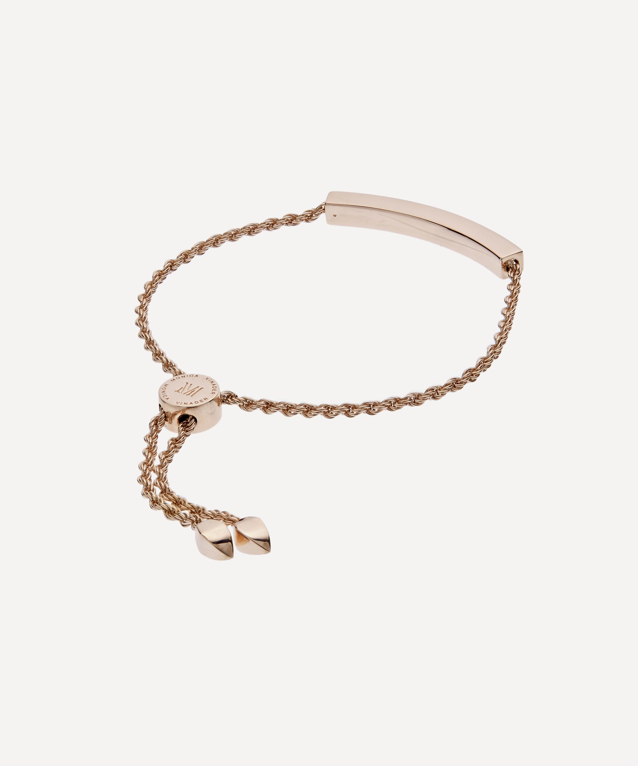 Crafted from high polished 18 carat rose gold plated vermeil silver, this piece has earned its place in the brand's iconic friendship bracelet collection, inspired by the energy and excitement of the city. It features a sleek, curved bar offset by a twisted rope chain, fastened with an adjustable toggle slider bearing the Monica Vinader logo. Wear it alone for everyday minimal elegance or stack it with other bracelets from the collection to create your own unique look. The beautiful bar feature is suitable for engraving, making this the perfect gift for a cherished loved one.