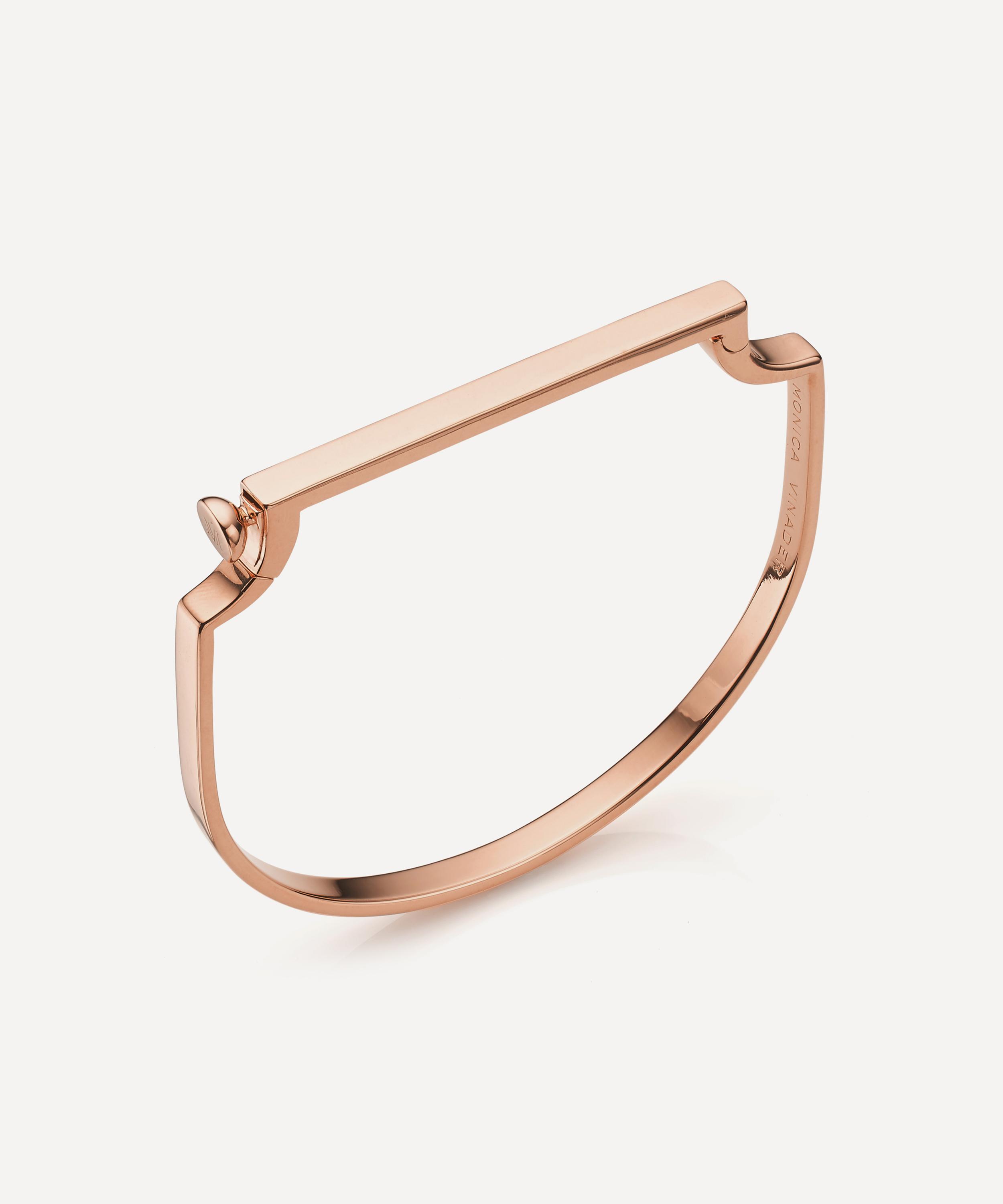 Combining strong clean lines with flowing curves, every piece from the Signature collection is imbued with modernity and femininity. Crafted from high-polished 18 carat rose gold plated vermeil silver, this thin bangle is beautifully simple whether worn alone or stacked with others from the collection. It slips on and off with ease while maintaining a snug fit thanks to the hinged bar feature and snap fastening. The slender bar is also suitable for engraving, making it the perfect gift for a friend or loved one.