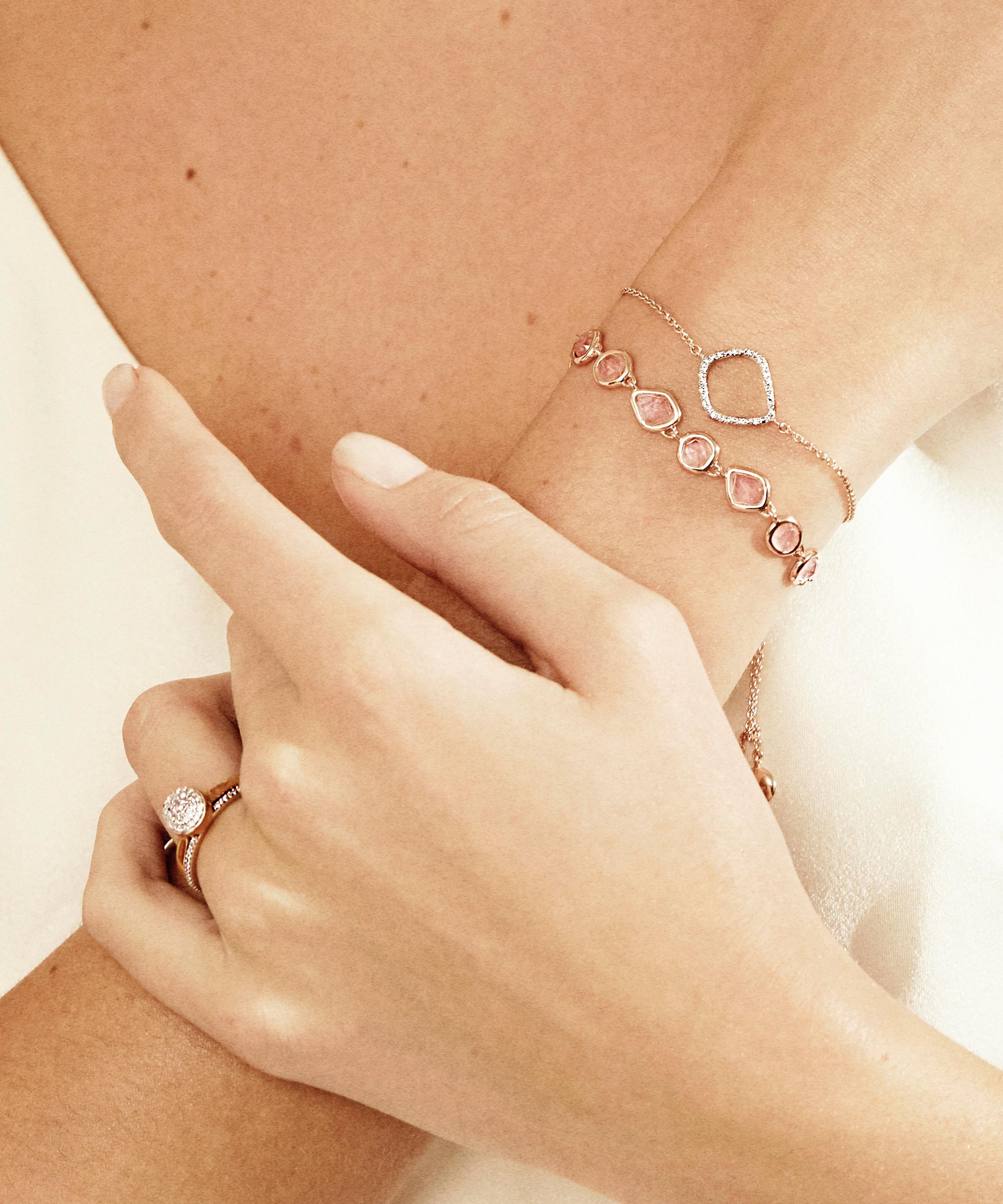 This elegant bracelet features a string of eight mini rose quartz nuggets with organic, irregular shapes reminiscent of pebbles found on the seashore. Strung onto a fine 18 carat rose gold plated vermeil silver trace chain, the stones are presented in polished bezel settings designed to fit their unique shapes. Wear this piece alone for show-stopping simplicity or style it as part of an elegant curation of stacked bracelets, cuffs and bangles.
