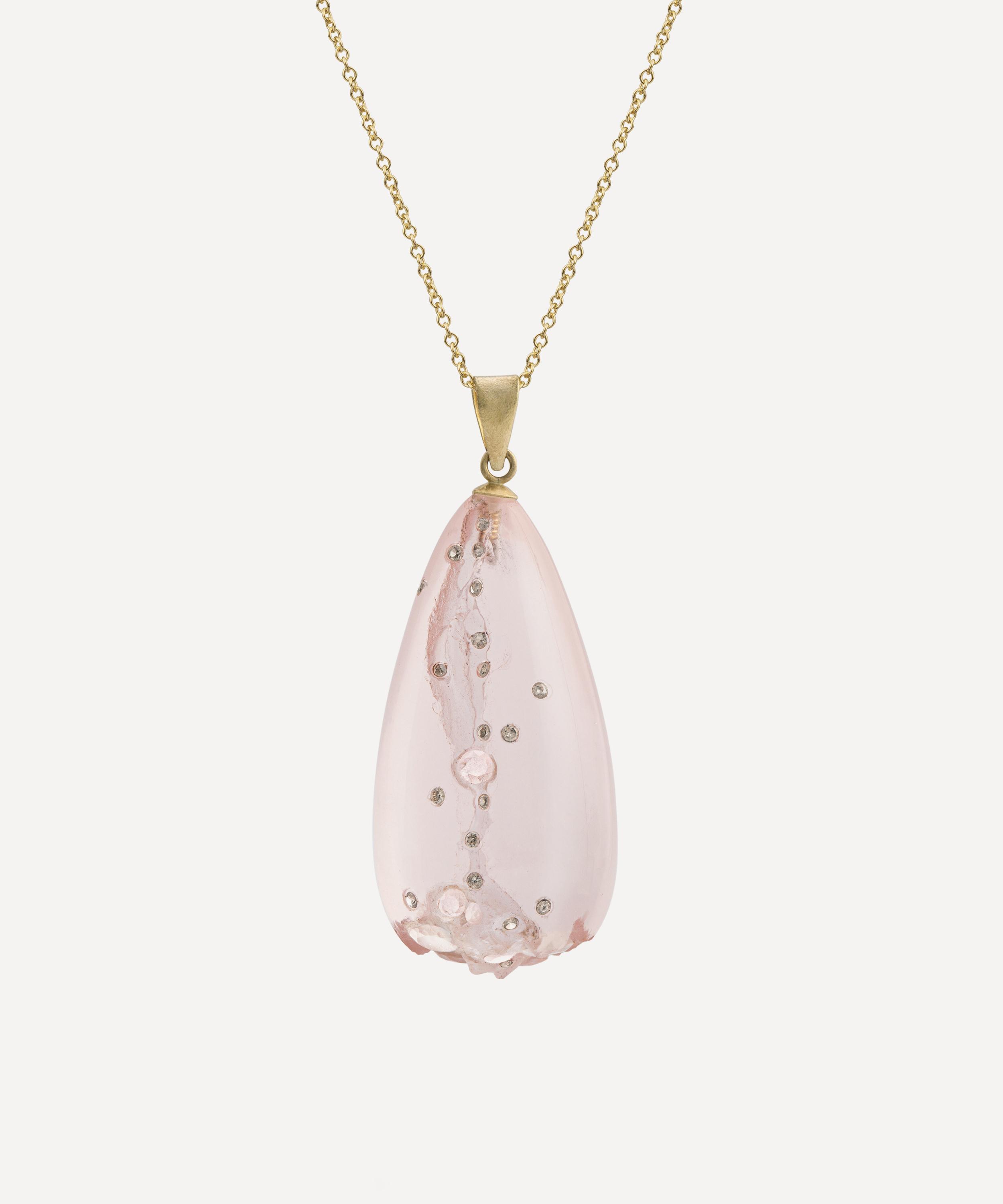 Intricately hand-carved in the brand’s British atelier from rose quartz with a 14ct gold chain, it is embedded with faceted gemstones and scattered with brilliant cut champagne diamonds in its crevices. Offering endless styling options, it can be worn as a statement solo piece or with matching earrings from the collection.