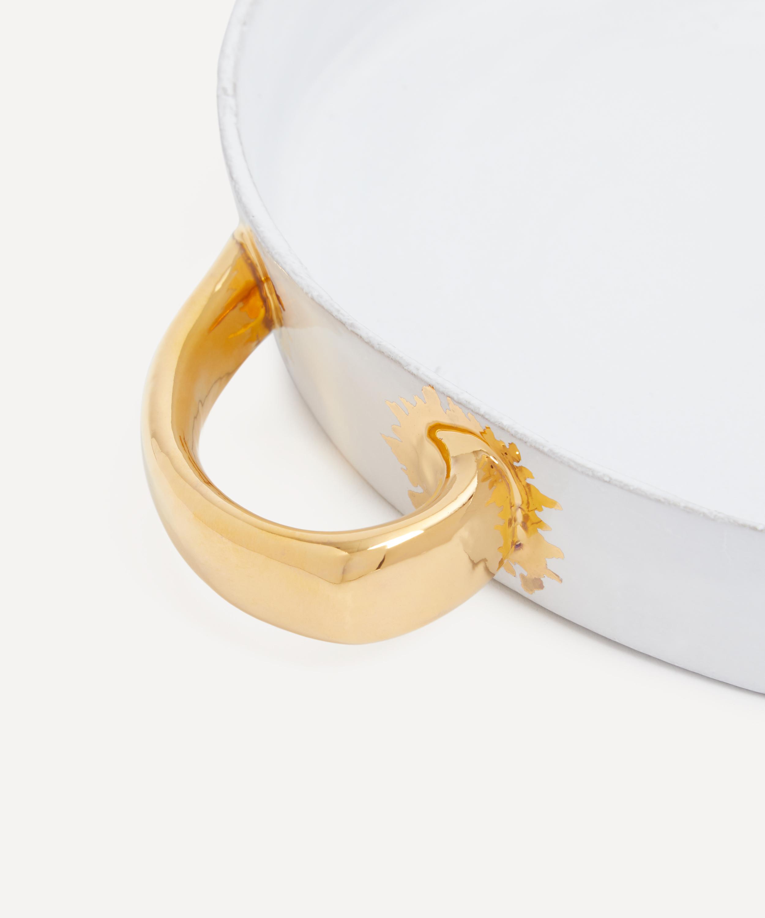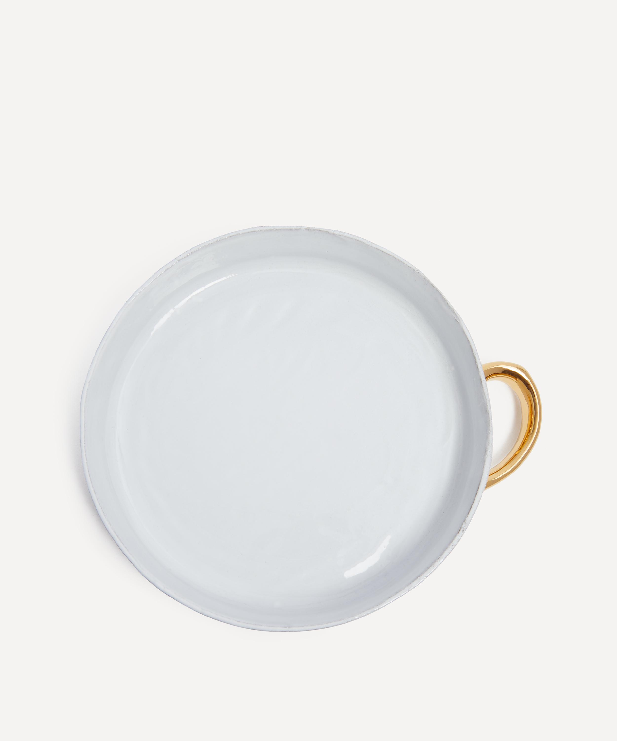 Votary of pre-industrial fabrication, Astier de Villatte is celebrated for being the one and only studio in Paris to hold and harbour the traditions of artisanal ceramic production. Restoring the ancestral systems of moulding and stamping, the Tuileries cup is made using techniques from the Middle Ages which involve moulding a sheet of handmade clay, double firing the ‘biscuit’ piece and glazing the product in white enamel – a lengthy process that requires a drying time of up to one month. Characterised by exposed clay and a gold-toned handle, the cup is engraved with the brand’s signature crest - depicting an interlacing A & V - alongside the initials of one of the 40 master artisans who created it. Each handmade piece tells a beautiful story, it romances and imparts a sense of nostalgia into its owner. Arrange with other serveware in the collection to breathe an air of authenticity into your afternoon tea setting.