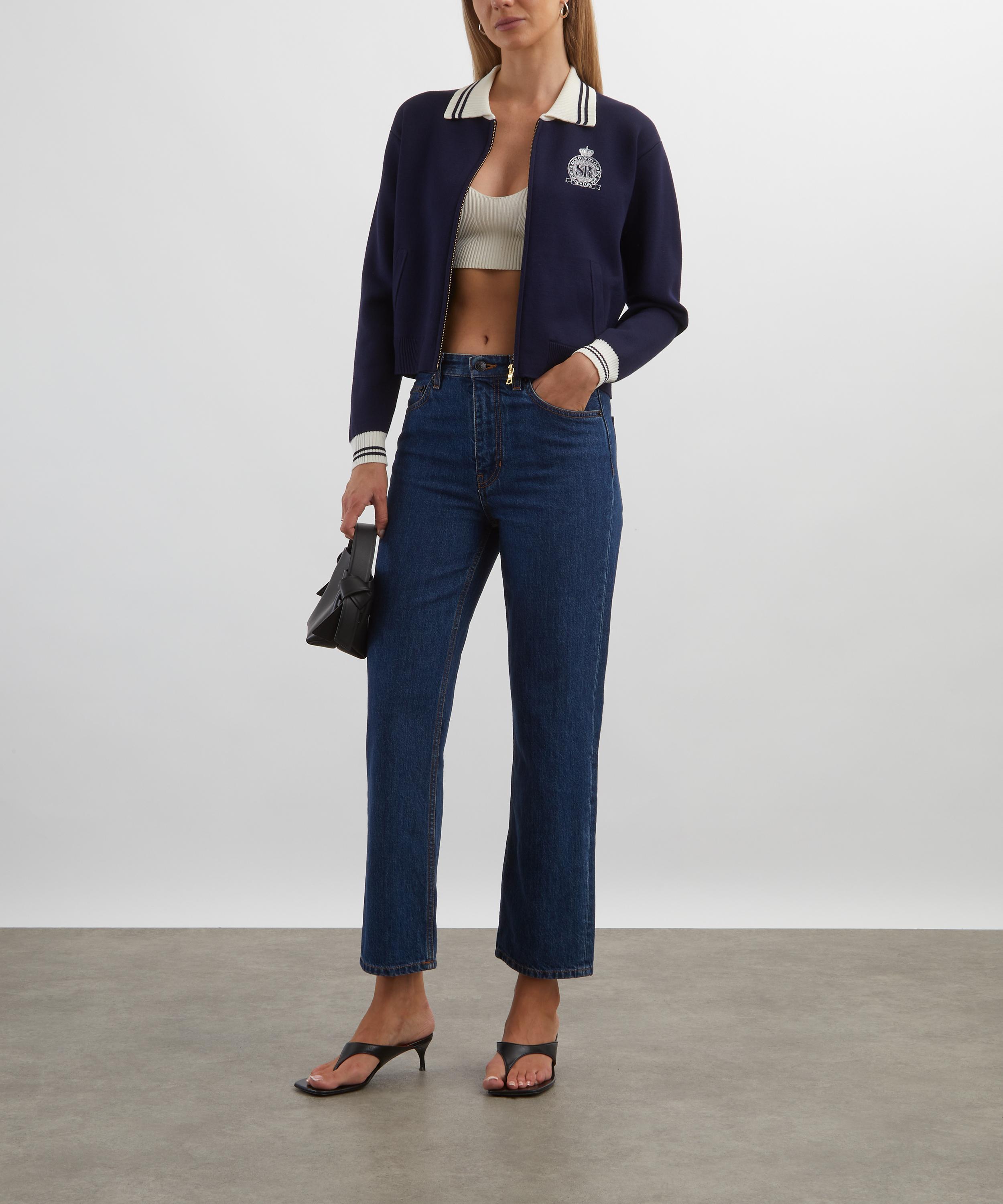 Crafted from a soft, breathable yarn, this navy cardigan features a rib-knit spread collar, zip fastening, contrast cuffs, and an embroidered chest logo - blending comfort with subtle luxury.